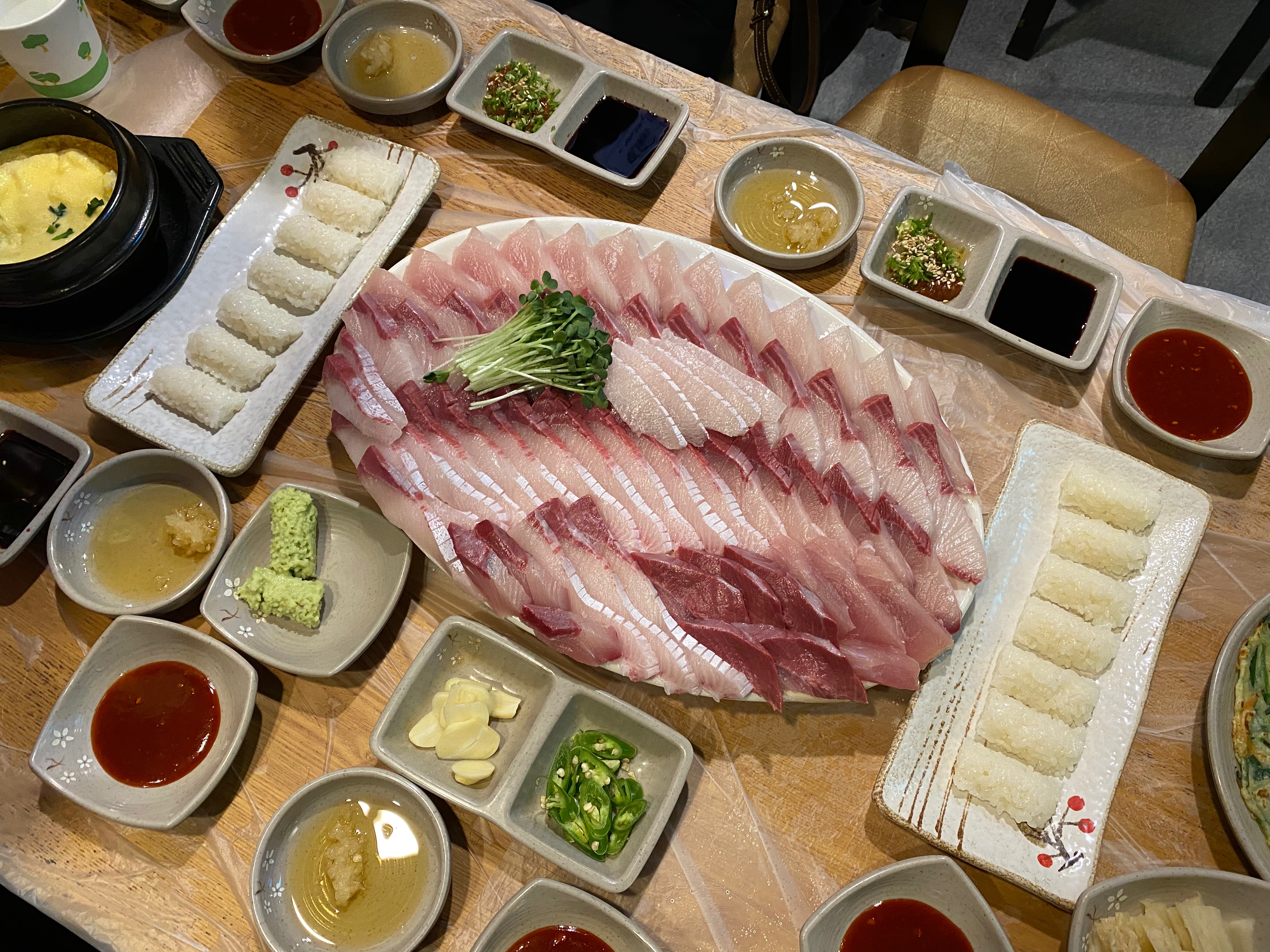 테이블을 꽉 채우는 인원이라 대방어 큰 사이즈로 주문했다.
