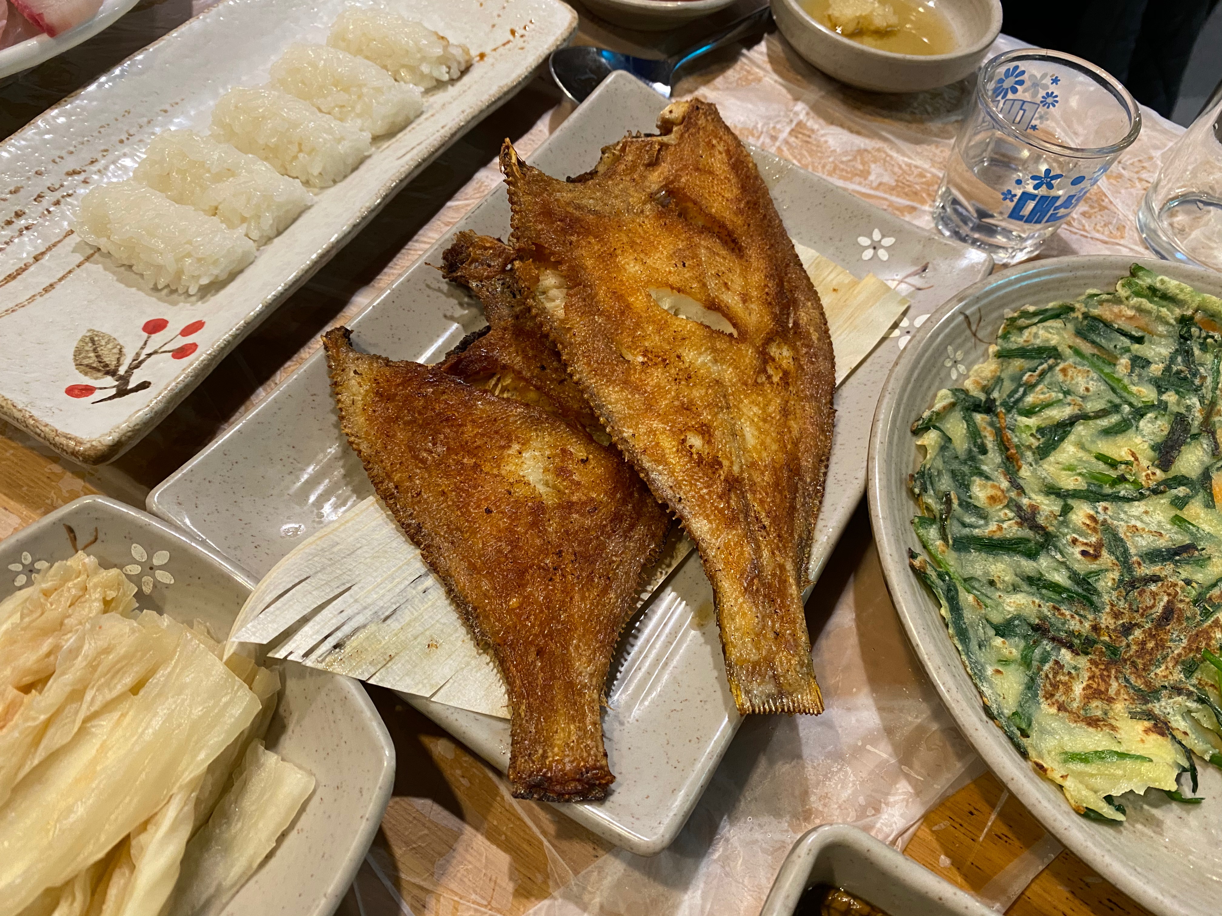 바싹하게 구운 가자미구이도 두 마리 나오고.