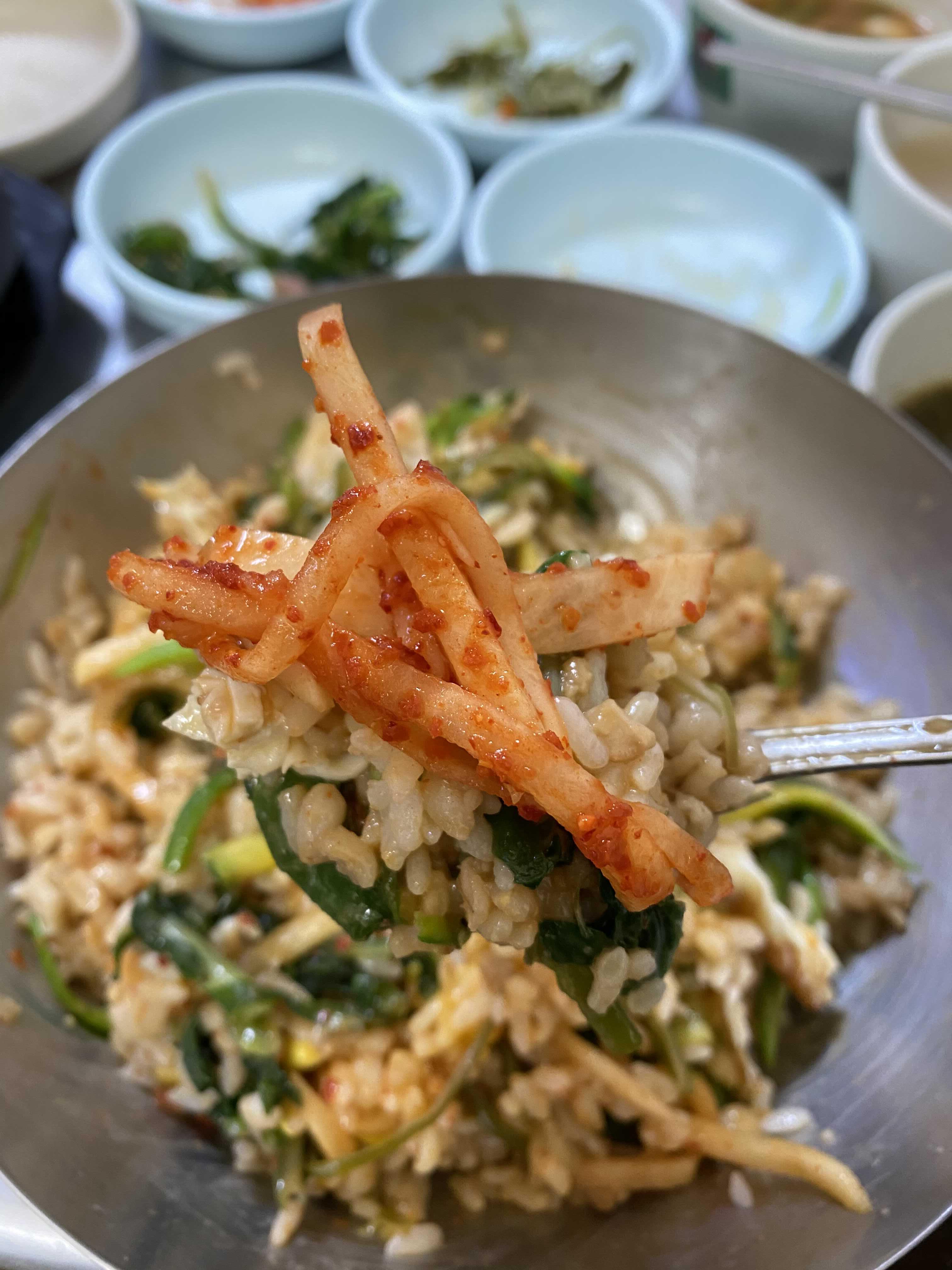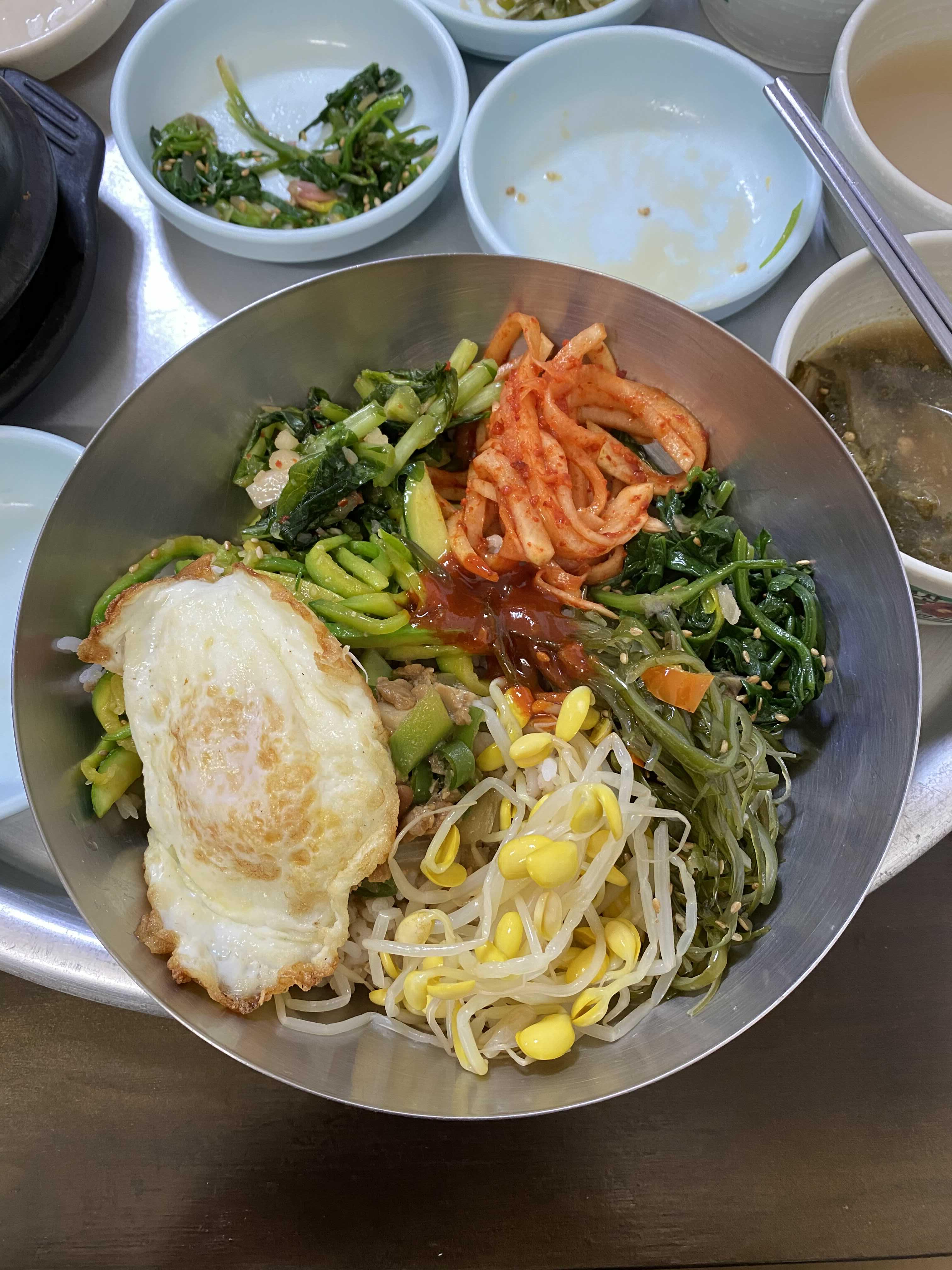 콩나물, 무생채무침, 미역, 시금치, 애호박, 열무김치. 나물의 간이 슴슴해서 비벼먹기 딱 좋다.