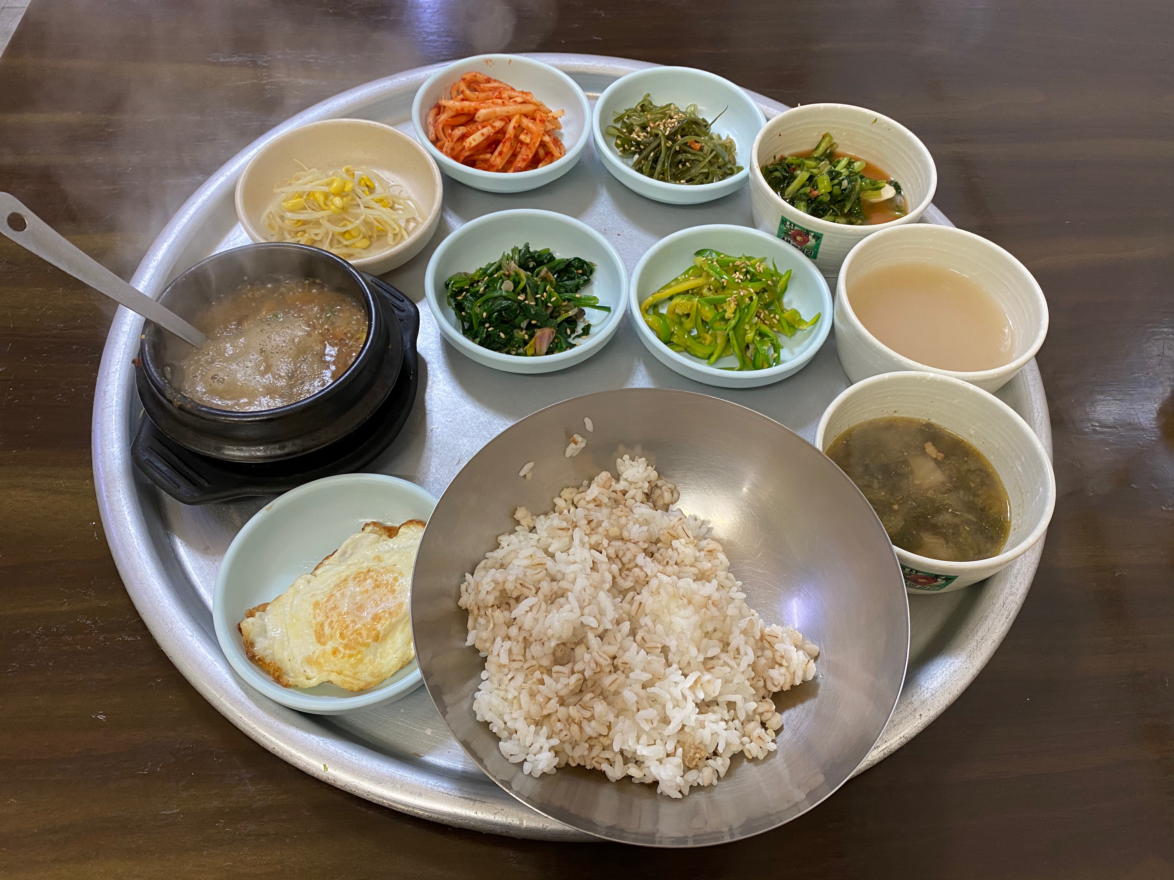 메뉴는 보리밥 단일메뉴. 뽀글뽀글 끓고 있는 된장찌개와 함께 밥은 쌀과 보리가 반반 섞였고, 나물은 5가지, 열무김치와 시락국, 계란후라이가 쟁반에 담겼다.