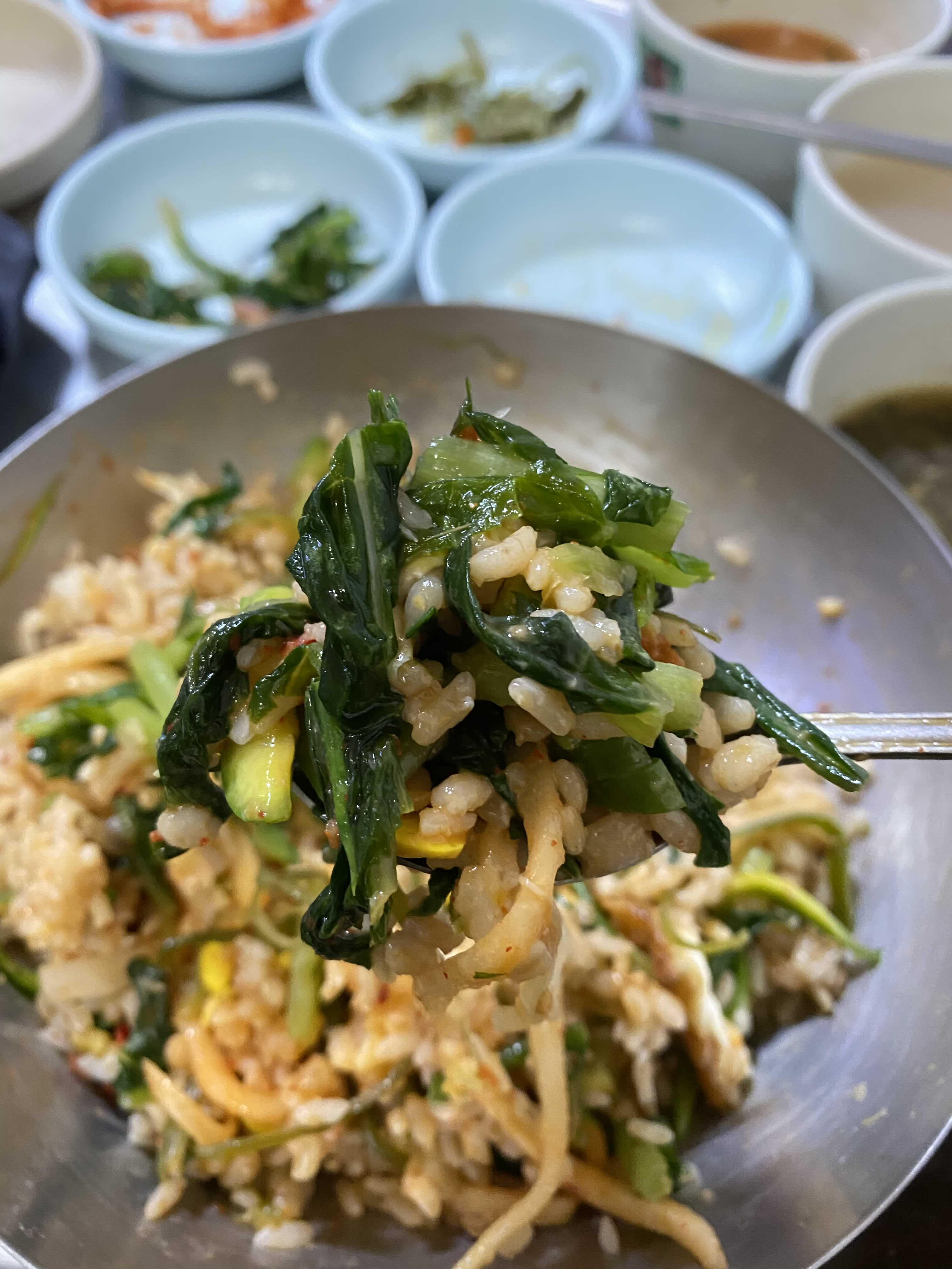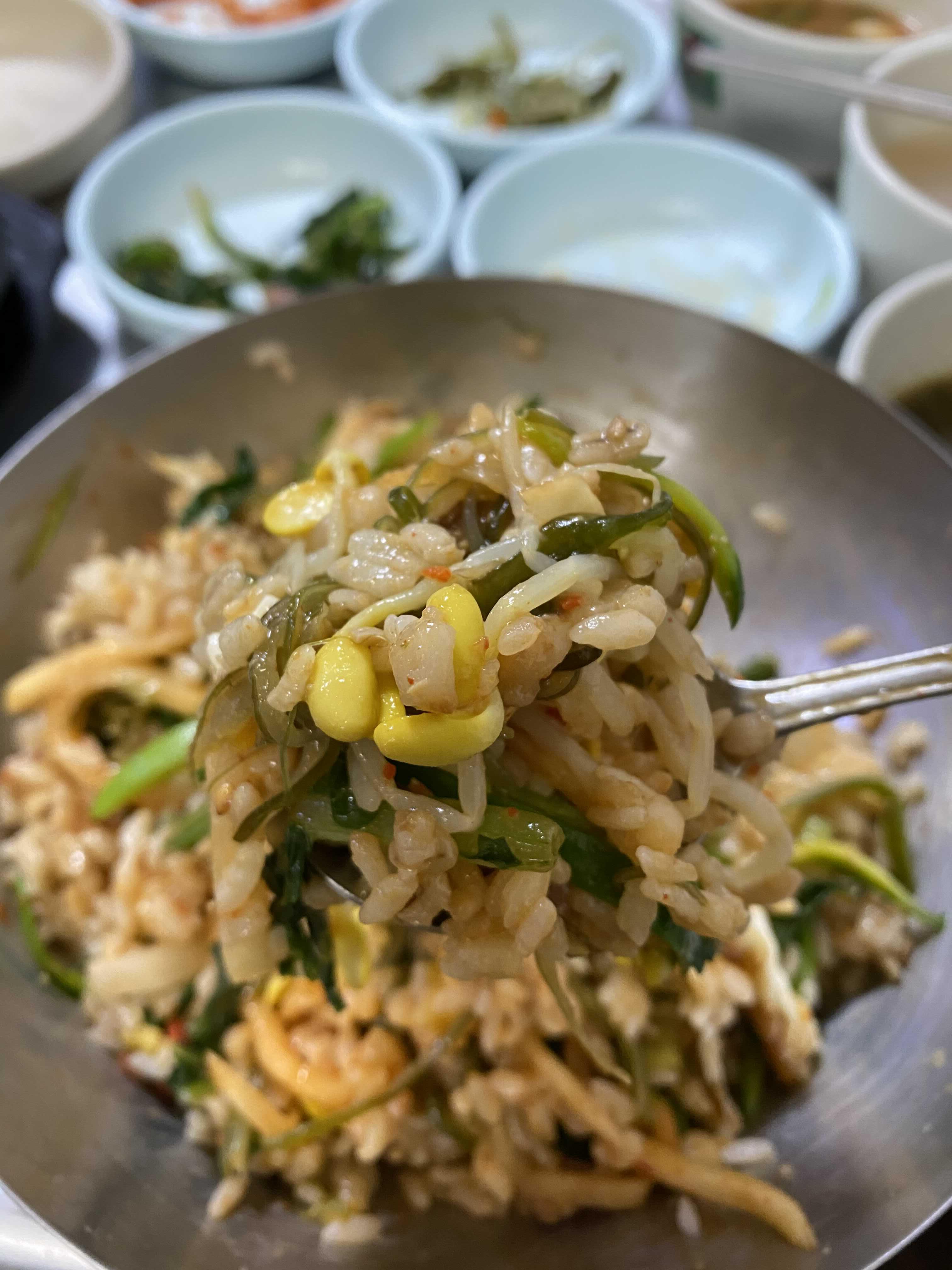 콩나물, 무생채무침, 미역, 시금치, 애호박, 열무김치. 나물의 간이 슴슴해서 비벼먹기 딱 좋다.
