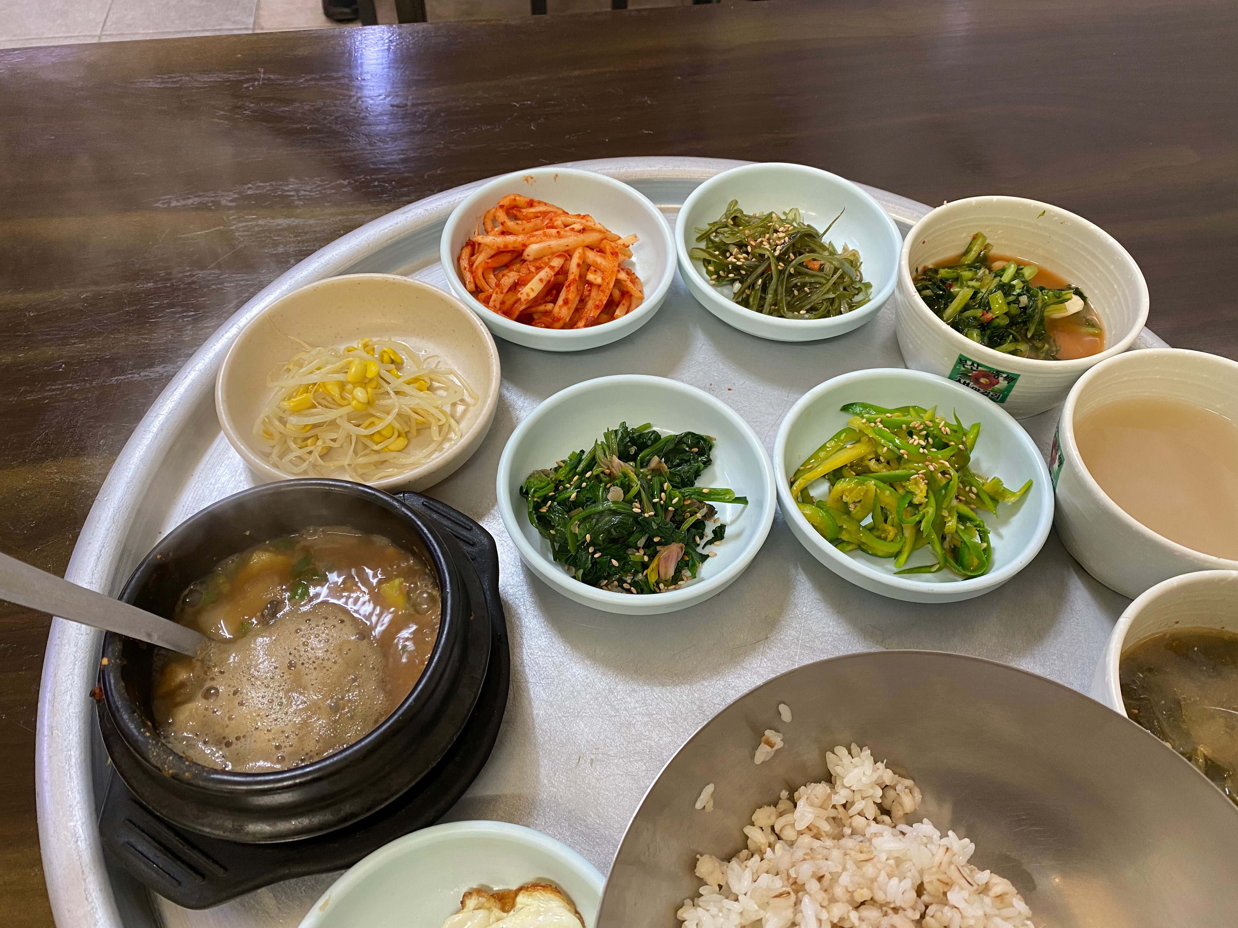 메뉴는 보리밥 단일메뉴. 뽀글뽀글 끓고 있는 된장찌개와 함께 밥은 쌀과 보리가 반반 섞였고, 나물은 5가지, 열무김치와 시락국, 계란후라이가 쟁반에 담겼다.