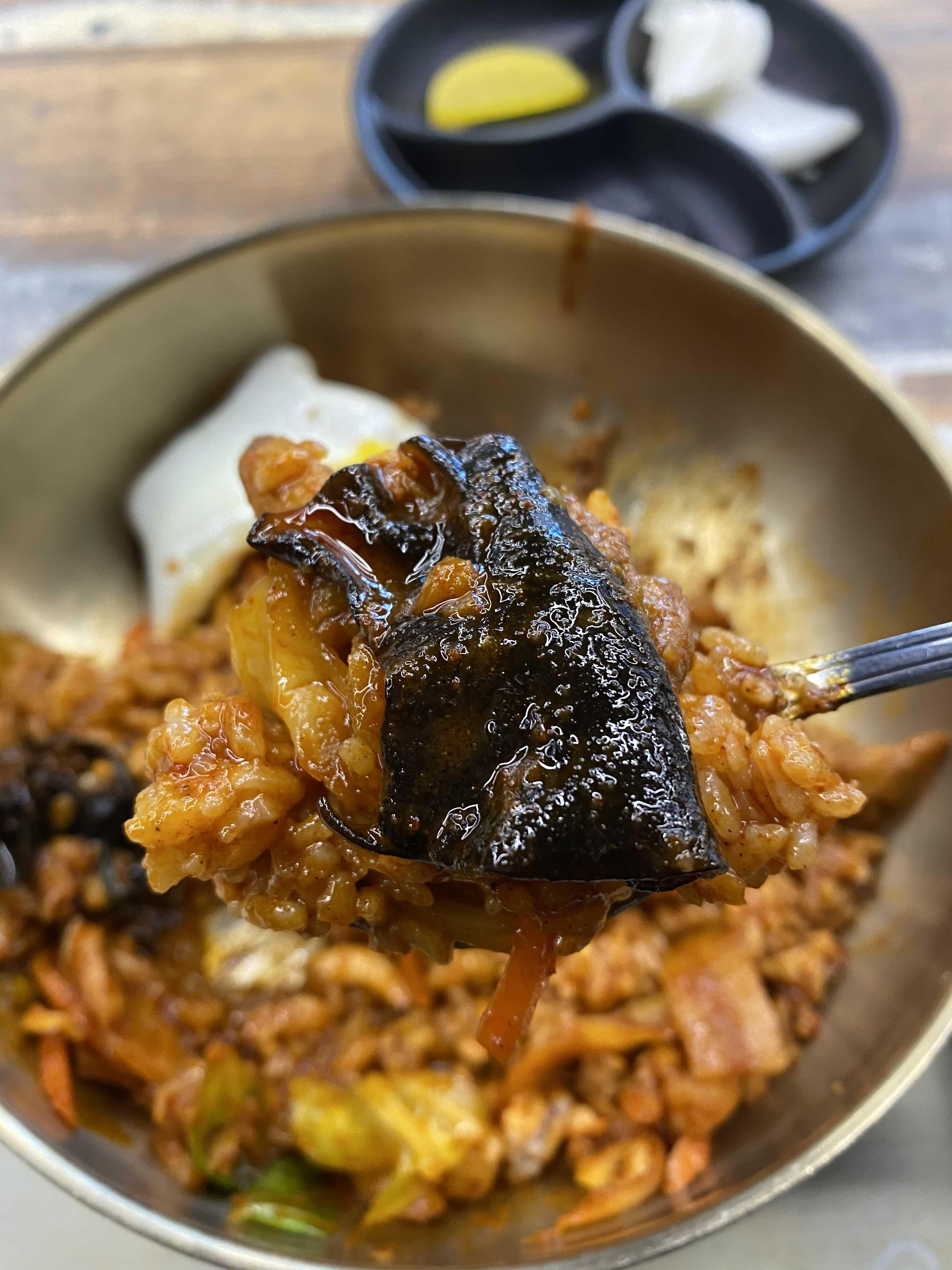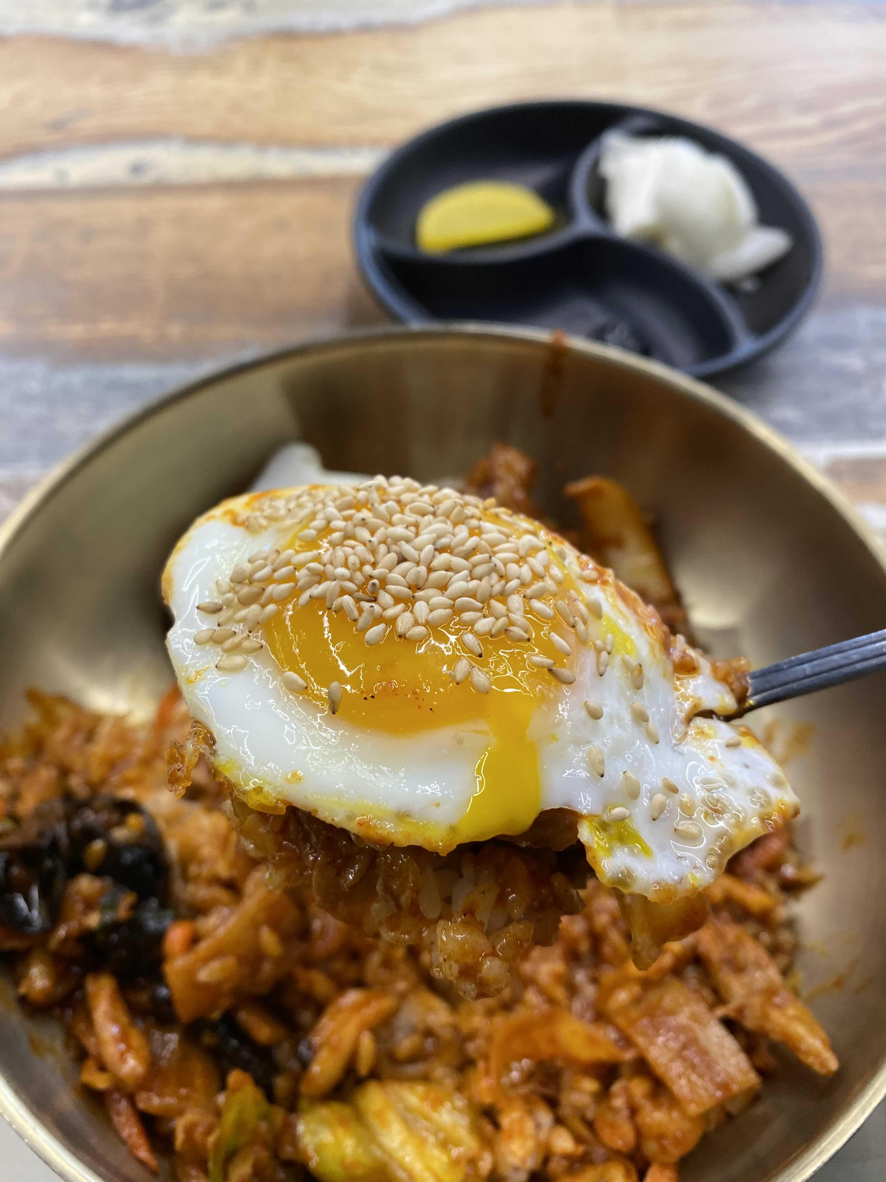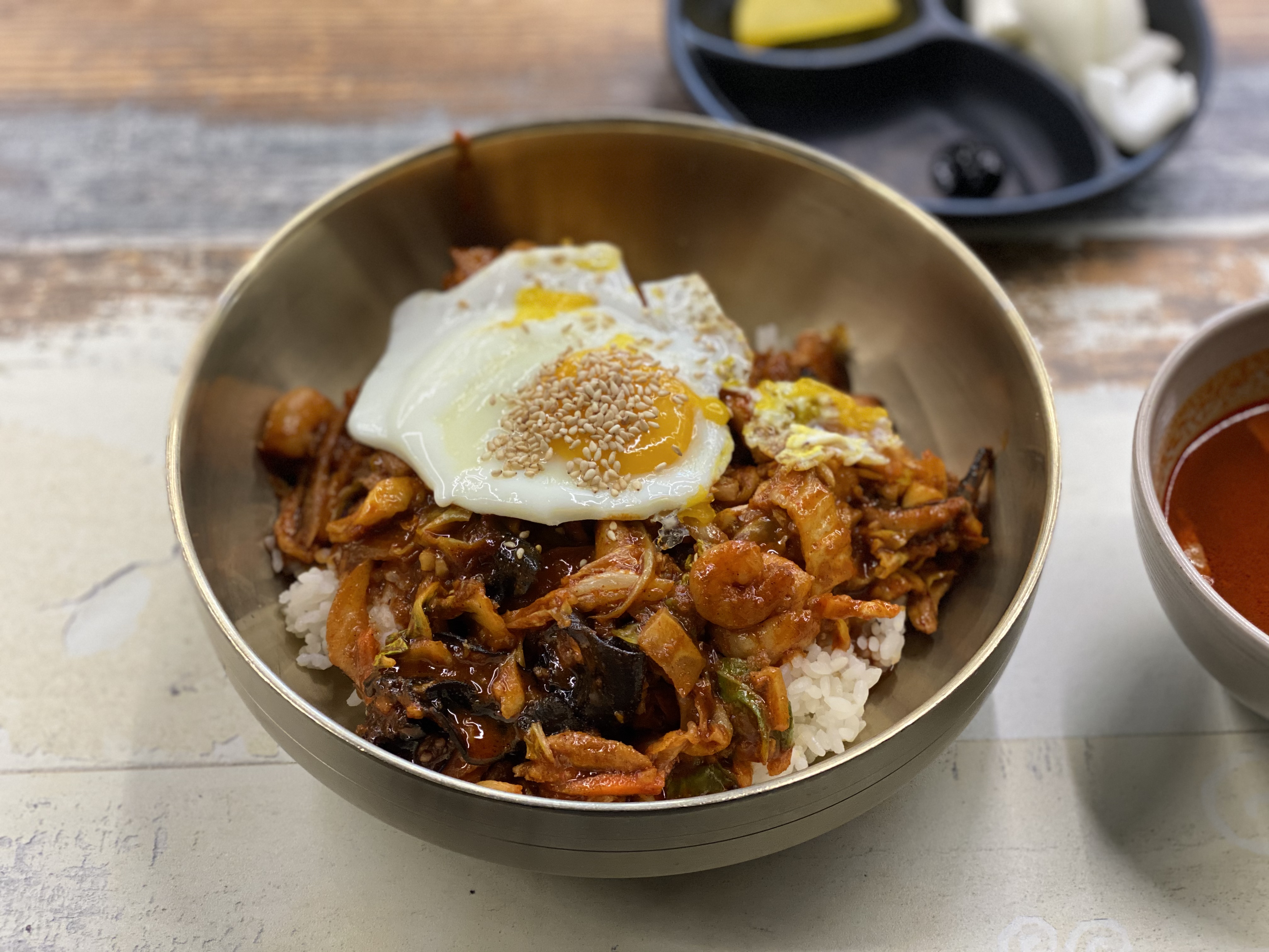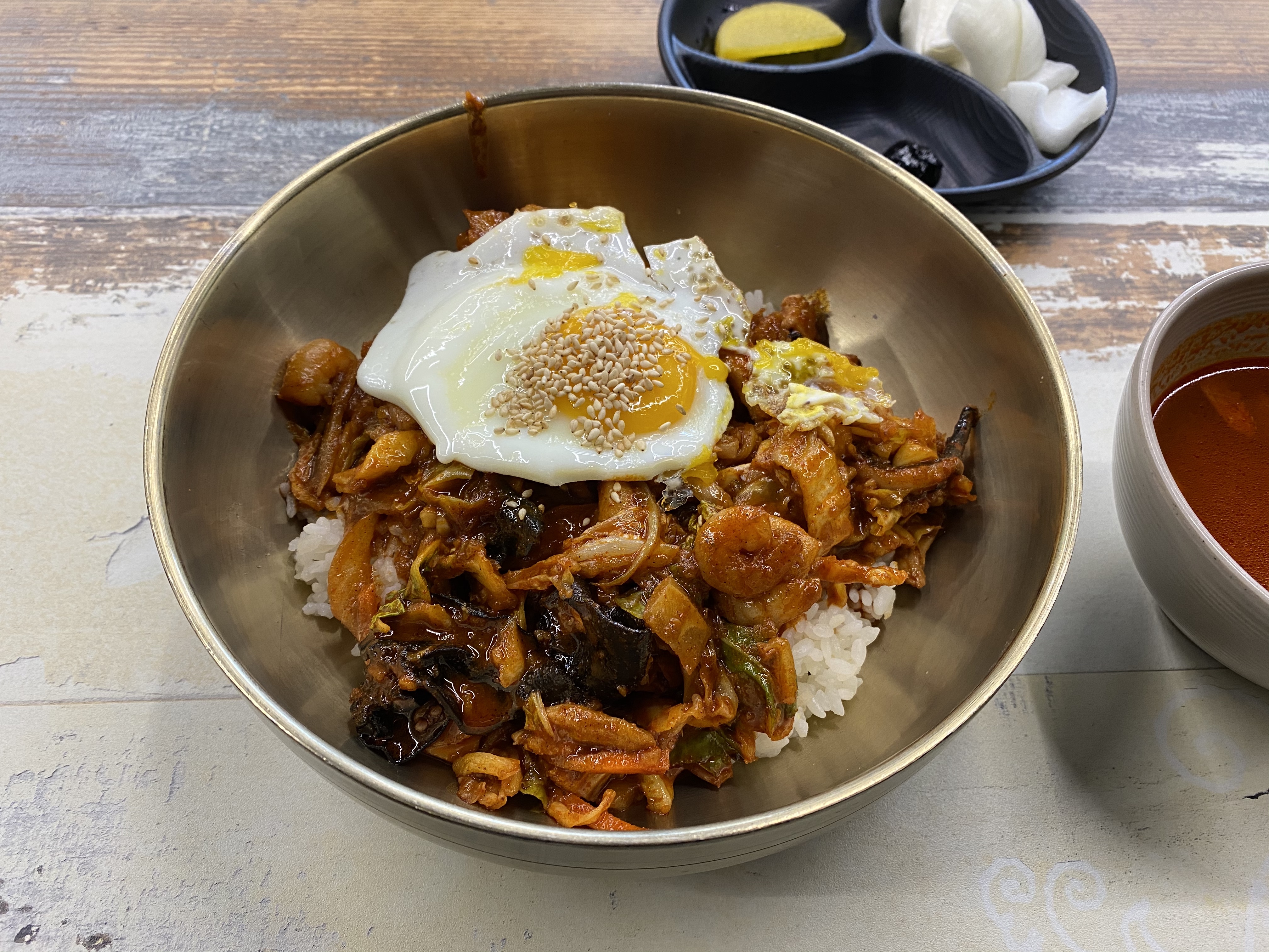 양파와 단무지를 셀프코너에서 담아 자리에 앉으니 주문한 중화비빔밥이 금방 나온다. 밥 위에 고기와 새우, 야채를 볶아 담고, 계란 후라이를 올린 뒤 깨를 뿌렸다.