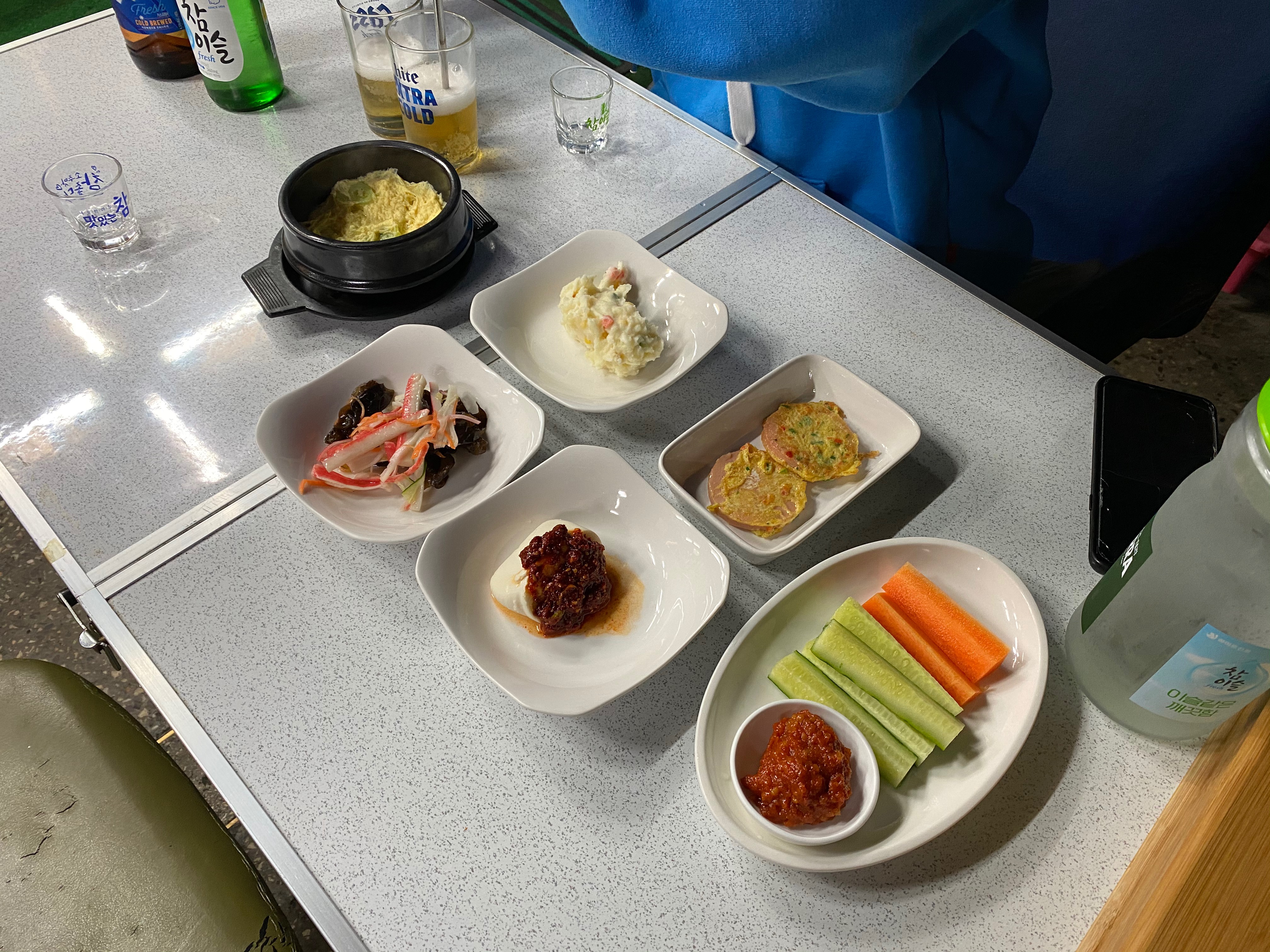맛살무침, 감자샐러드, 동그랑땡, 순두부, 계란찜, 오이랑 당근.