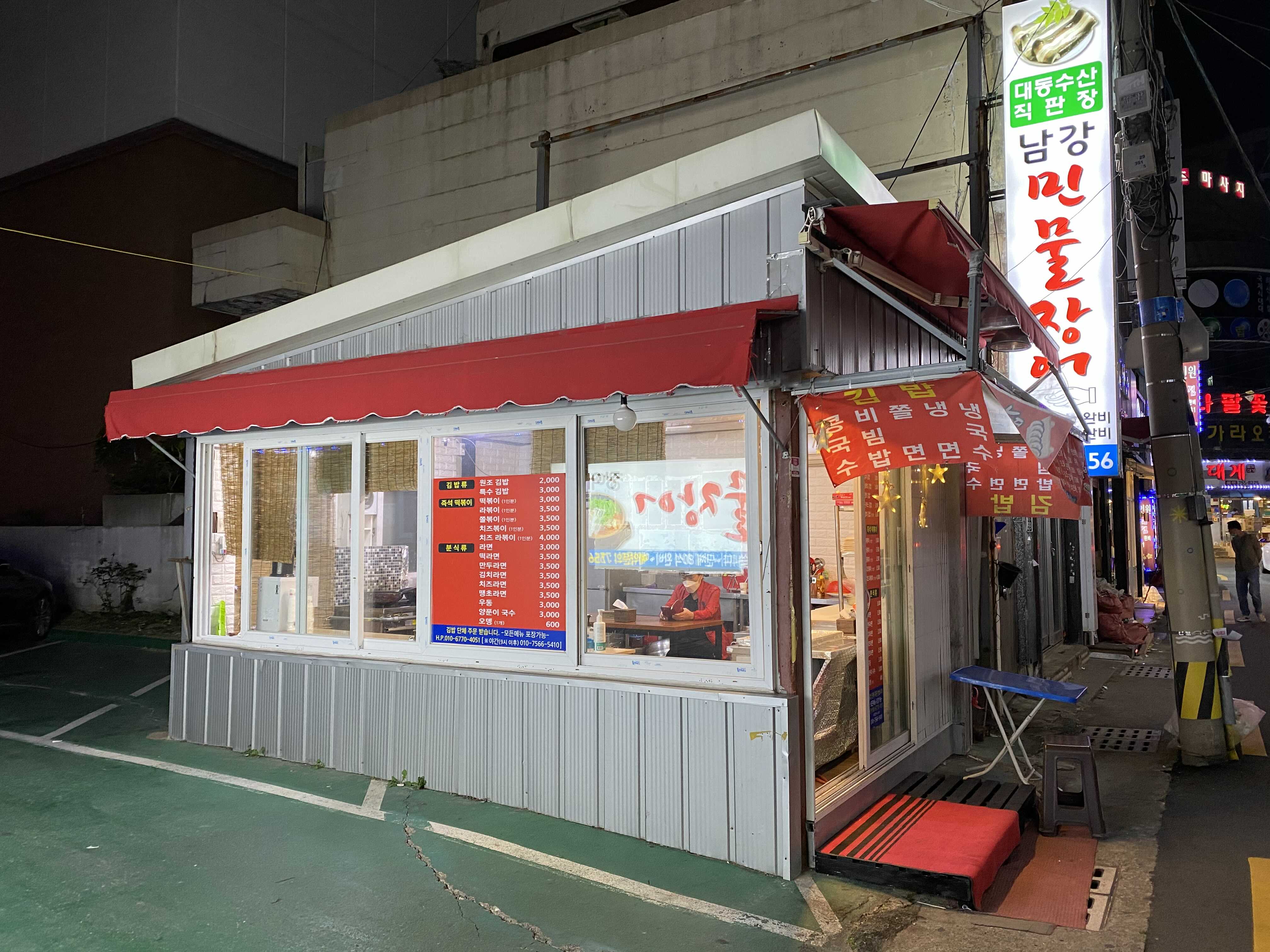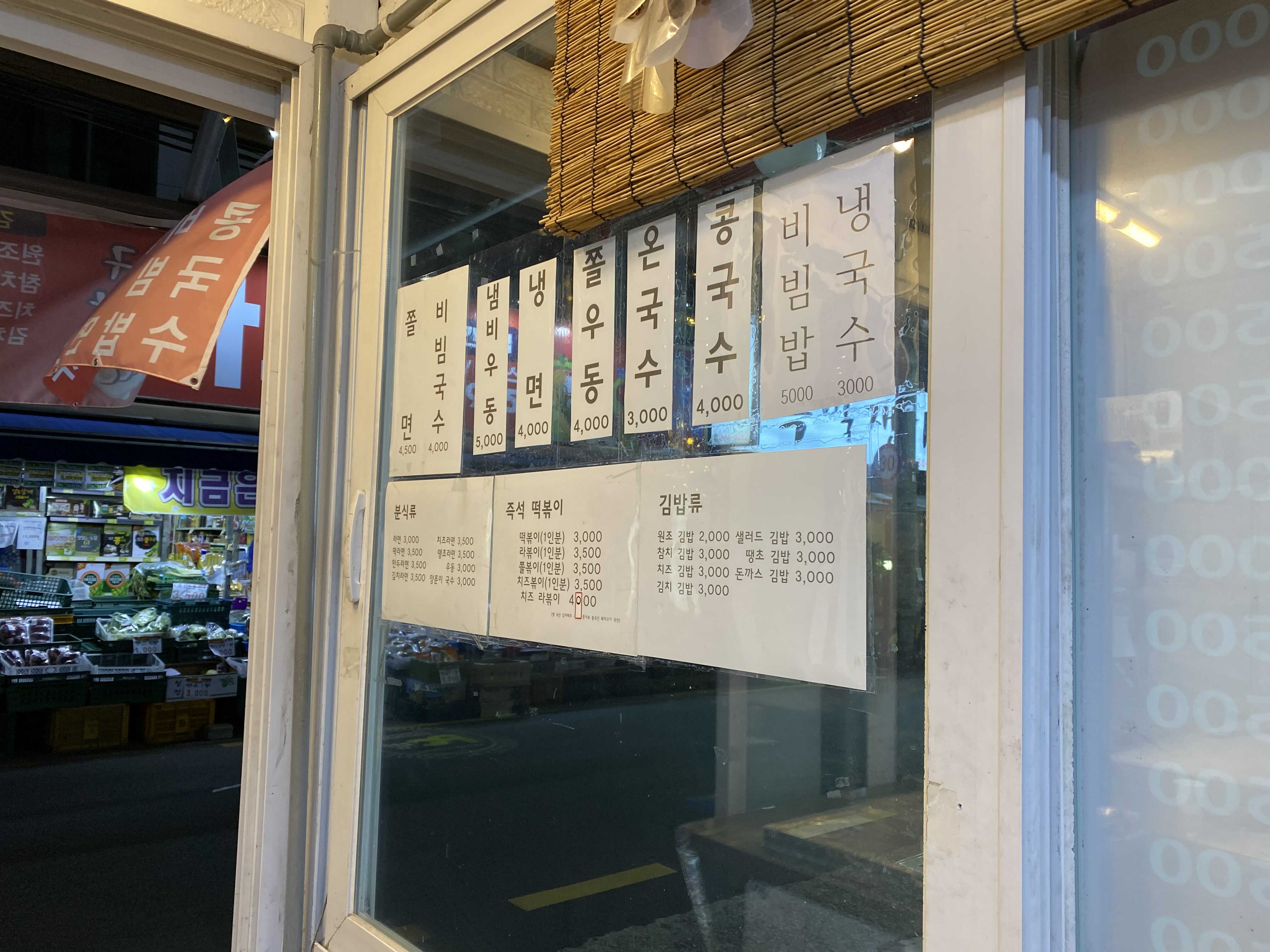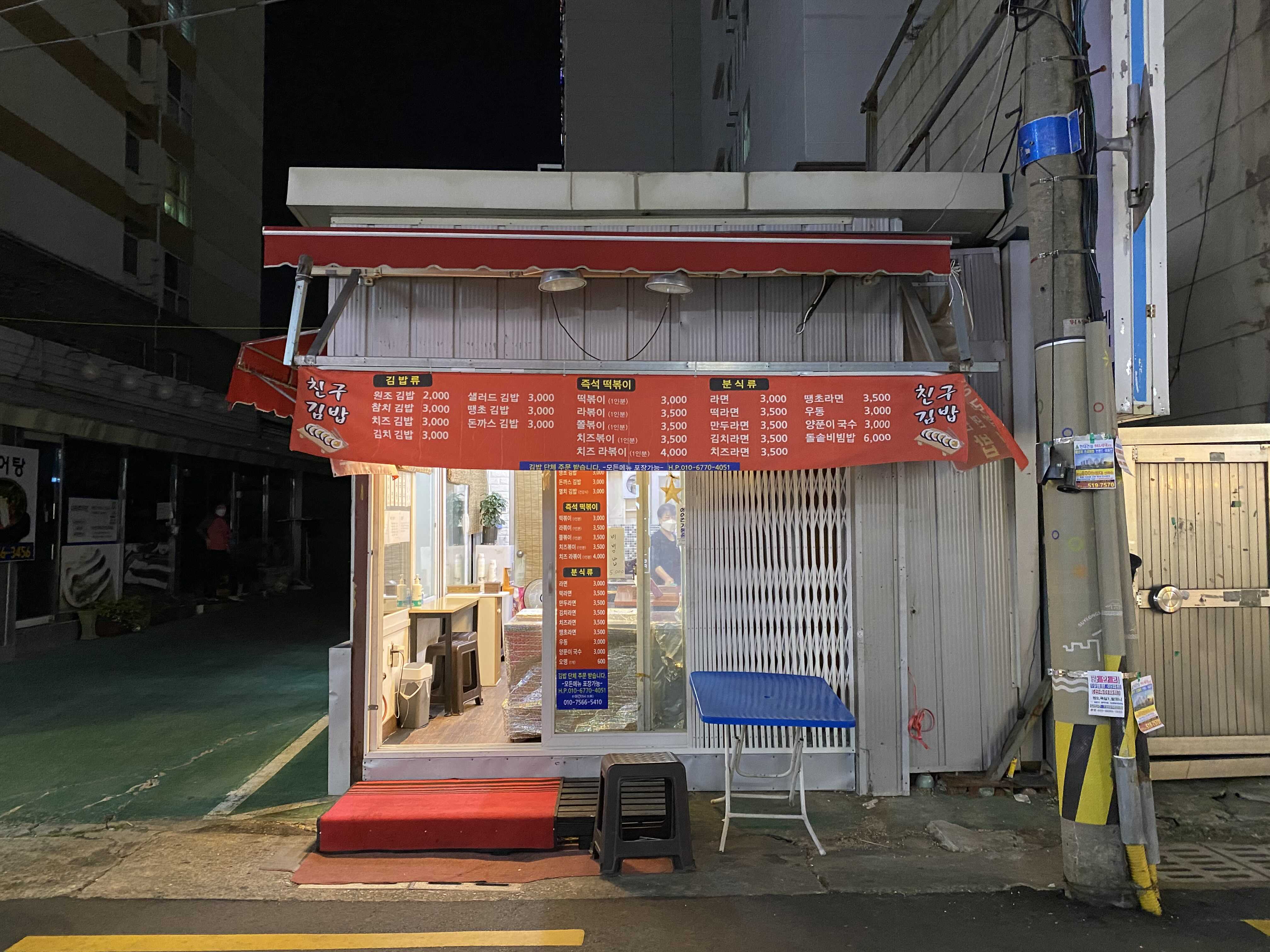 지금은 사회적 거리두기로 9시까지 영업을 마쳐야 하지만, 당시 그 이후에도 먹을 수 있었던 분식집. 간판은 없지만 상호는 친구김밥이었다. 부담없는 가격에 배를 든든하게 만들어주는 집. 이런 집이 좋다.