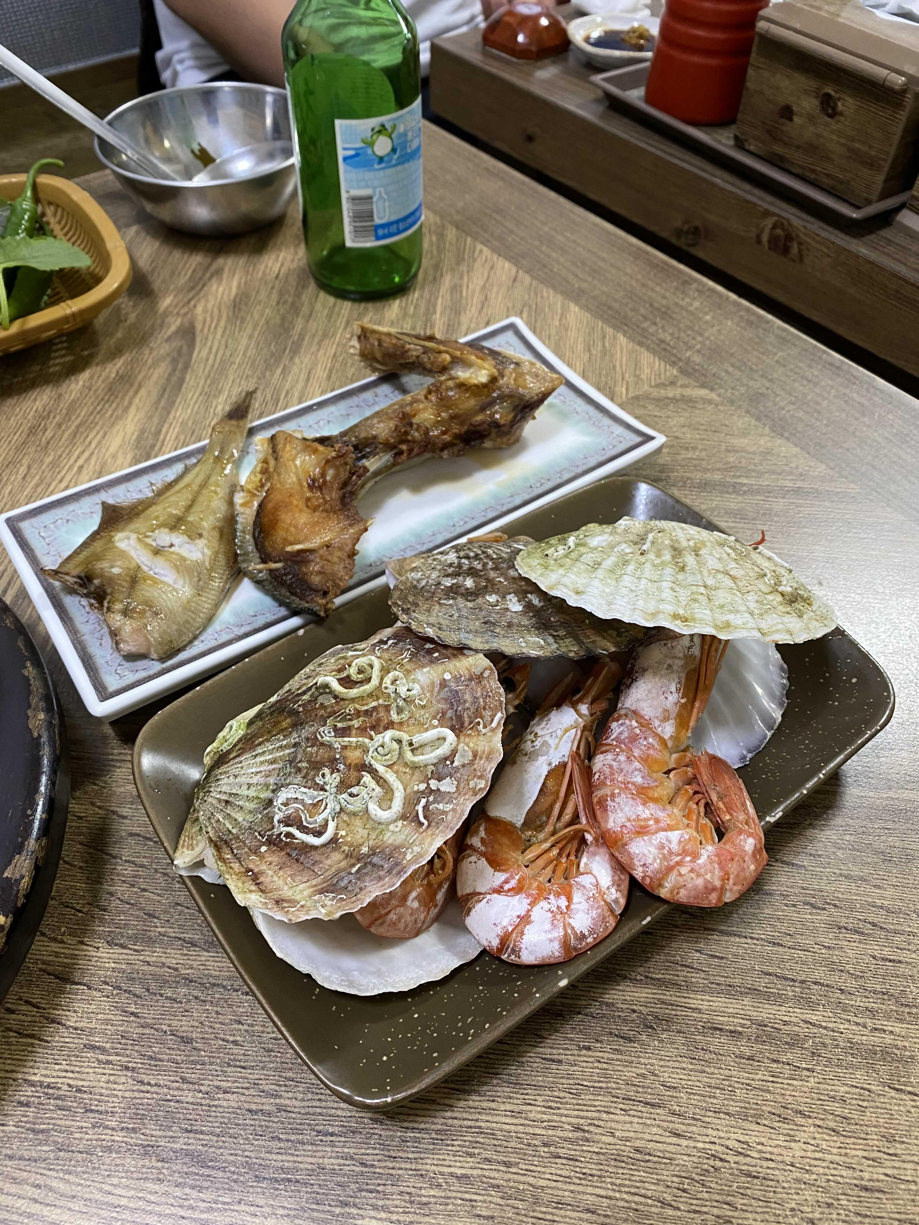 가자미구이와 대방어아가미구이 한 접시와 가리비, 새우구이 한 접시.