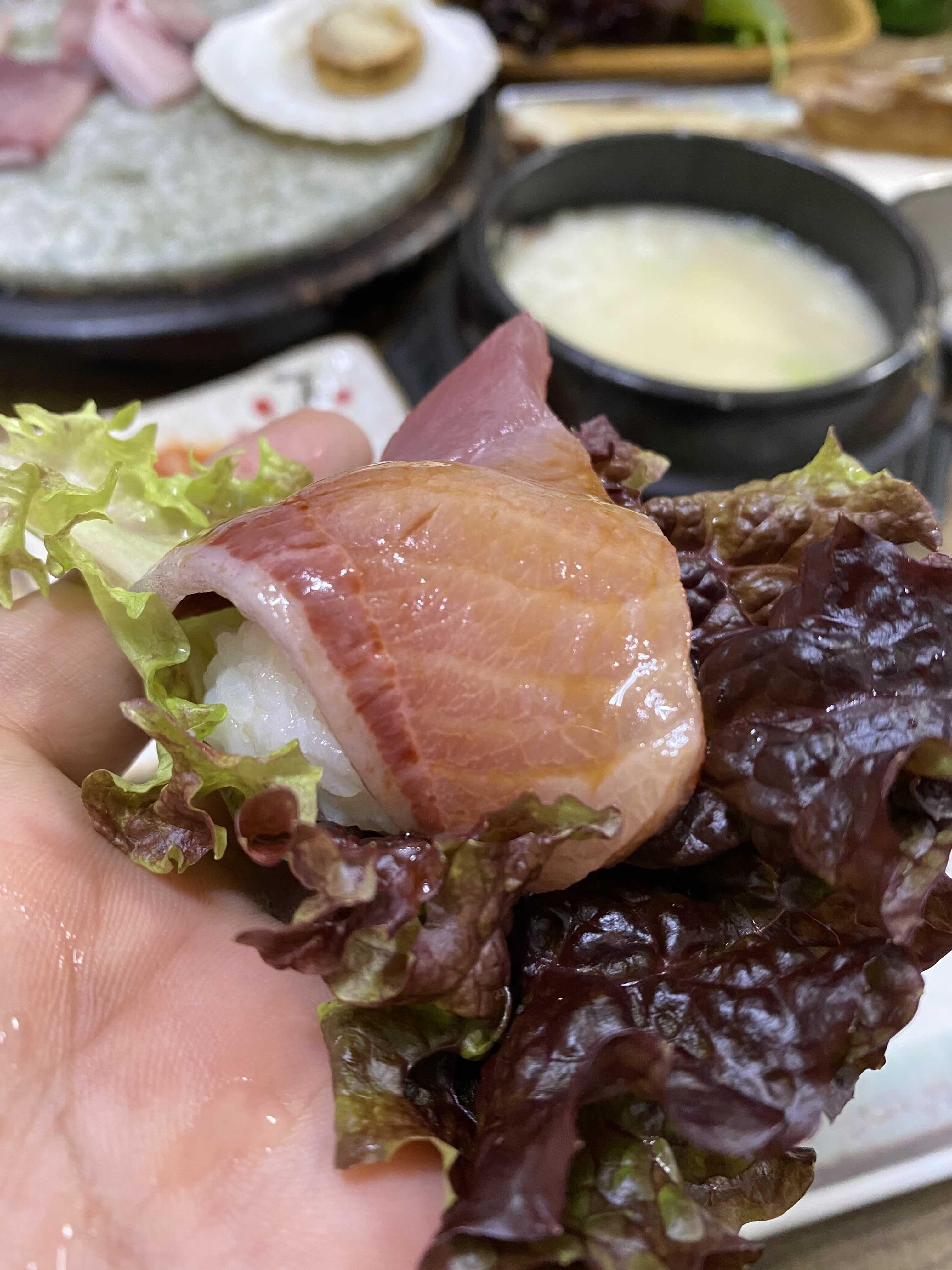 남은 초밥은 상추 위에 올리고, 남은 대방어회는 간장에 푹 찍어서 싸 먹어도 굿.