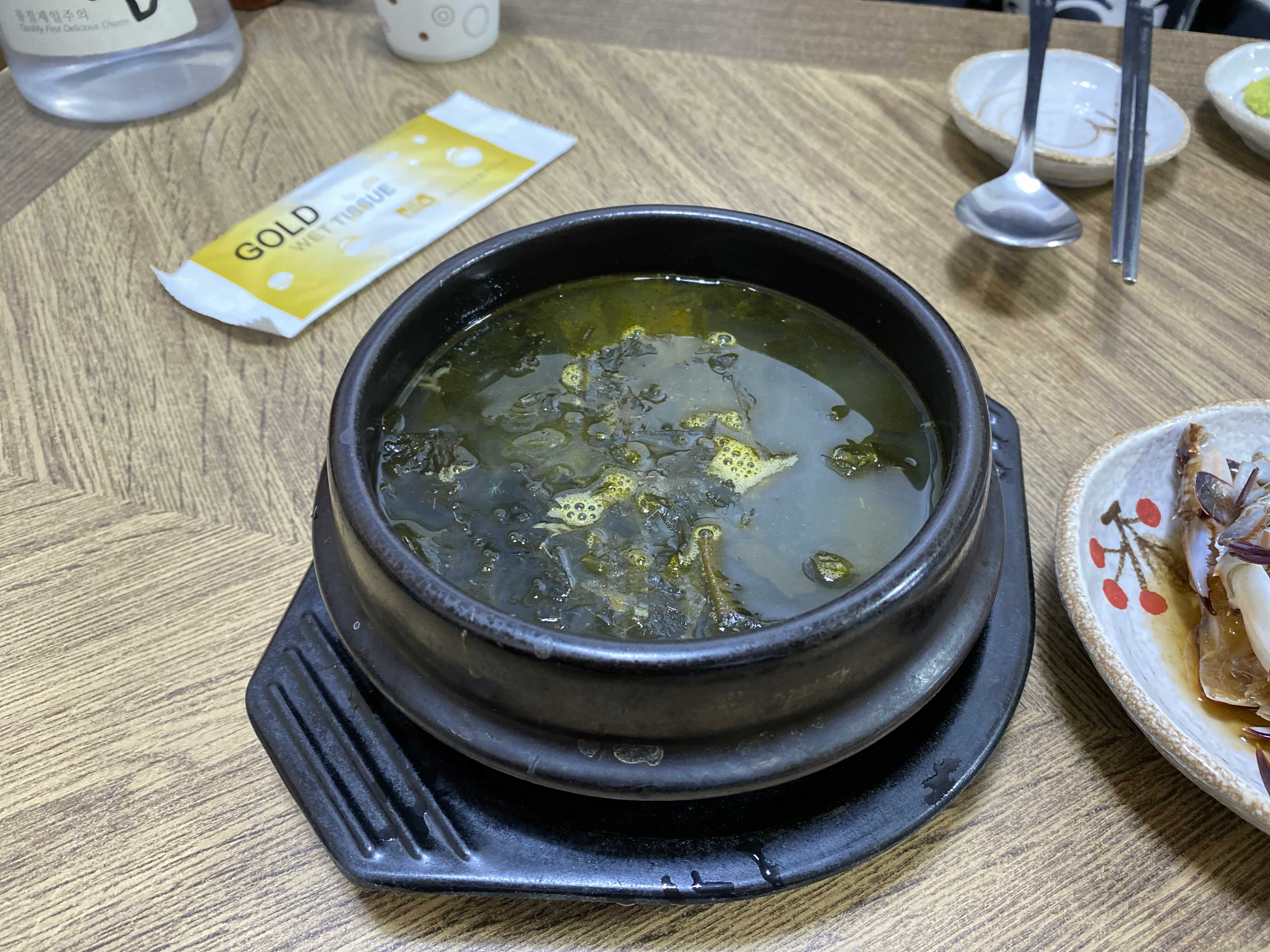 마성의 국물이라고 부르고 싶은 후포회수산의 미역국. 이 집의 대표 어종인 이시가리(줄가자미)의 뼈를 주로 사용한다고 한다.