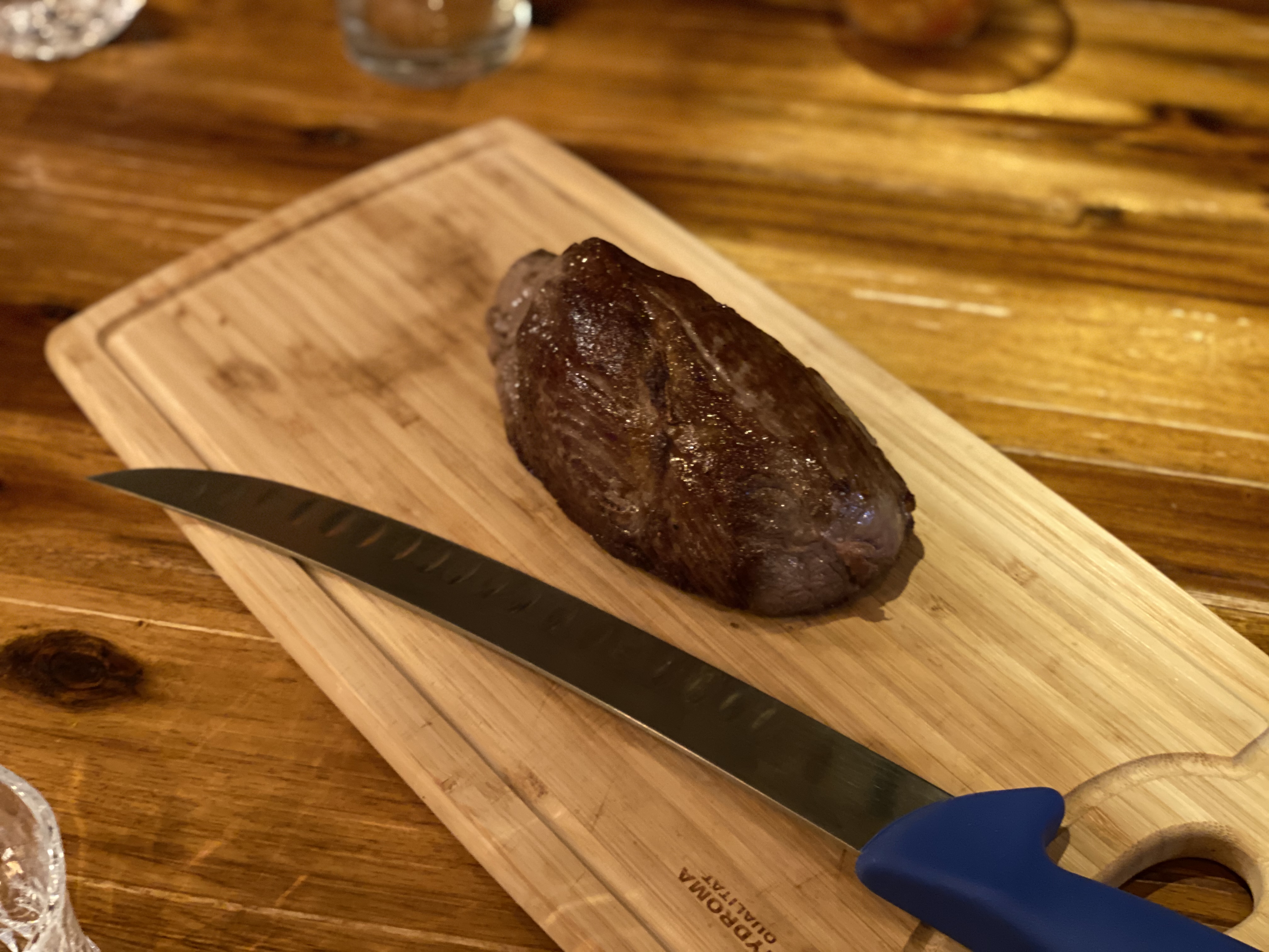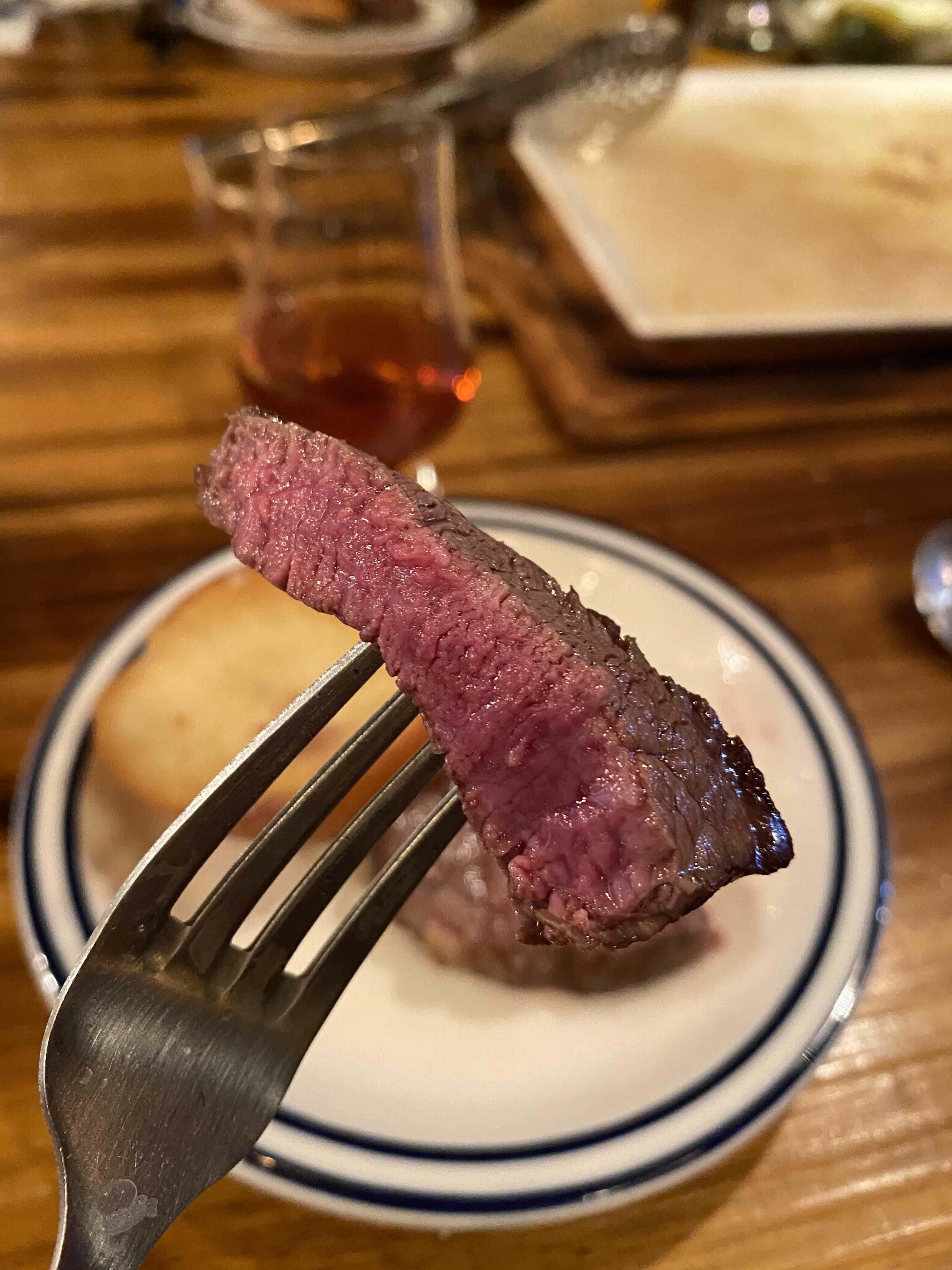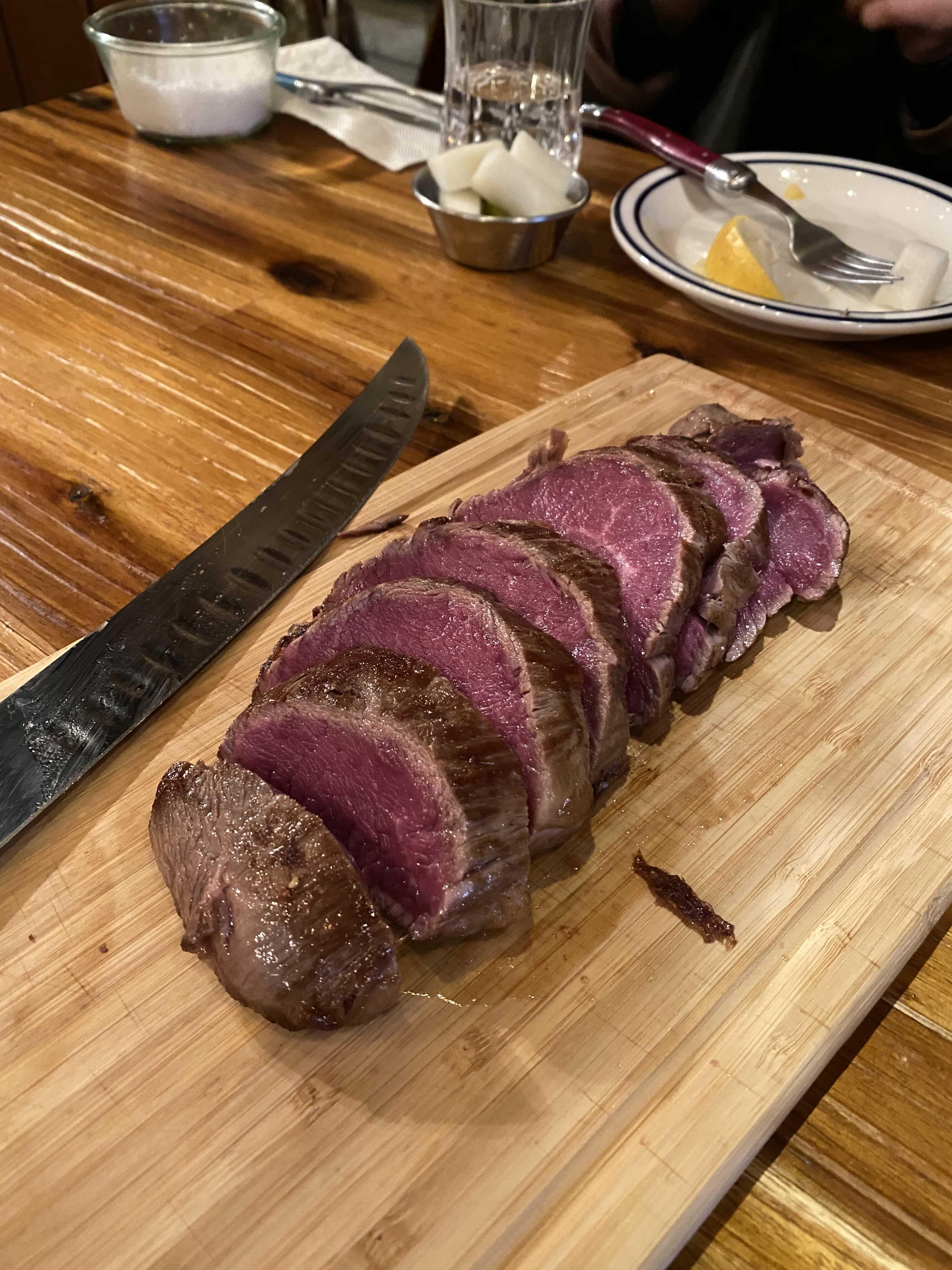 곁은 익었고, 속은 익지 않은 상태의 안심.