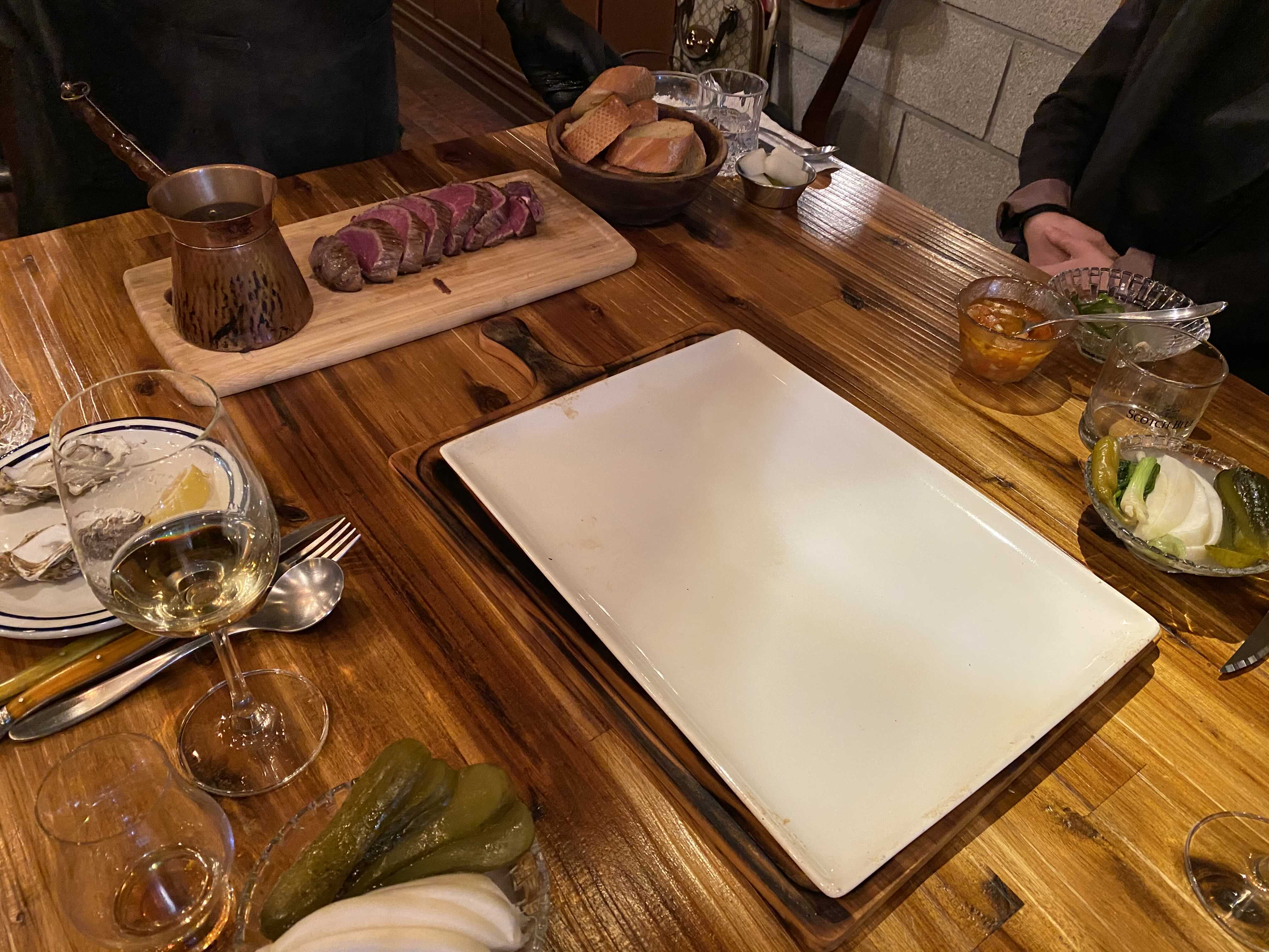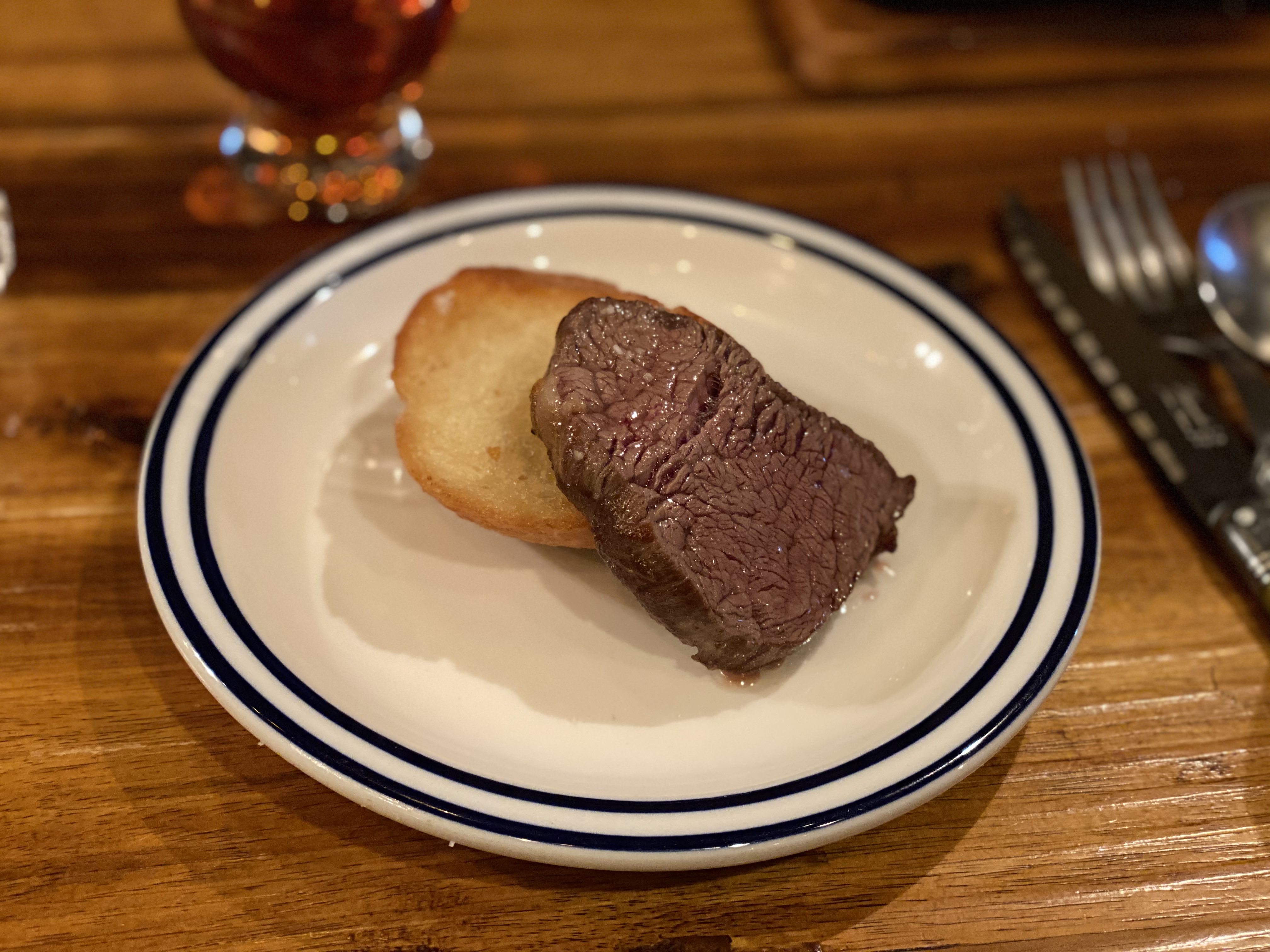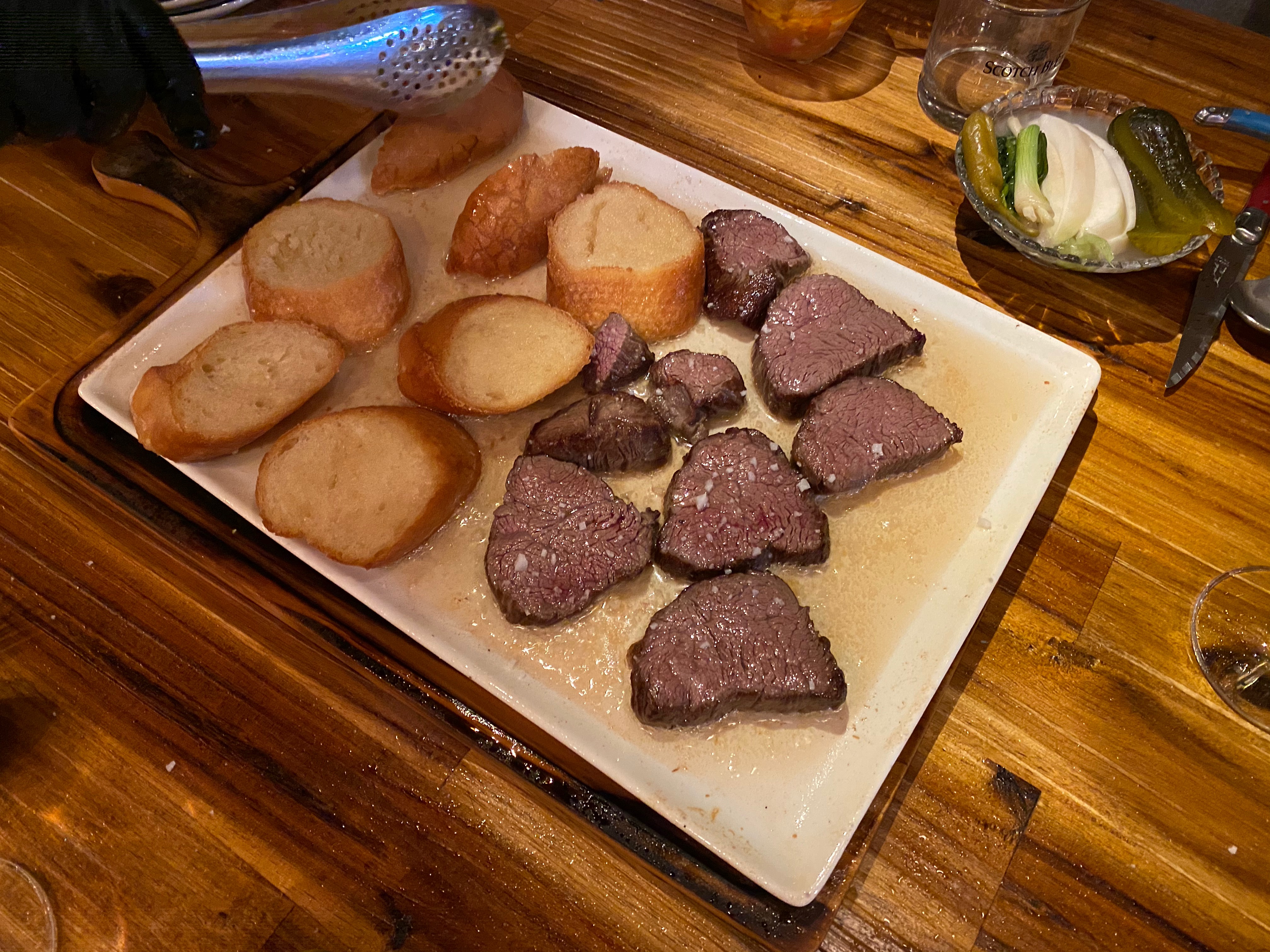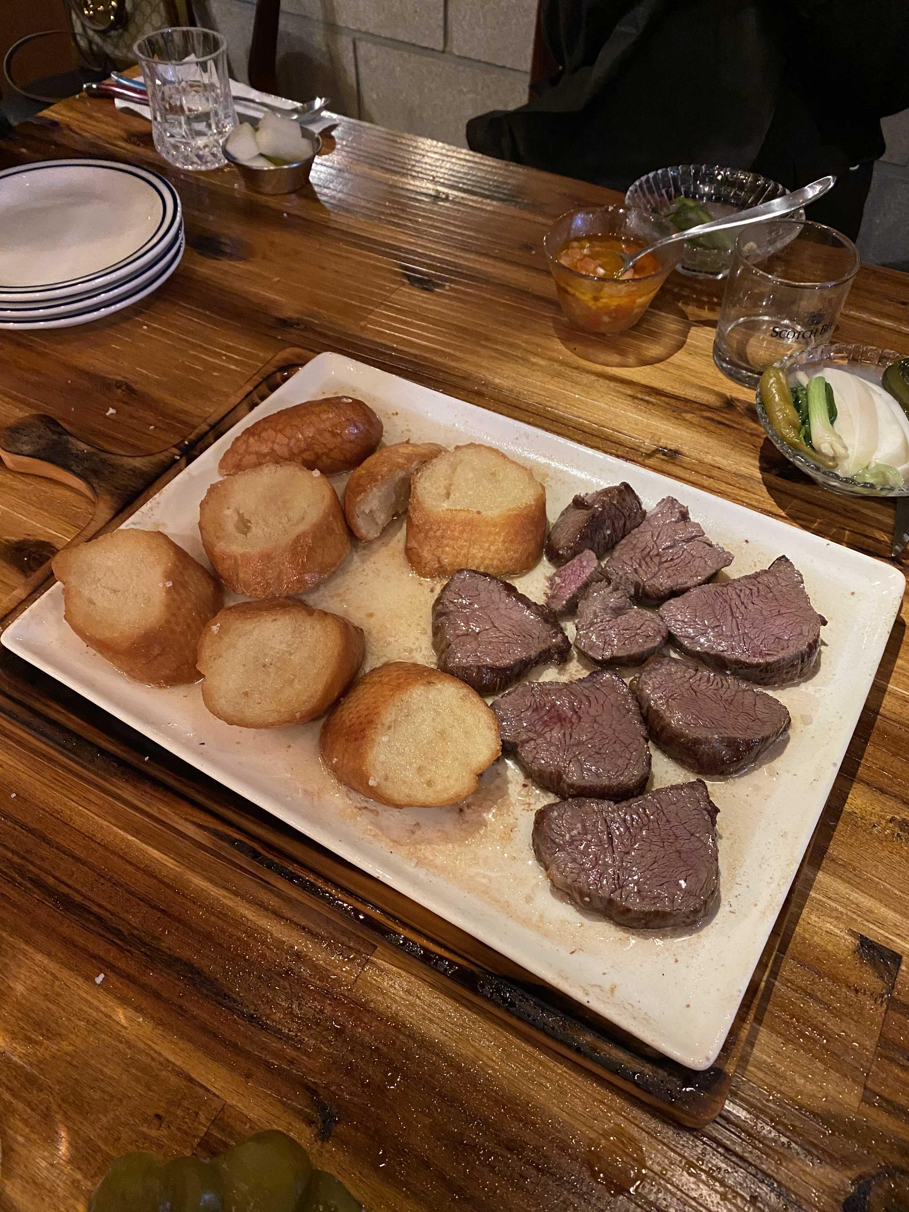바게트 한 조각과 스테이크 한 조각을 덜어서 접시 위로.