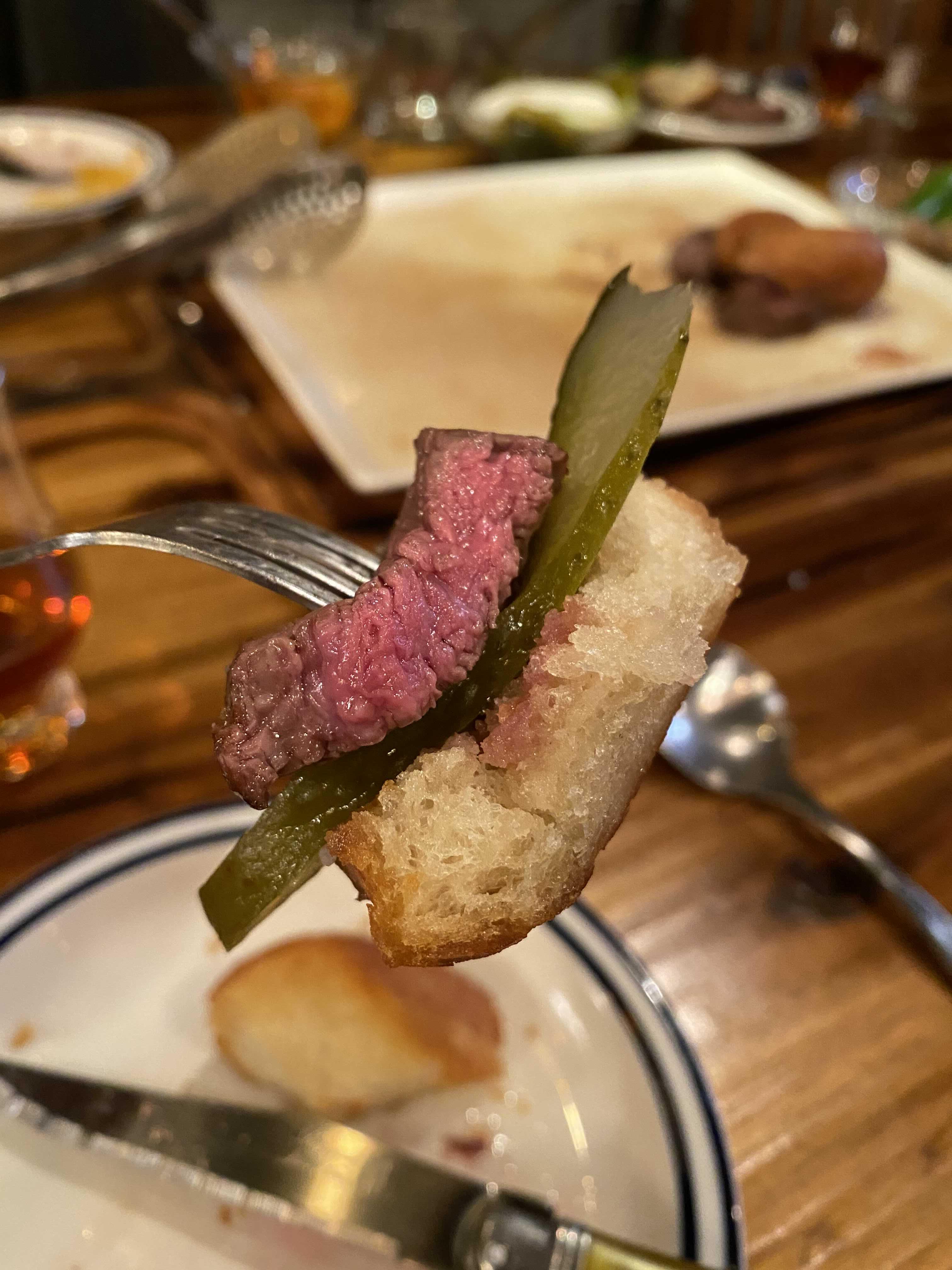 그래서 남은 스테이크와 바게트 사이에 피클을 넣고 샌드위치처럼 만들어 먹었다.