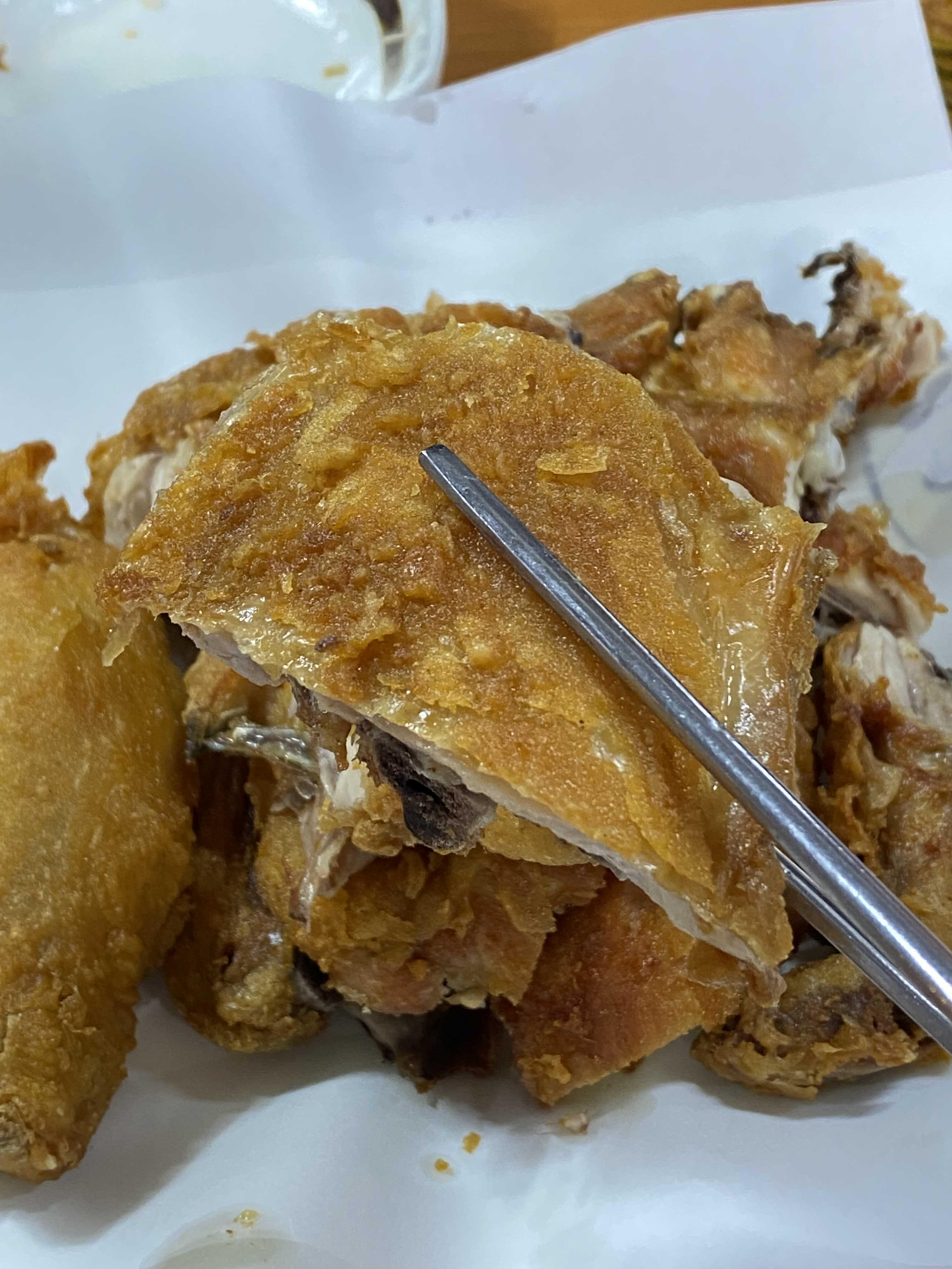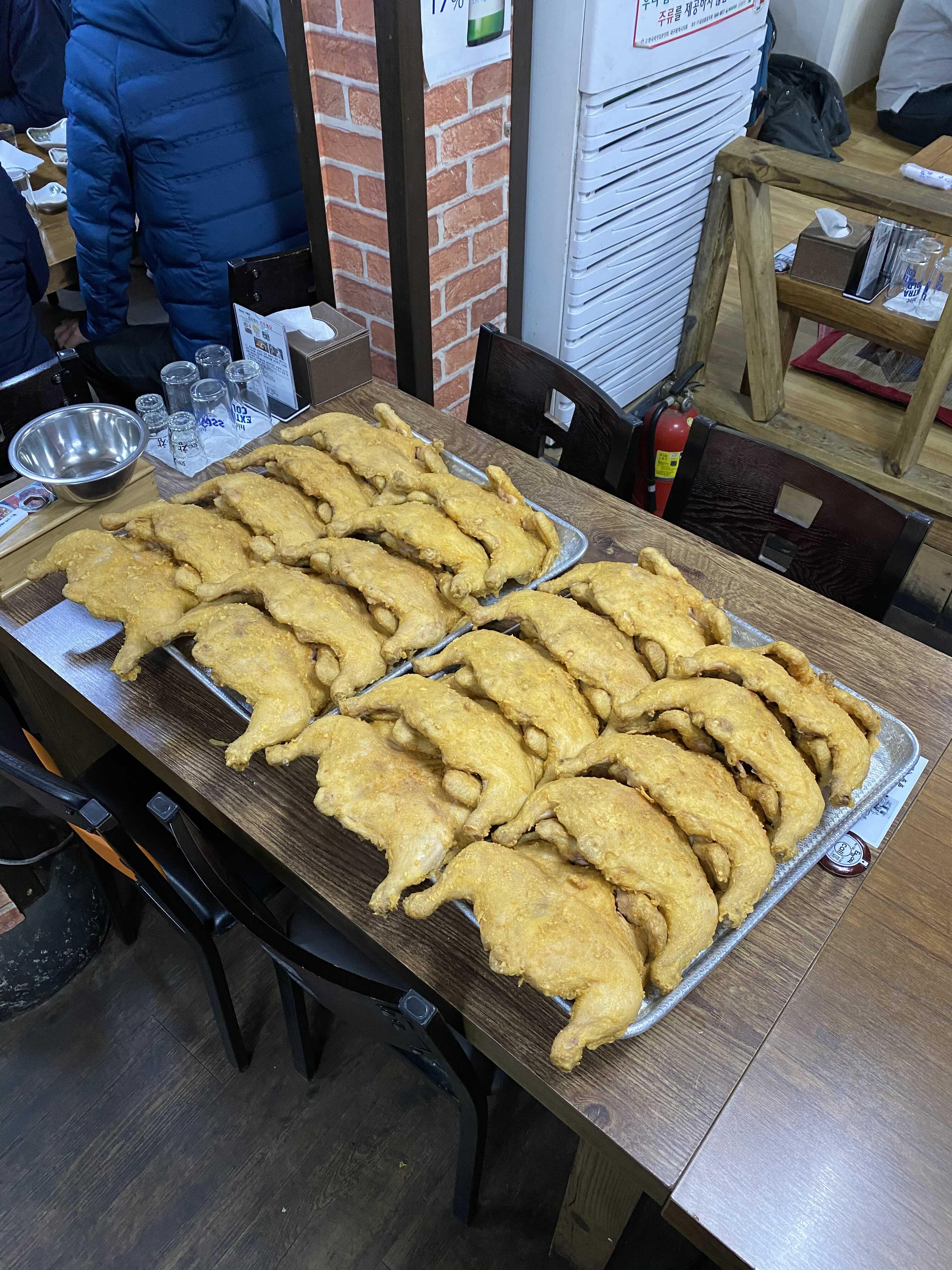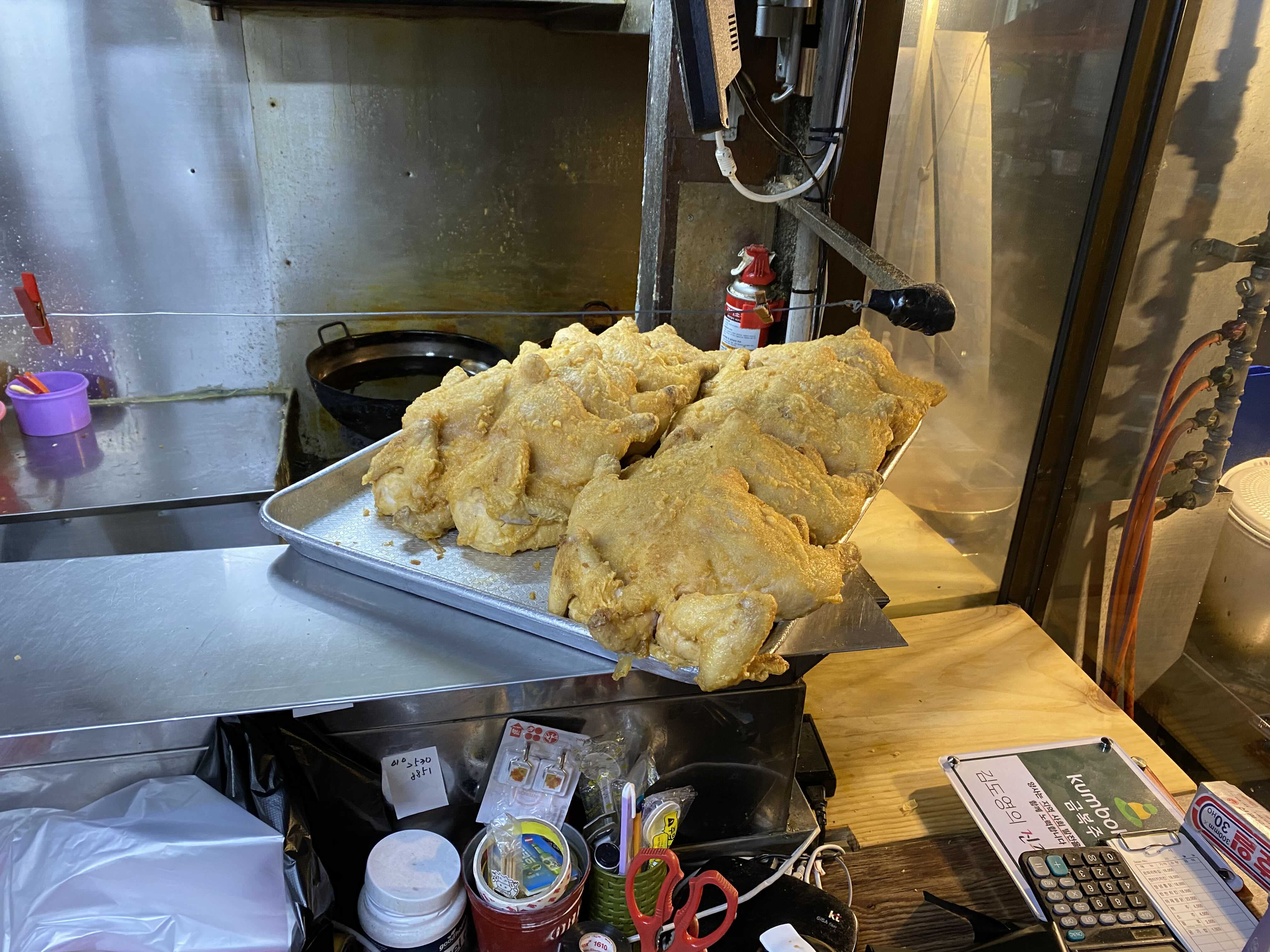 한 번 튀겨진 닭들이 가지런히 놓여있는데 여기저기 제법 많았다. 자르지 않은 온마리 닭의 모습을 보며 이룩을 기다리는 비행기 같다고 생각했다.