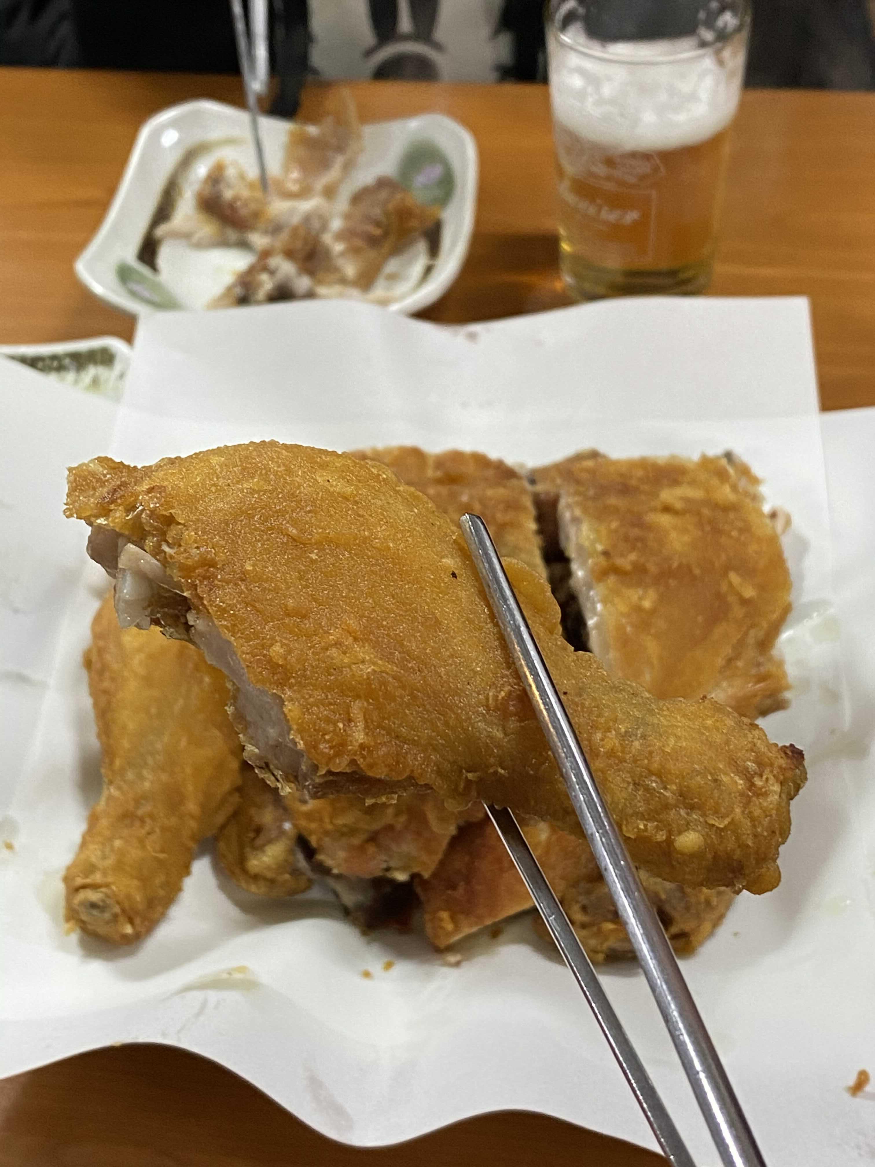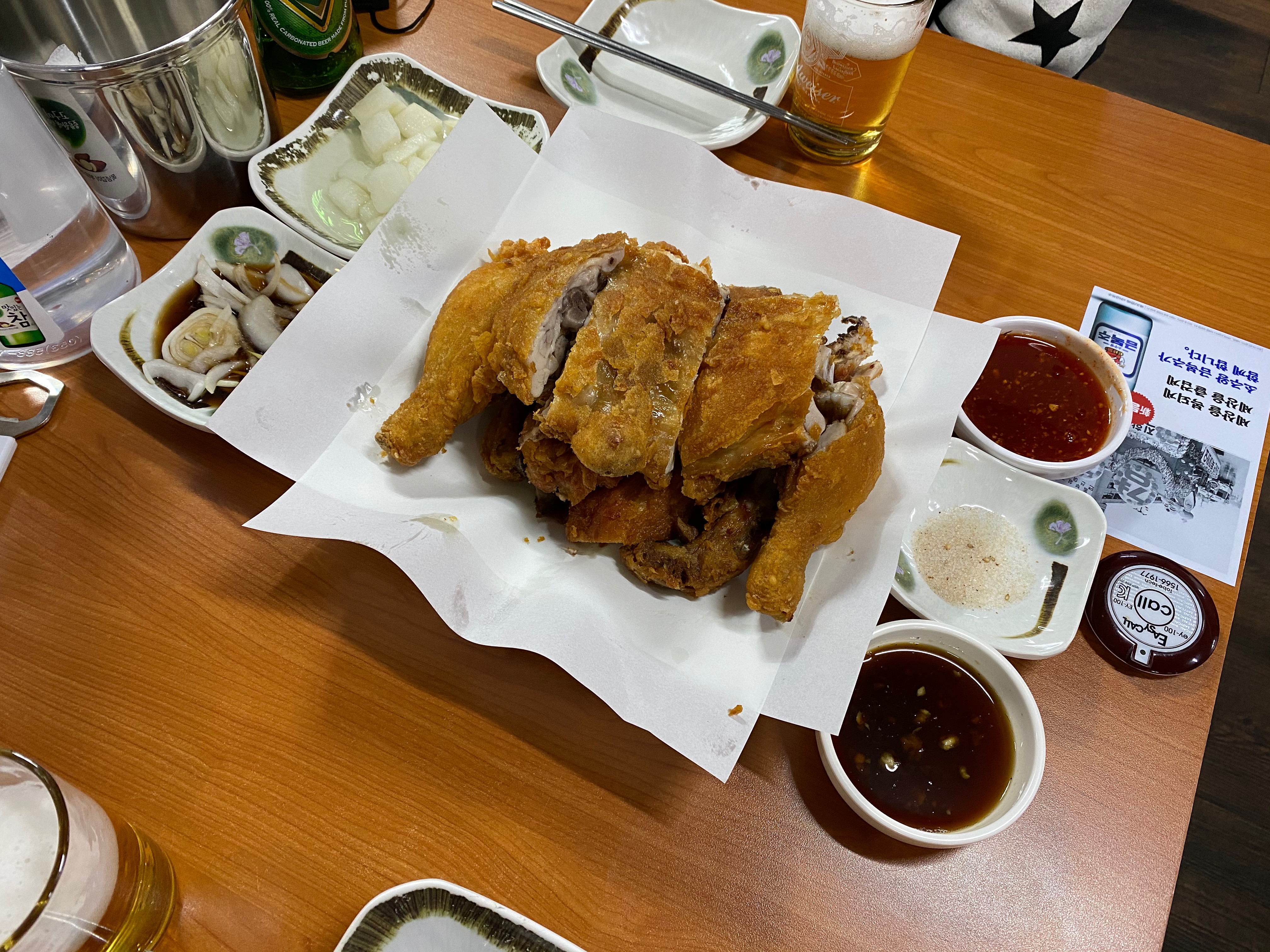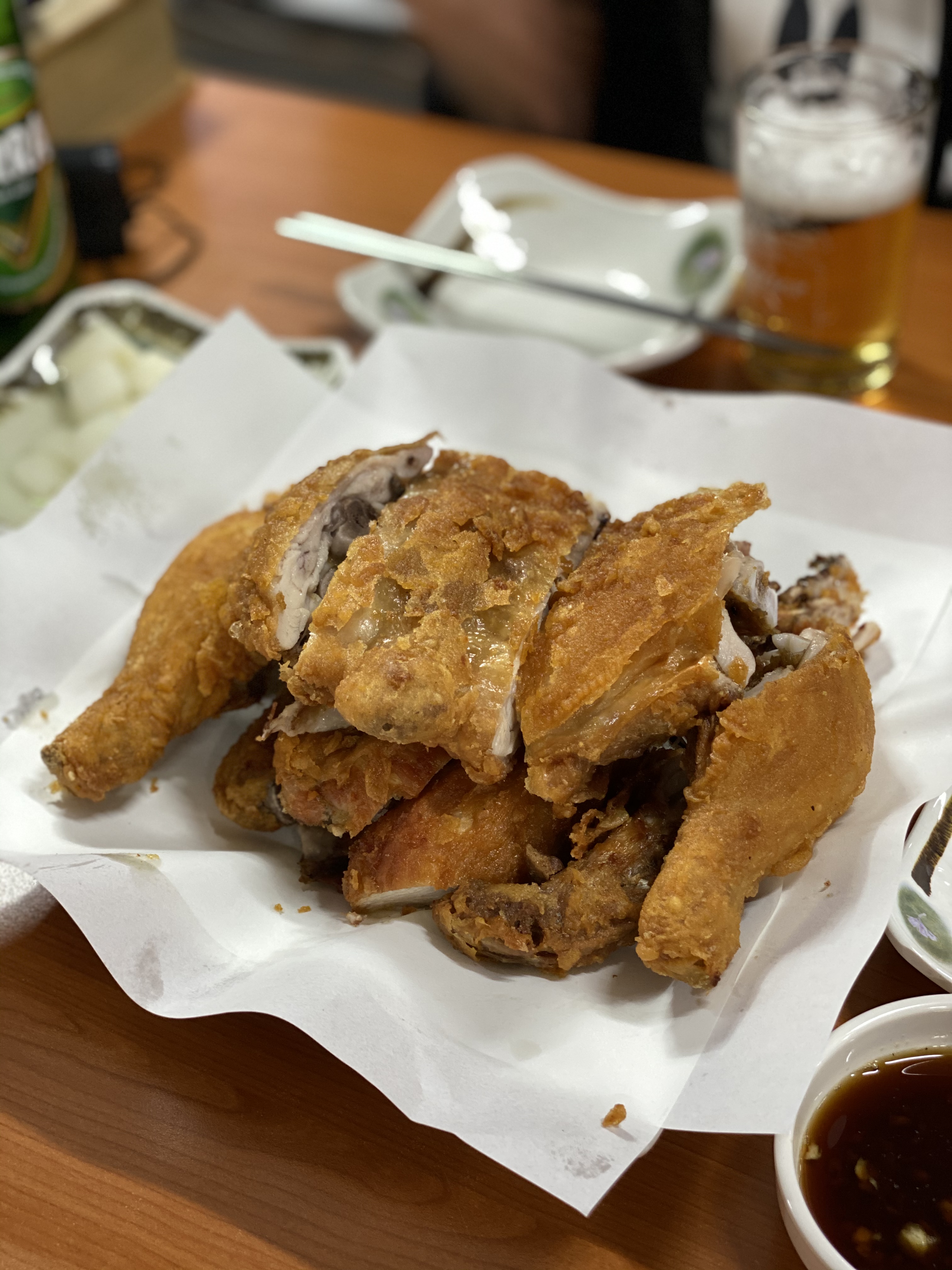 한 번 튀겨진 닭들이 가지런히 놓여있는데 여기저기 제법 많았다. 자르지 않은 온마리 닭의 모습을 보며 이룩을 기다리는 비행기 같다고 생각했다.