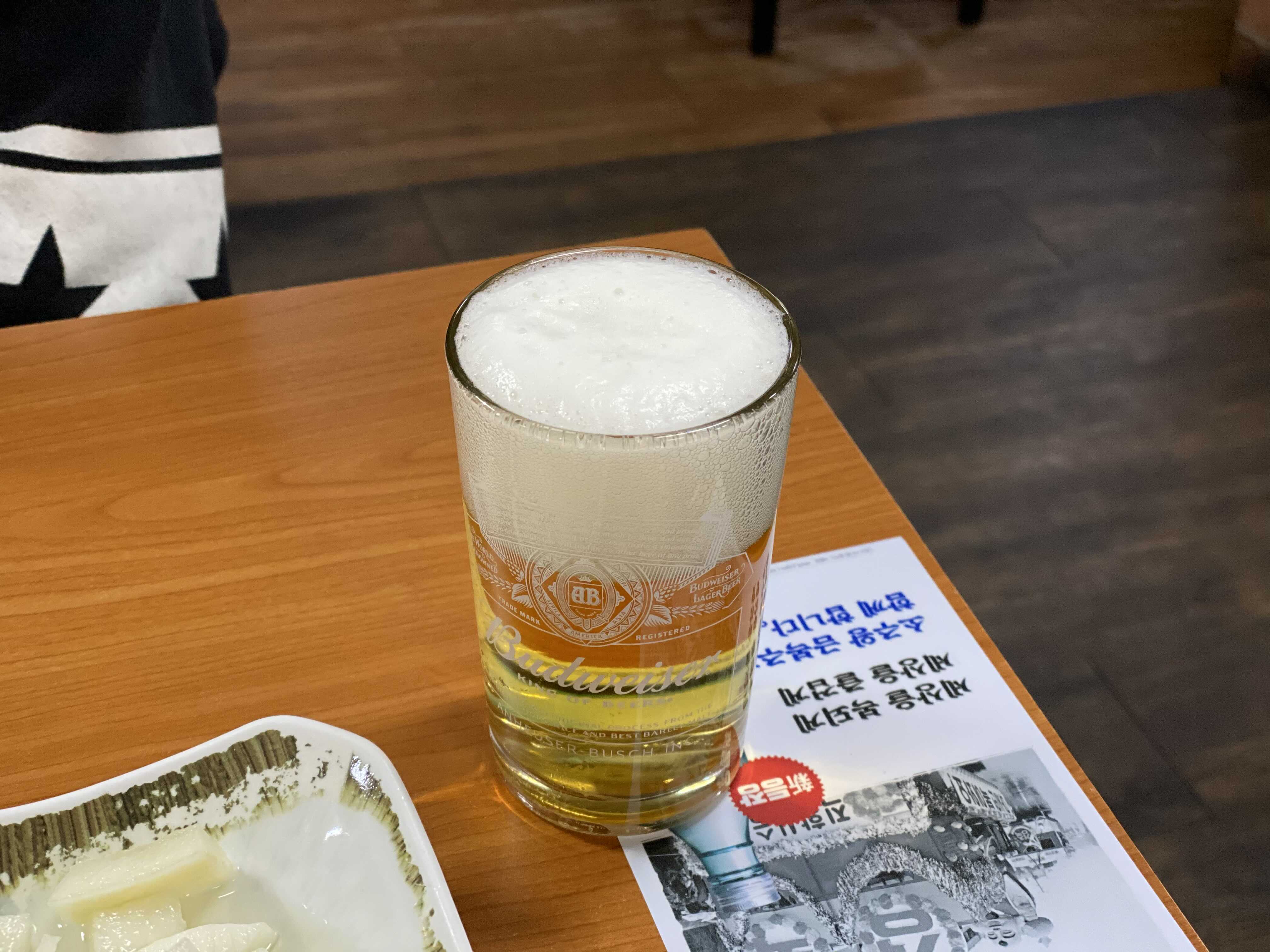 시원한 맥주 한 잔으로 목을 축이며 통닭을 기다리는 중.