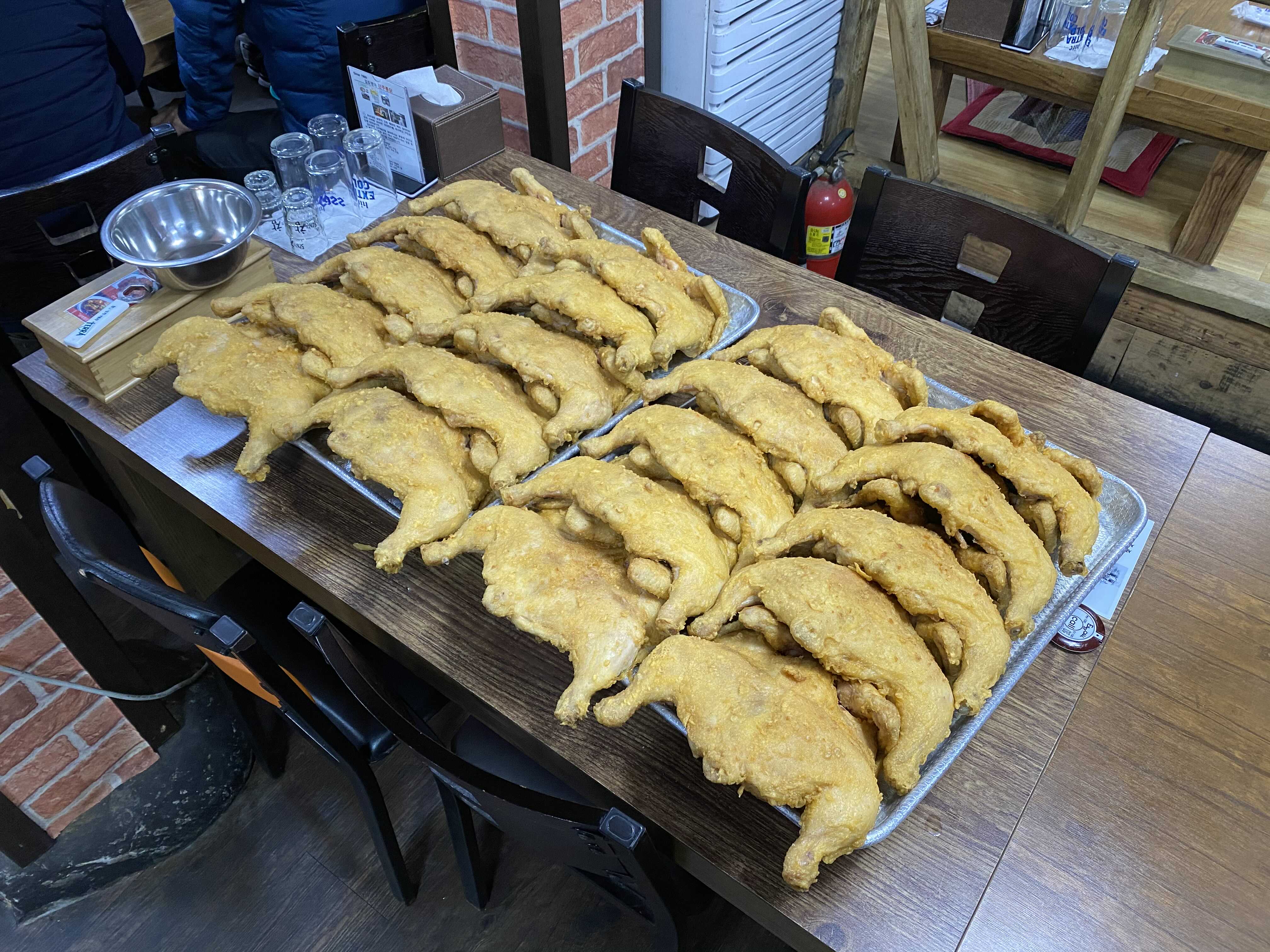 초벌된 통닭 무리가 가지런히 놓여있다. 잘라 튀기지 않고 통으로 튀기는 스타일을 옛날통닭 또는 제사닭이라고도 부르더라. 다만 우리 집에서 제사상에 올리는 닭의 스타일과는 다르고, 전라도에서 제사닭이라고 부르는 스타일과도 다르니 잘은 모르겠지만 지역적인 특색이 있나보다.