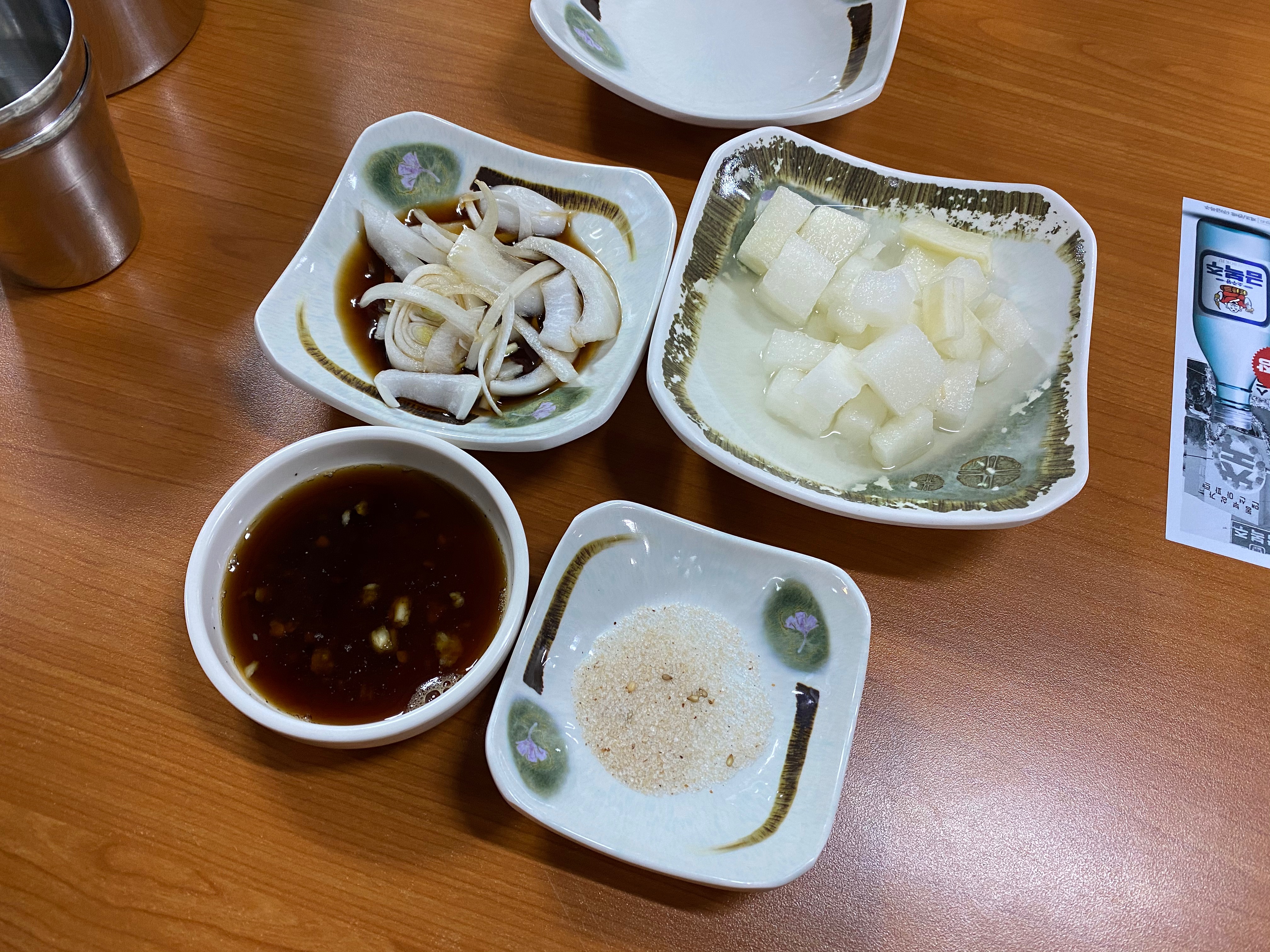 대표메뉴인 온마리 튀김으로 주문. 절임무와 양파 등 단출한 곁들임과 소금, 간장소스가 차려진다.