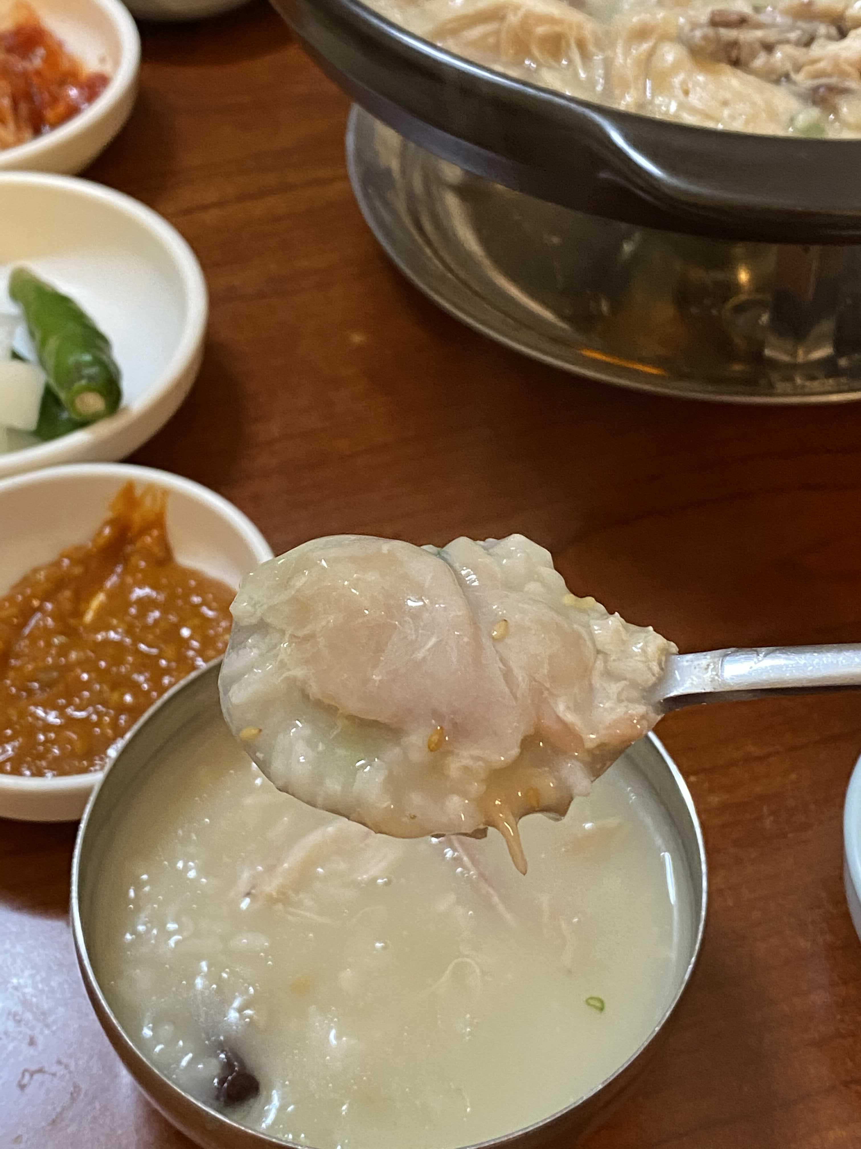 뜨거운 찹쌀죽은 따로 담아준다. 어디 백숙집을 가면 고기도 탐나지만 이 죽에 더 욕심이 생기곤 한다.