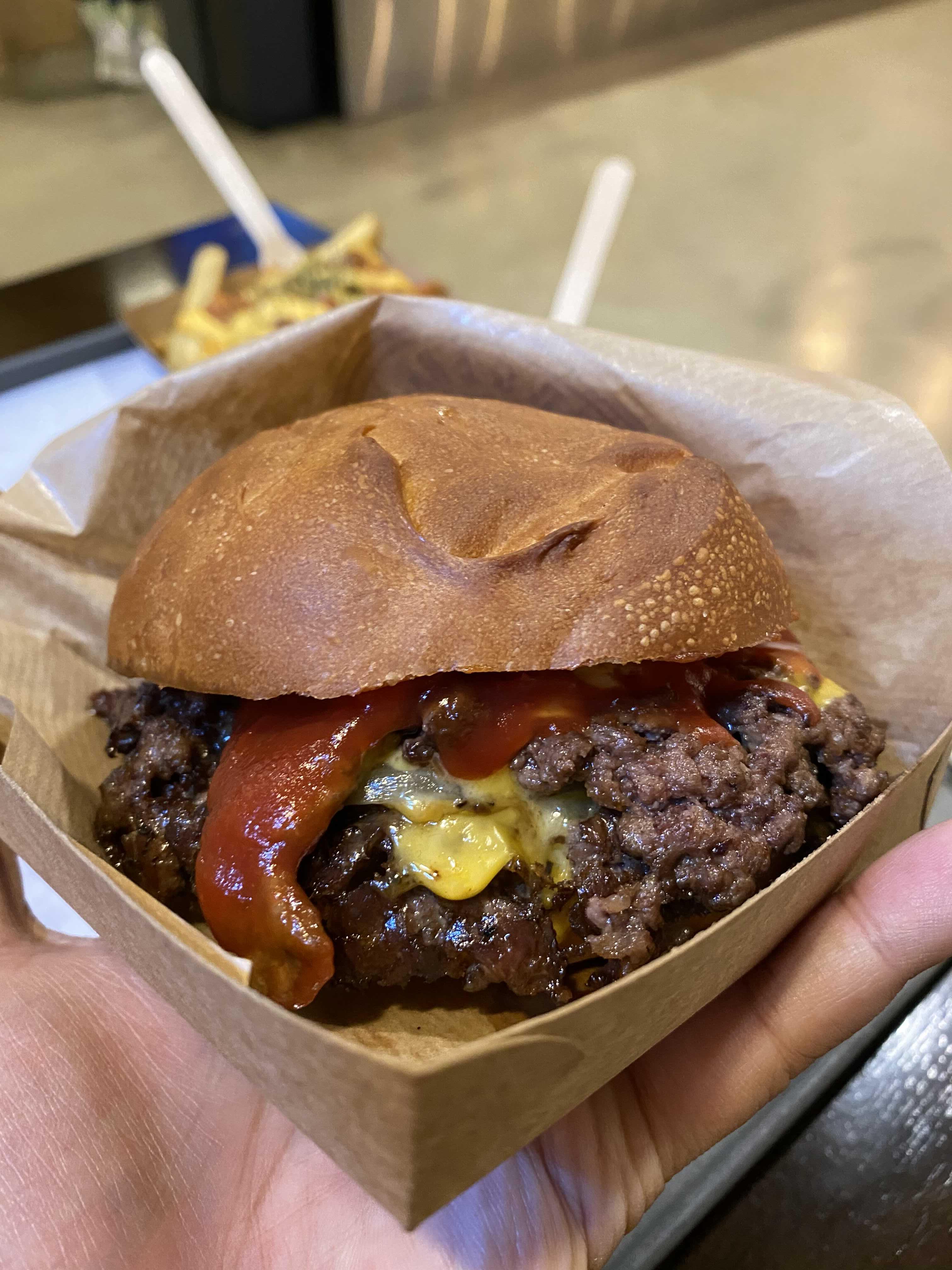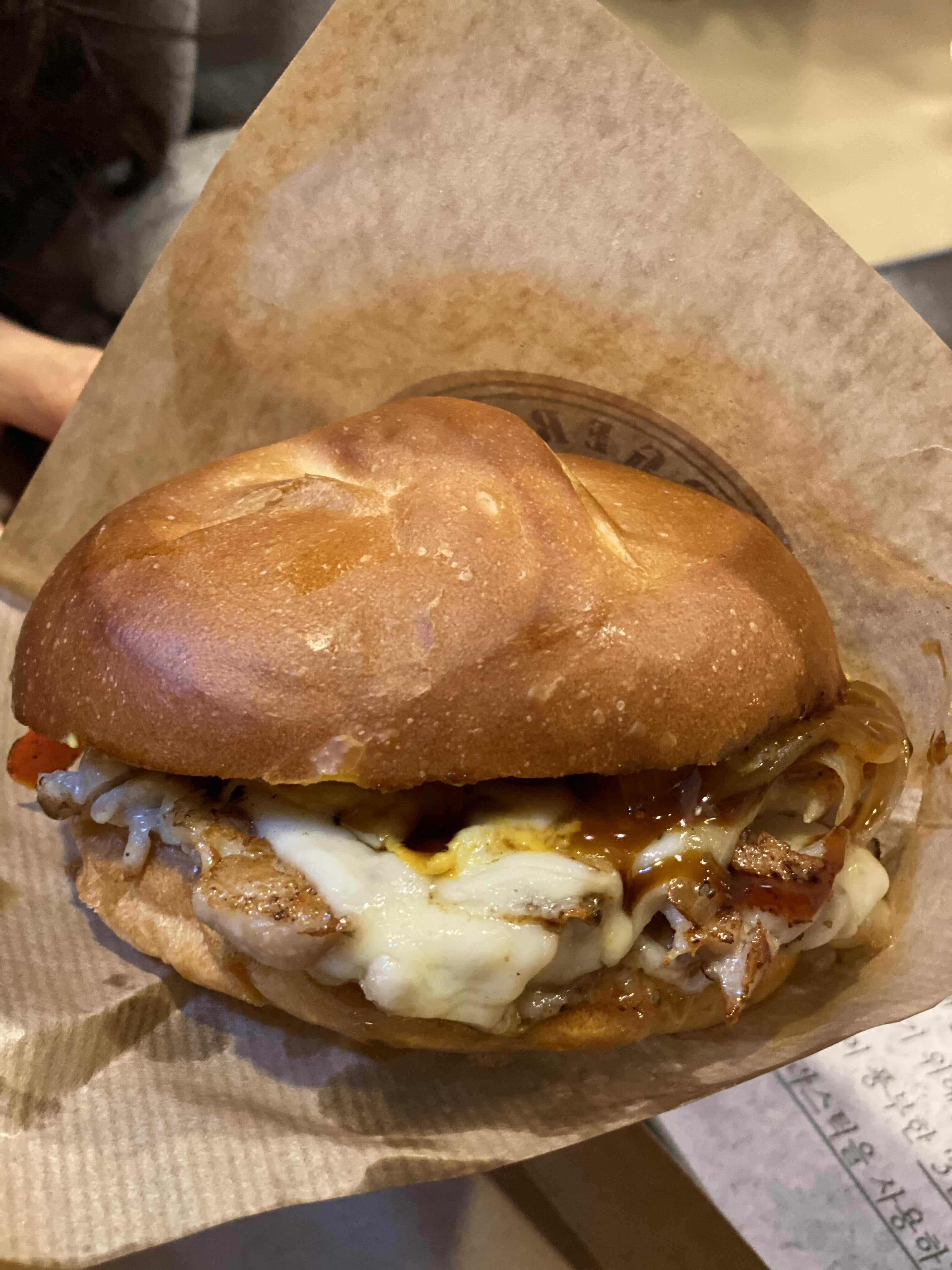 버거 빵은 가게에서 직접 구워서 만드는데 제빵 과정에 화학첨가물을 사용하지 않았다고 한다. 투박한 패티 위에 흘러내린 칠리소스가 혀를 내밀고 있는 것 같다.