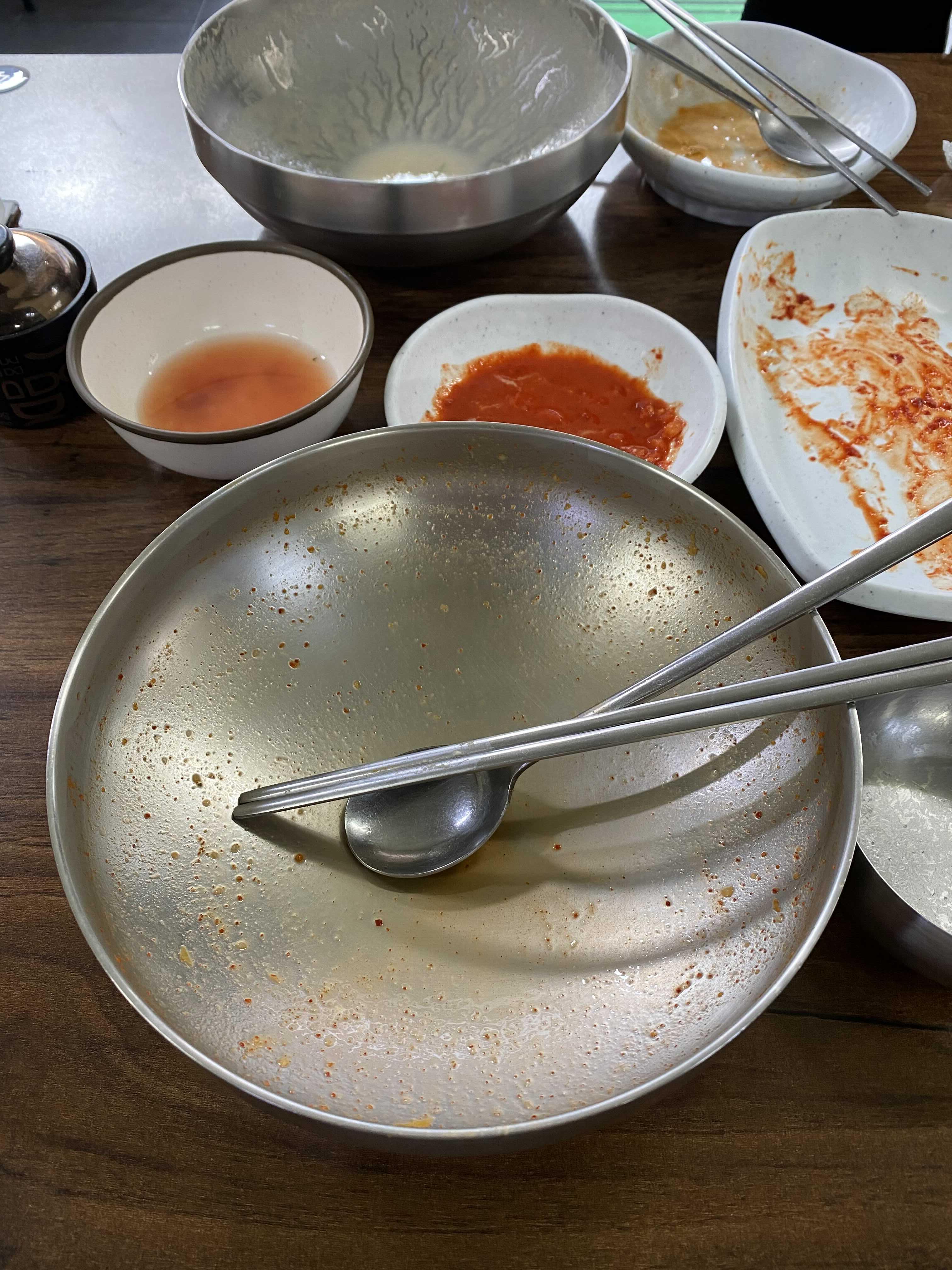 밥을 마는 동안 친구는 콩국수와 함께 김치까지 다 먹어버렸다.