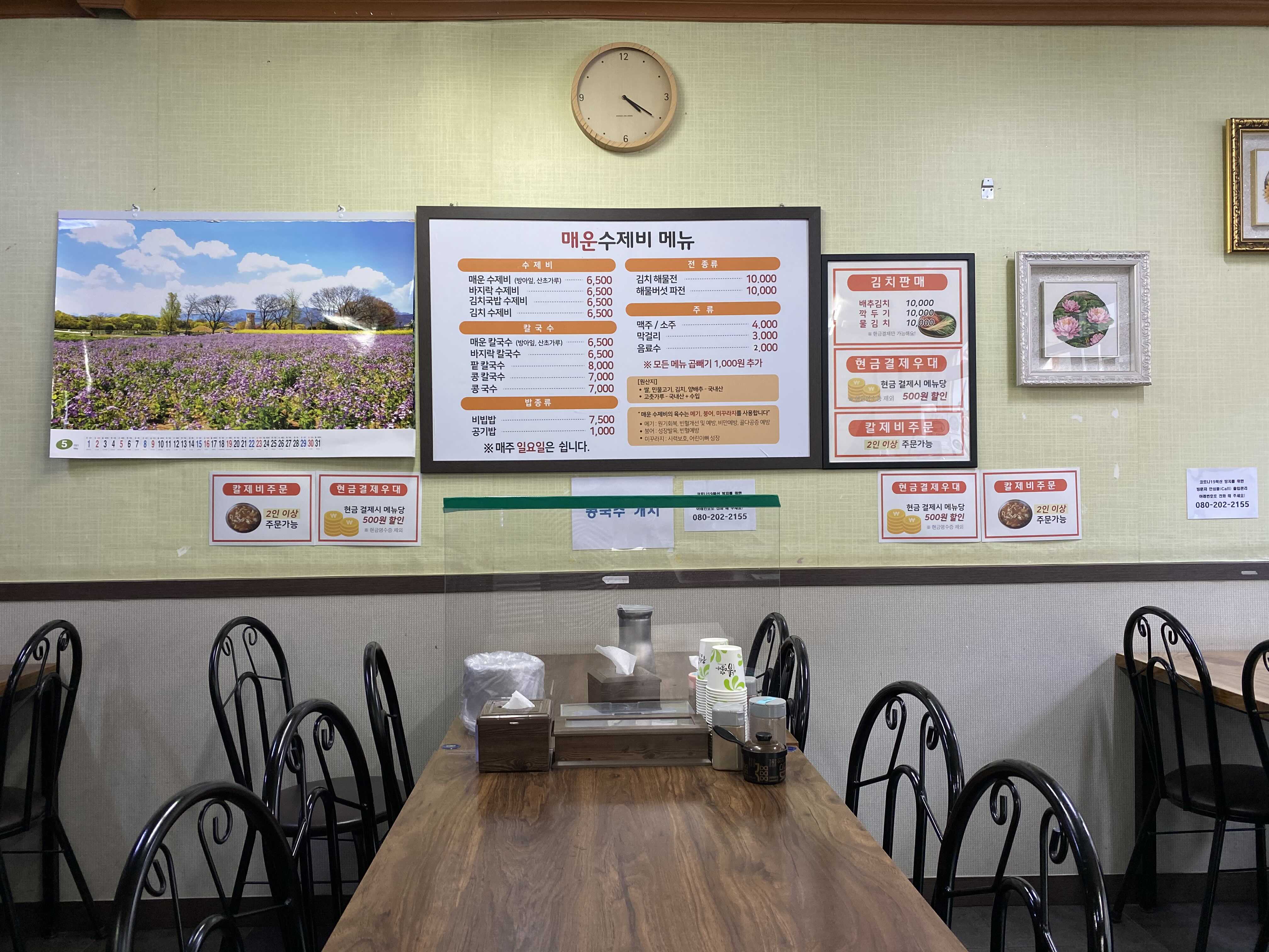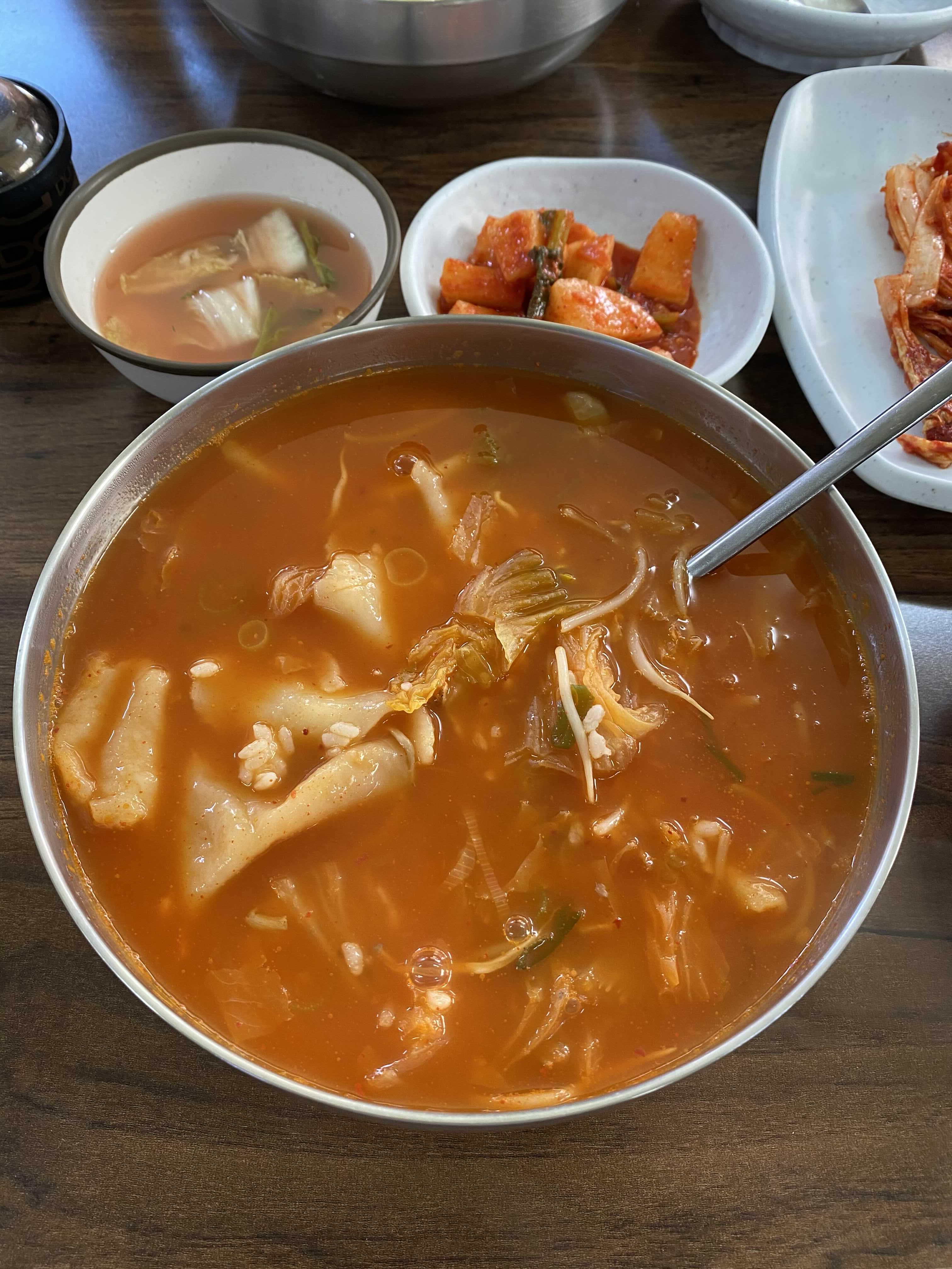 뭘 먹을까 고민하다가 선택한 연산동 매운수제비. 이 집의 매운수제비도 먹어보고, 김치국밥수제비도 먹어봤는데 입맛 없는 날에는 새콤한 김치국밥수제비 한 그릇이면 입맛이 돌아올 것 같다는 생각이 든다.
