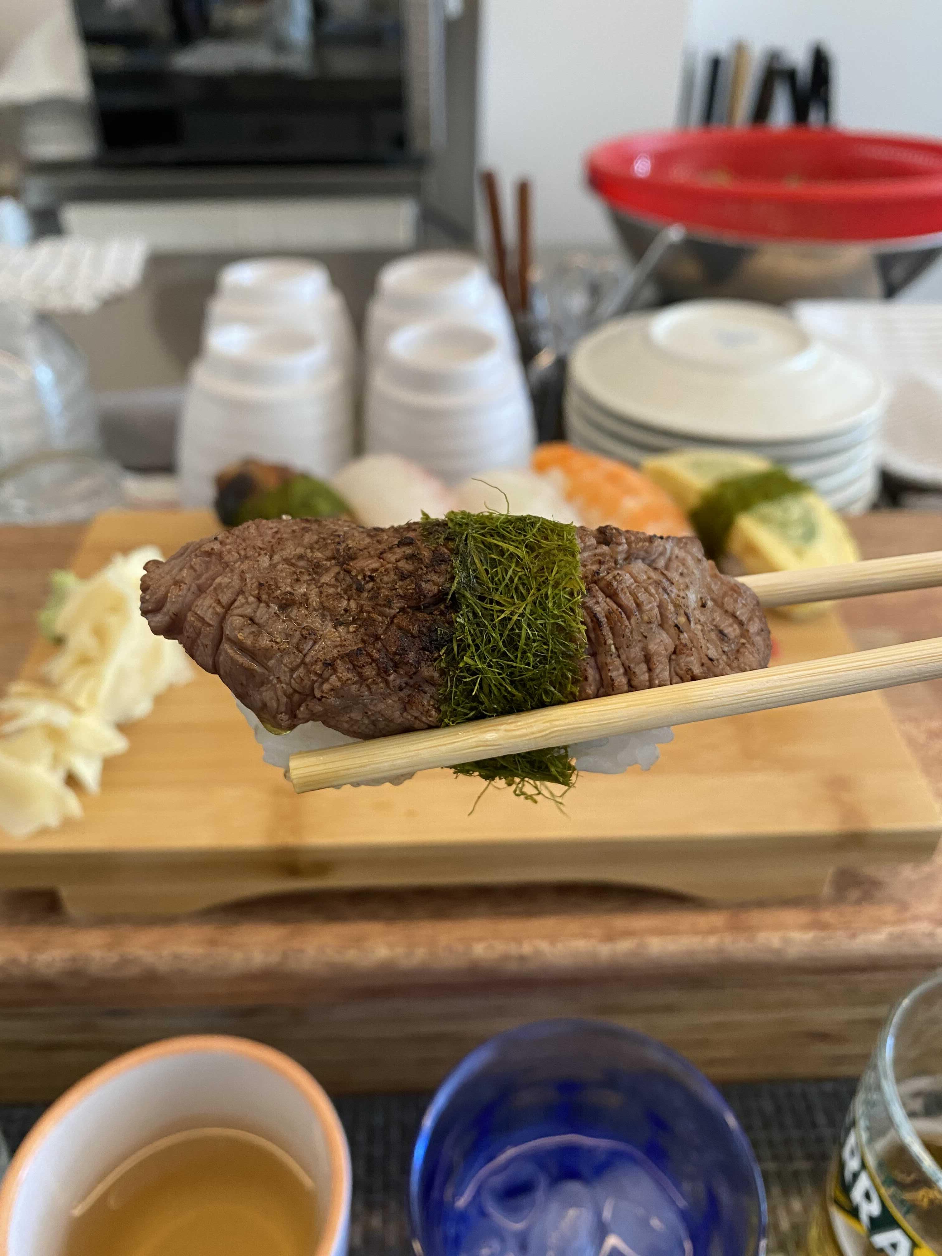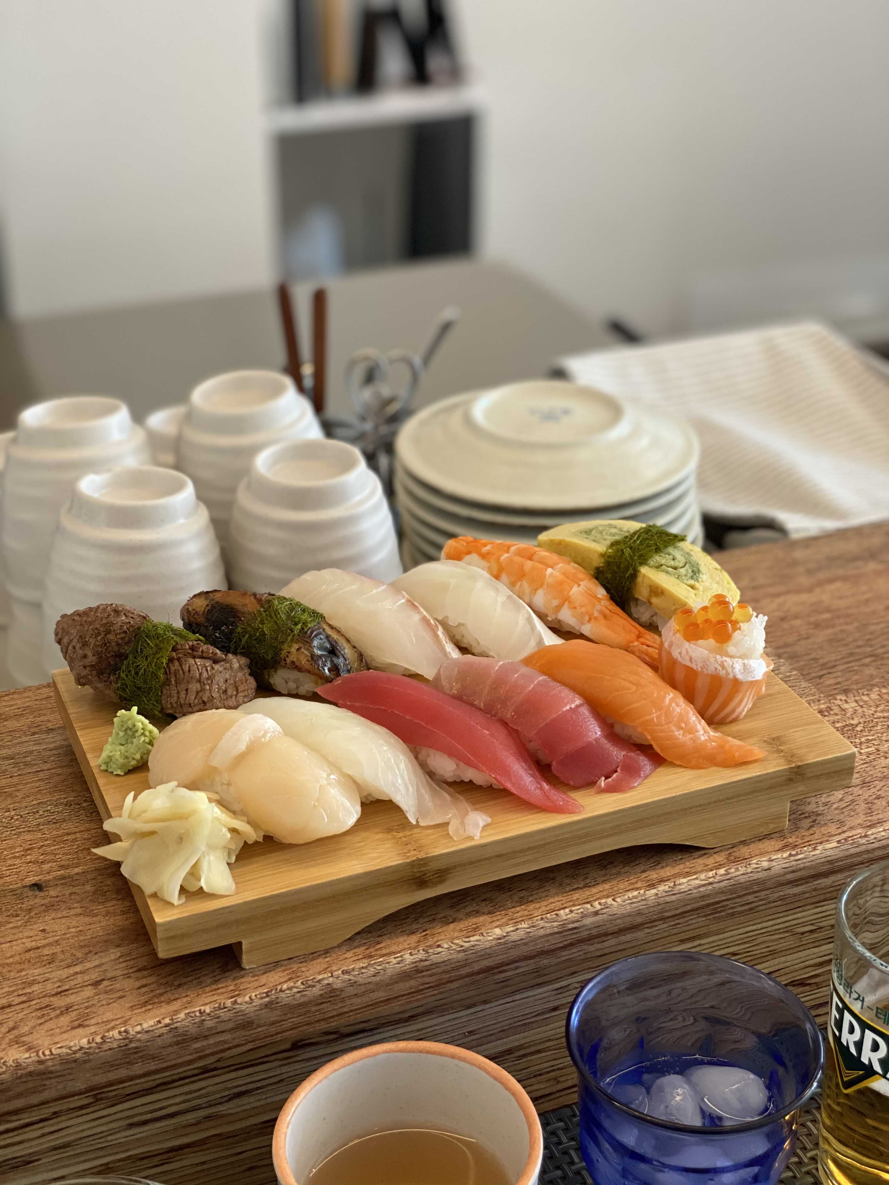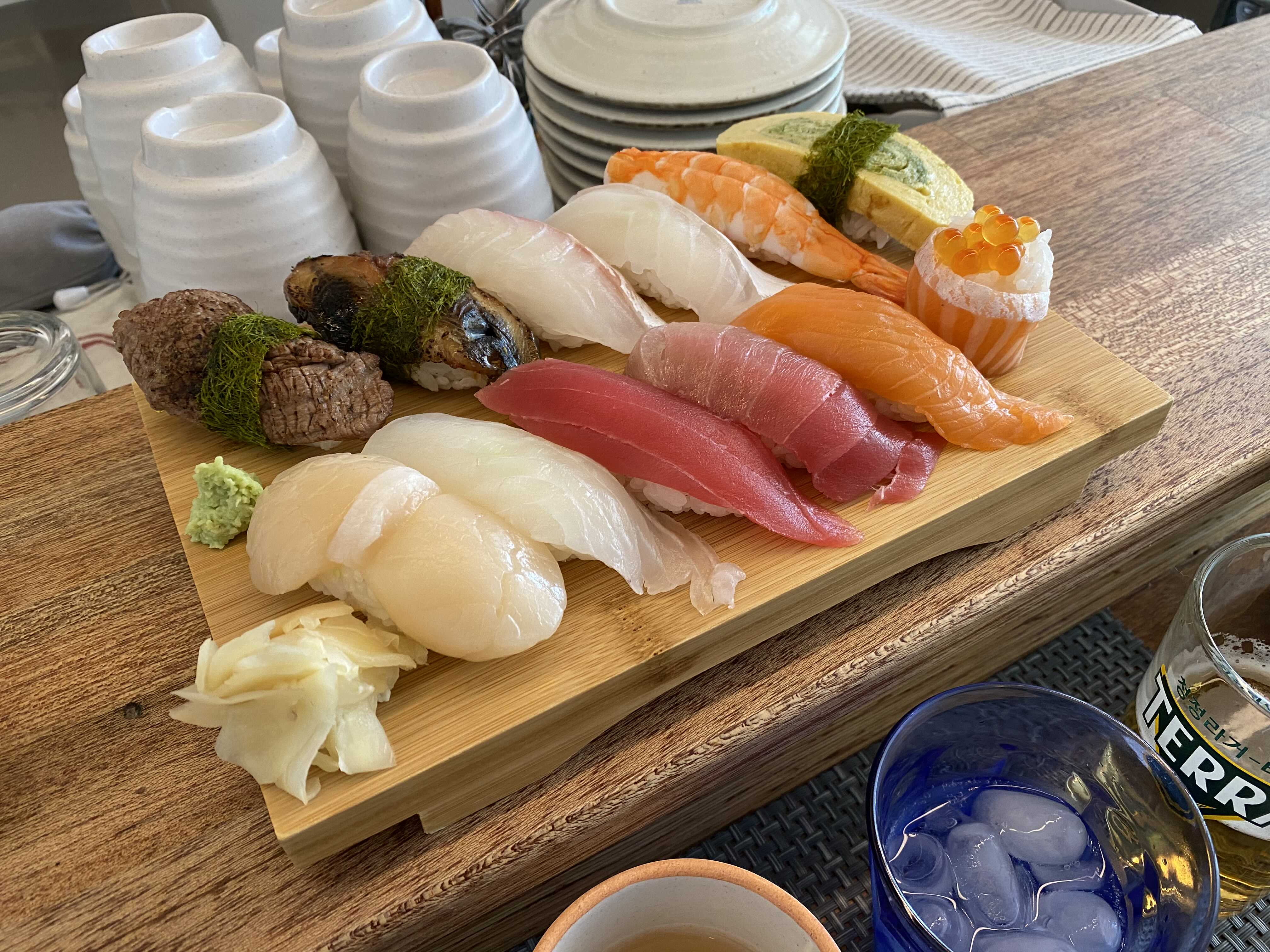 초밥 12피스 중에 두 점은 불을 이용해서 조리하는 초밥이라고 한다. 한 점은 장어, 다른 한 점은 소고기 초밥이가.