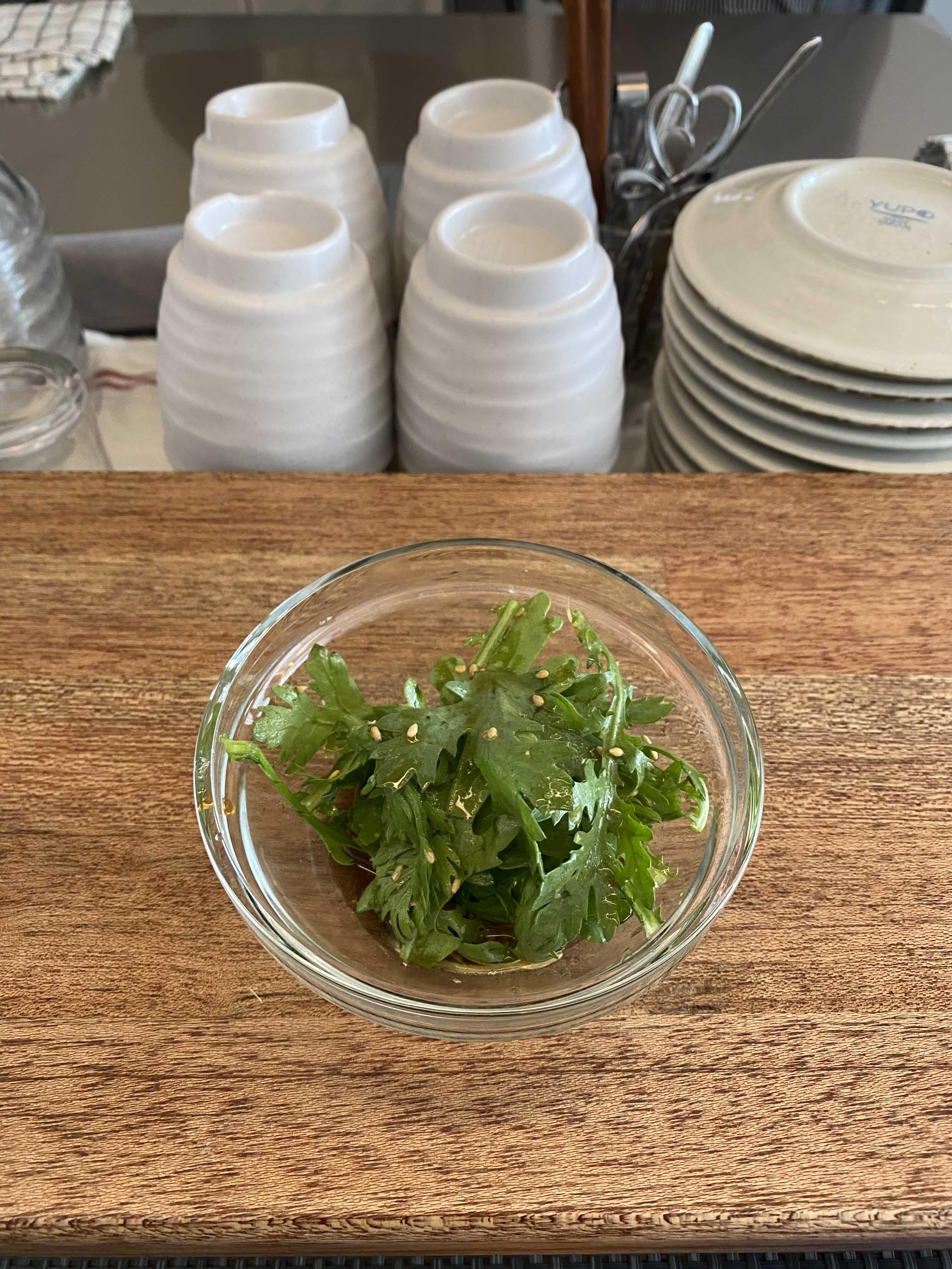 기다리는 동안에 쑥갓을 재료로 한 새콤한 드레싱을 내어준다.