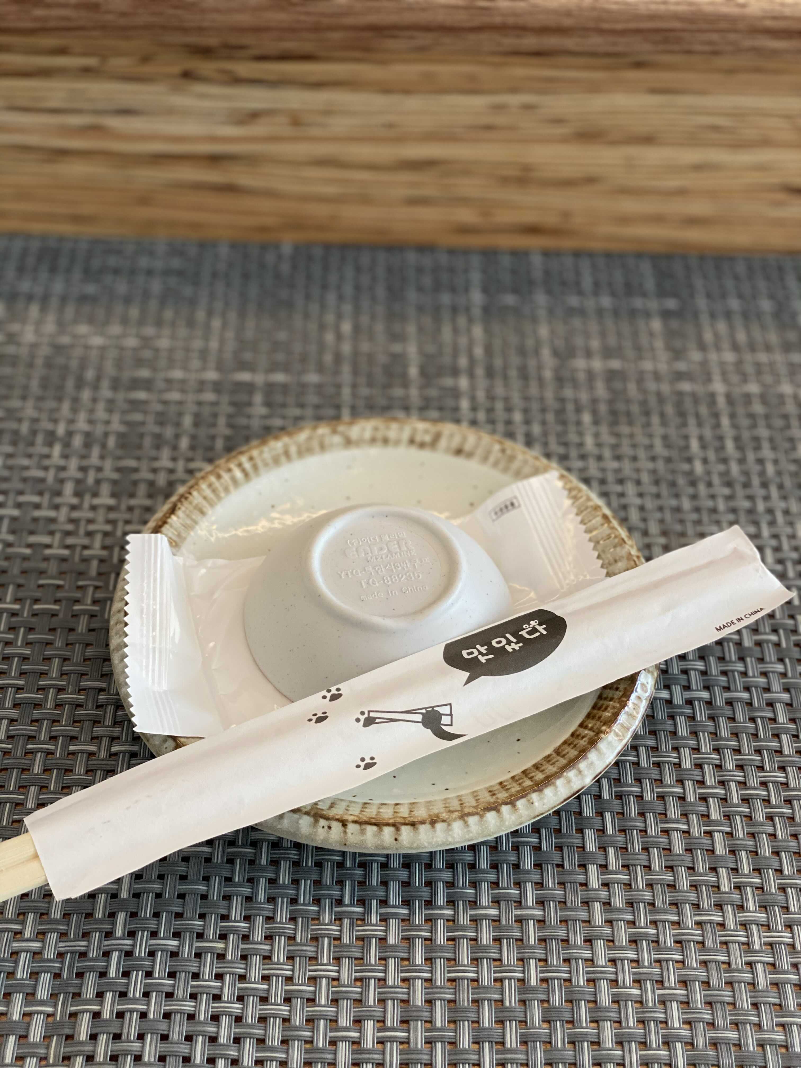 앞접시와 물티슈, 간장종지, 나무젓가락 기본 세팅.