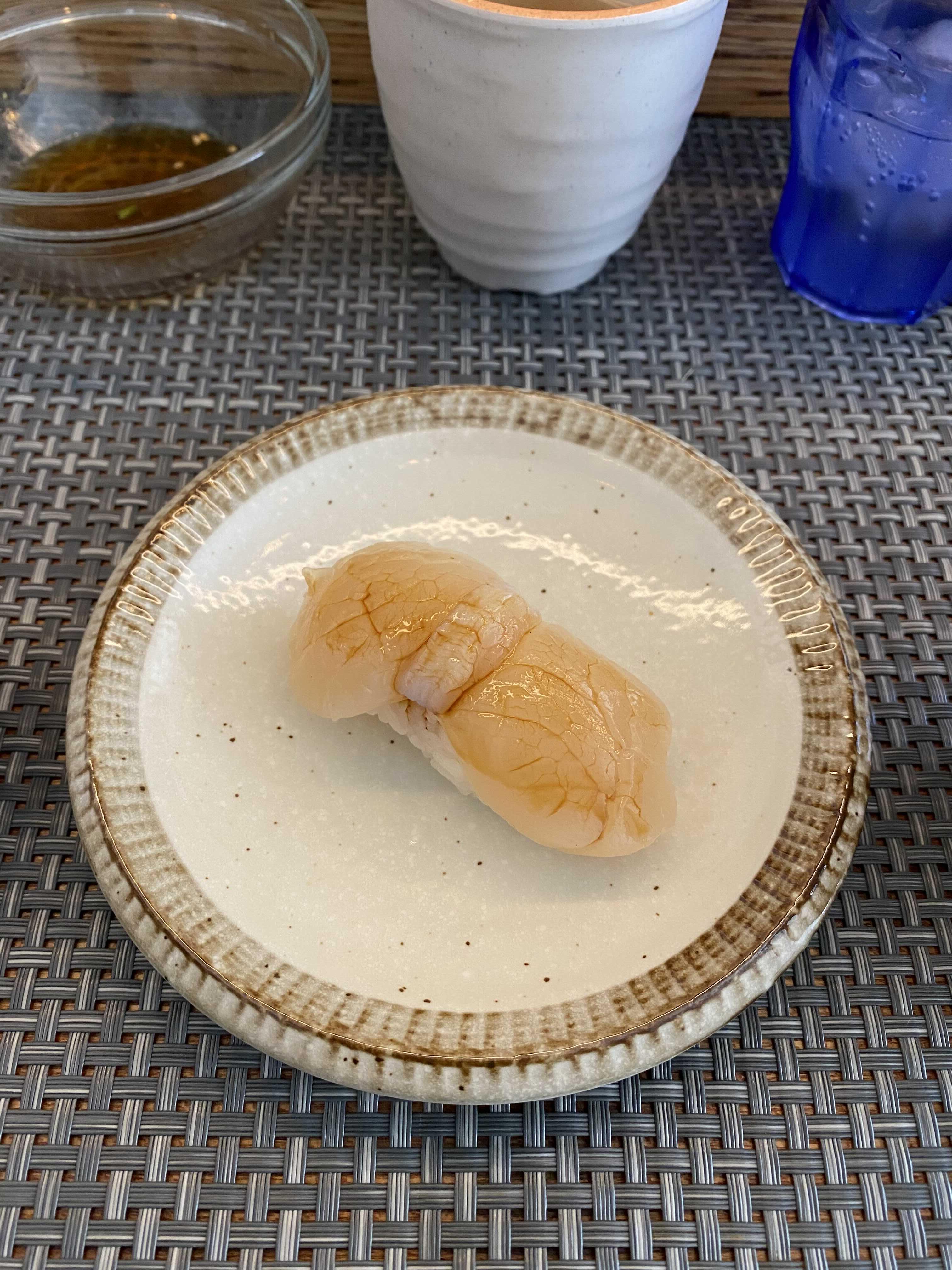 먼저 먹기를 추천한 가리비관자 초밥 부터. 초밥을 집어 앞접시에 놓고, 생강 한 점 간장에 적셔서 초밥에 발라 먹으면 에도마에스타일의 스시 먹는 기분을 낼 수도 있다.