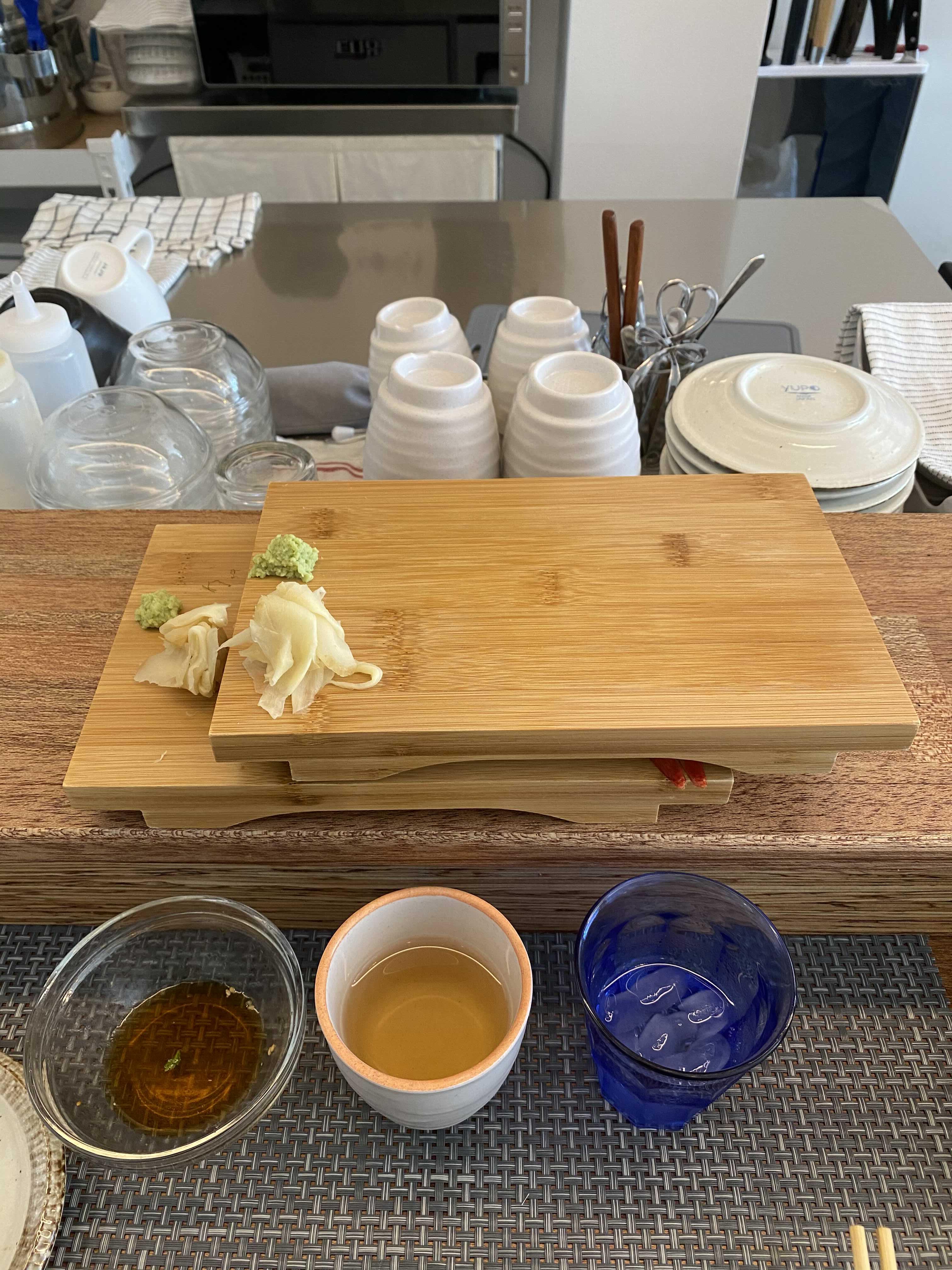 앞접시와 물티슈, 간장종지, 나무젓가락 기본 세팅.