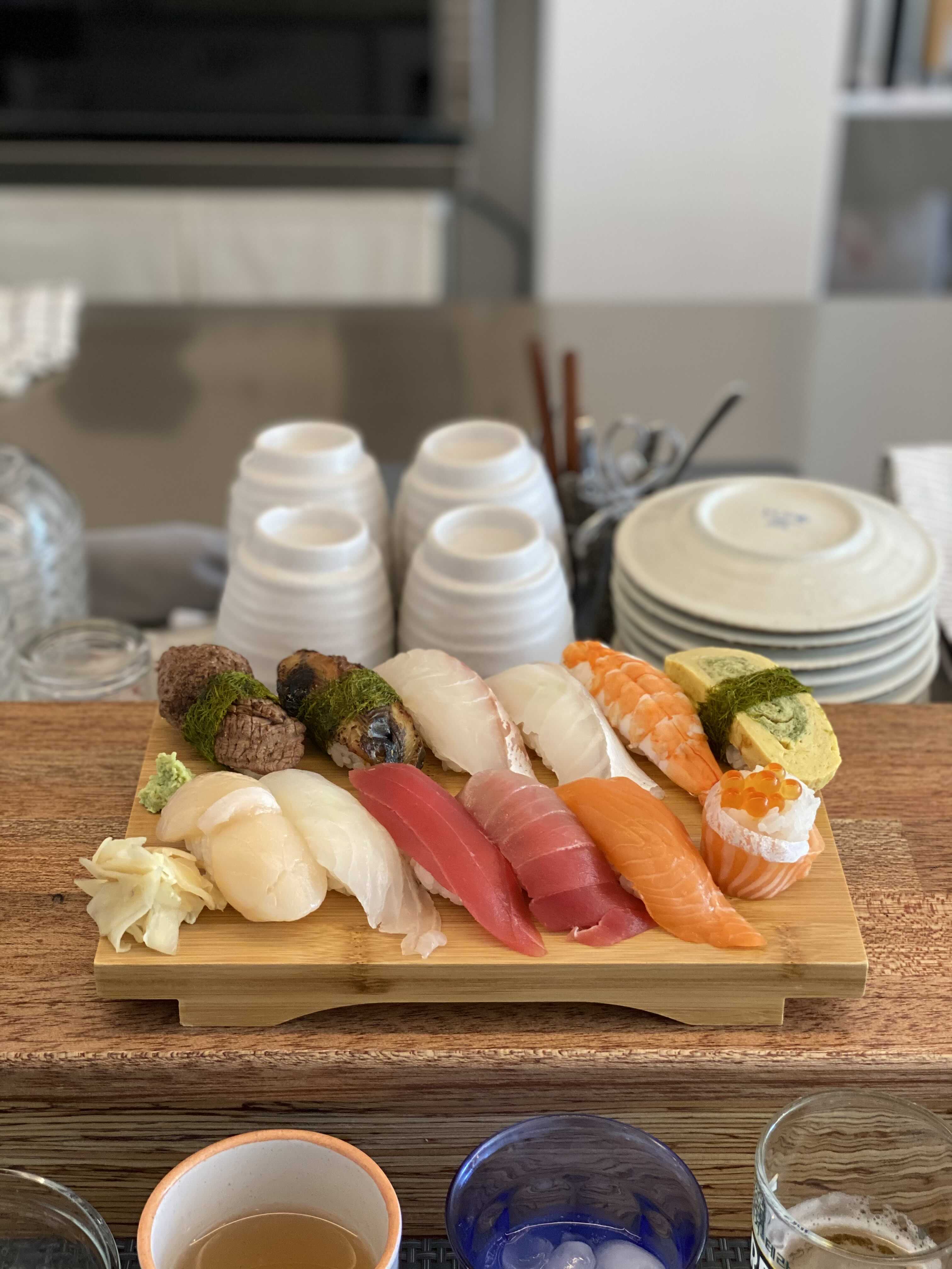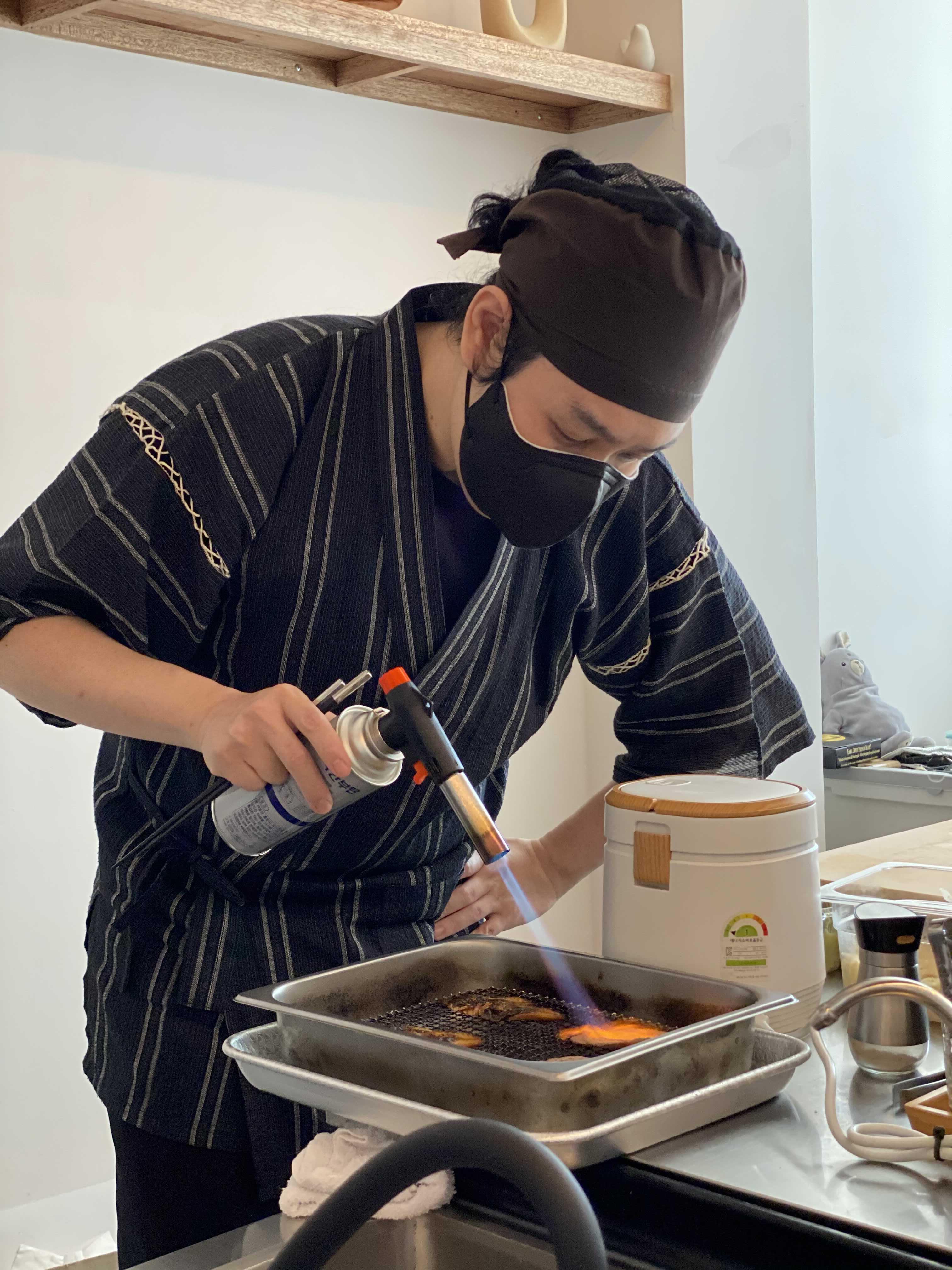초밥 12피스 중에 두 점은 불을 이용해서 조리하는 초밥이라고 한다. 한 점은 장어, 다른 한 점은 소고기 초밥이가.