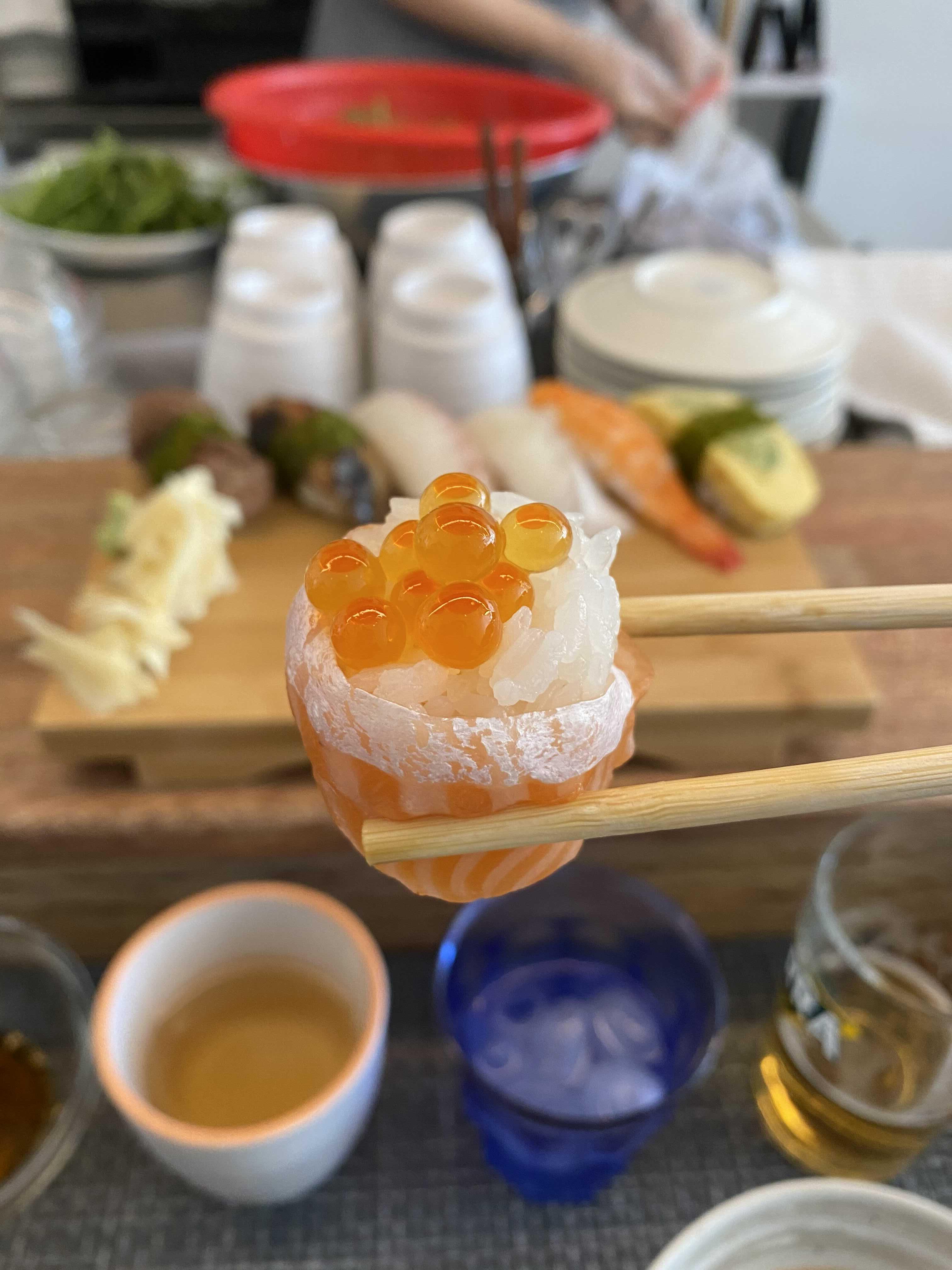 김밥처럼 연어로 밥을 말아 감싸고 위엔 연어알을 올렸다.