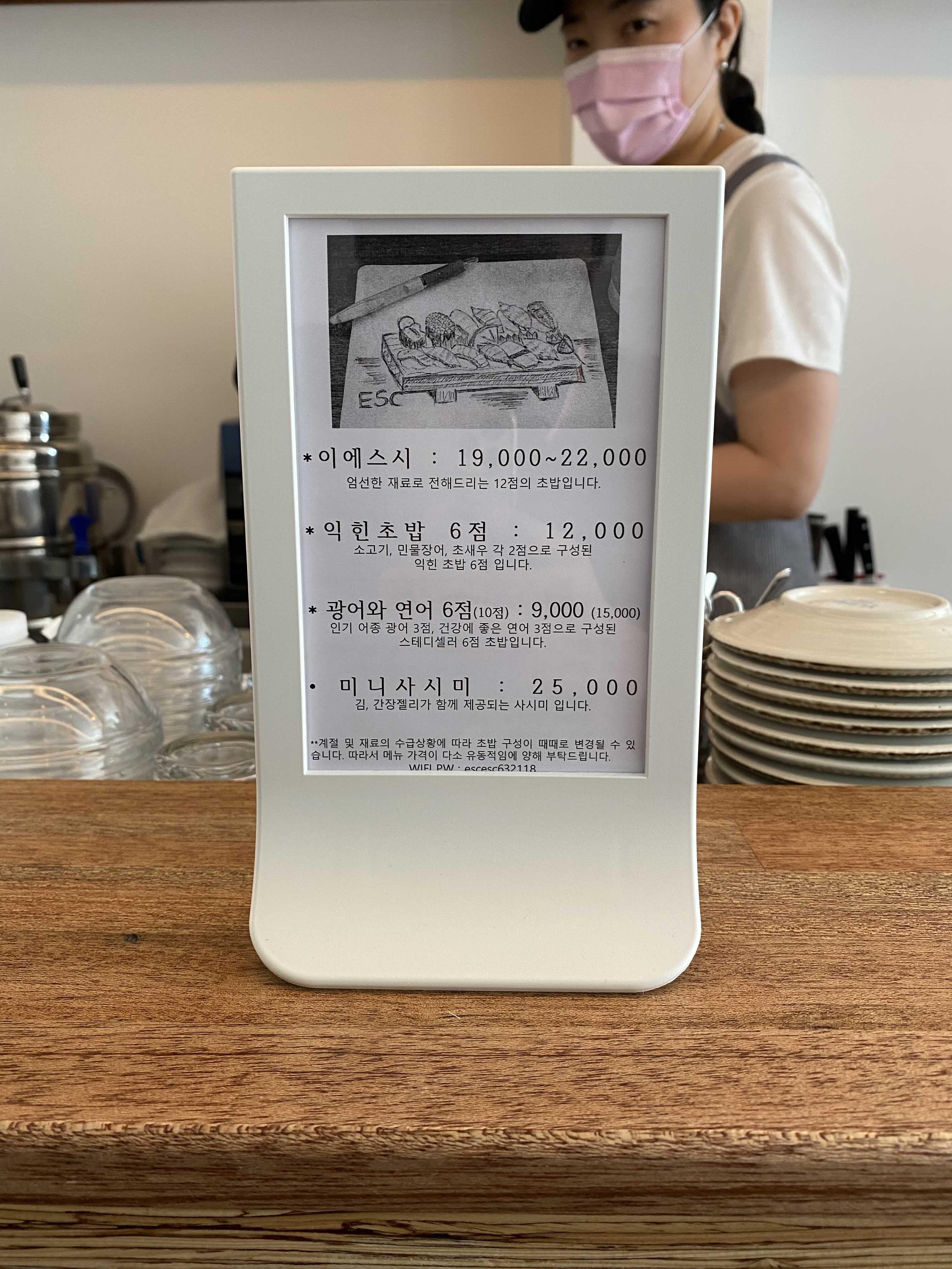 시그니처는 이에스시. 금액은 19,000원에서 22,000원 그날그날 사입한 재료의 원가에 따라 가격의 변동이 있다고 한다. 이 날은 초밥 한 판에 22,000원.