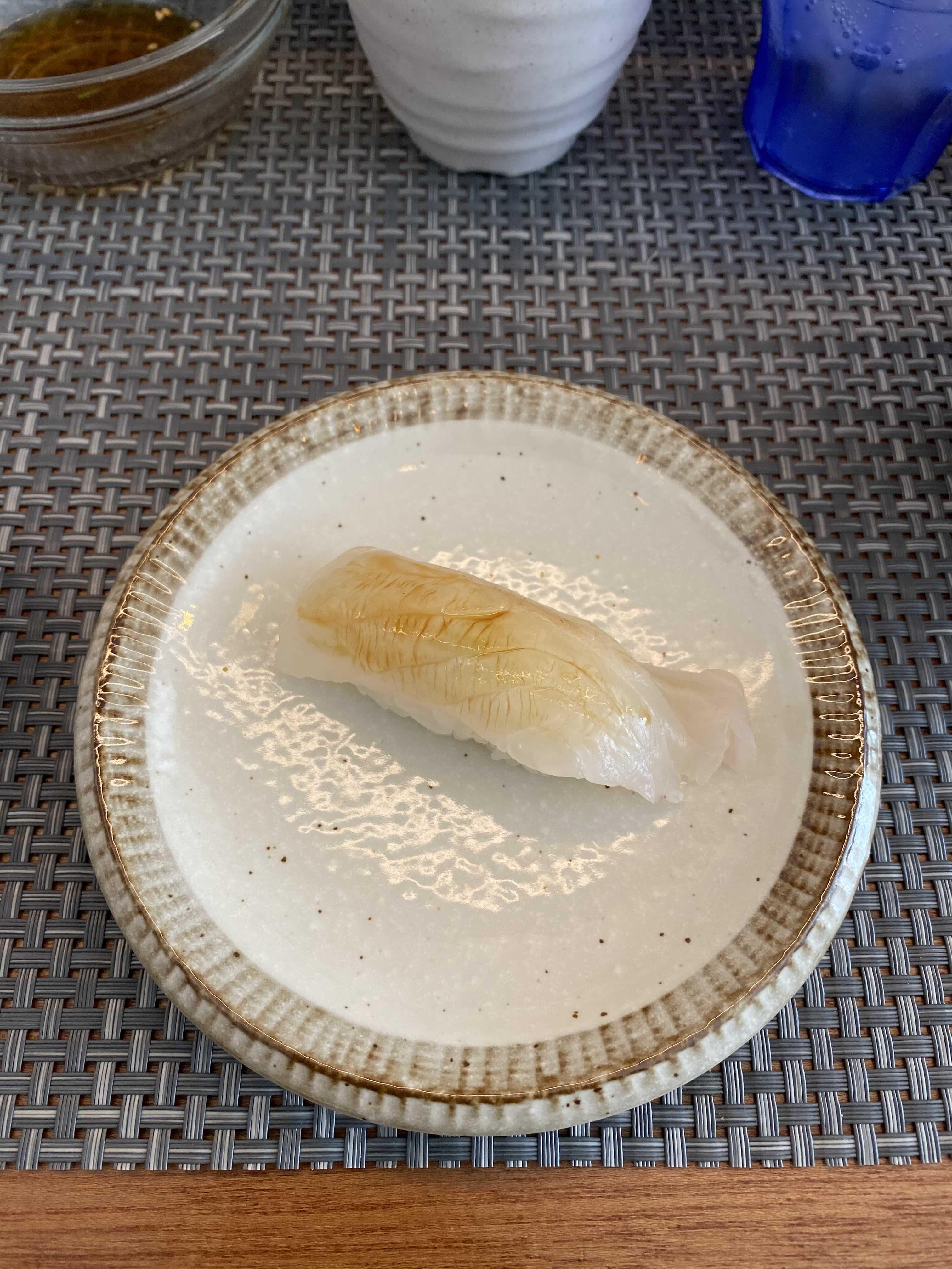 먼저 먹기를 추천한 가리비관자 초밥 부터. 초밥을 집어 앞접시에 놓고, 생강 한 점 간장에 적셔서 초밥에 발라 먹으면 에도마에스타일의 스시 먹는 기분을 낼 수도 있다.