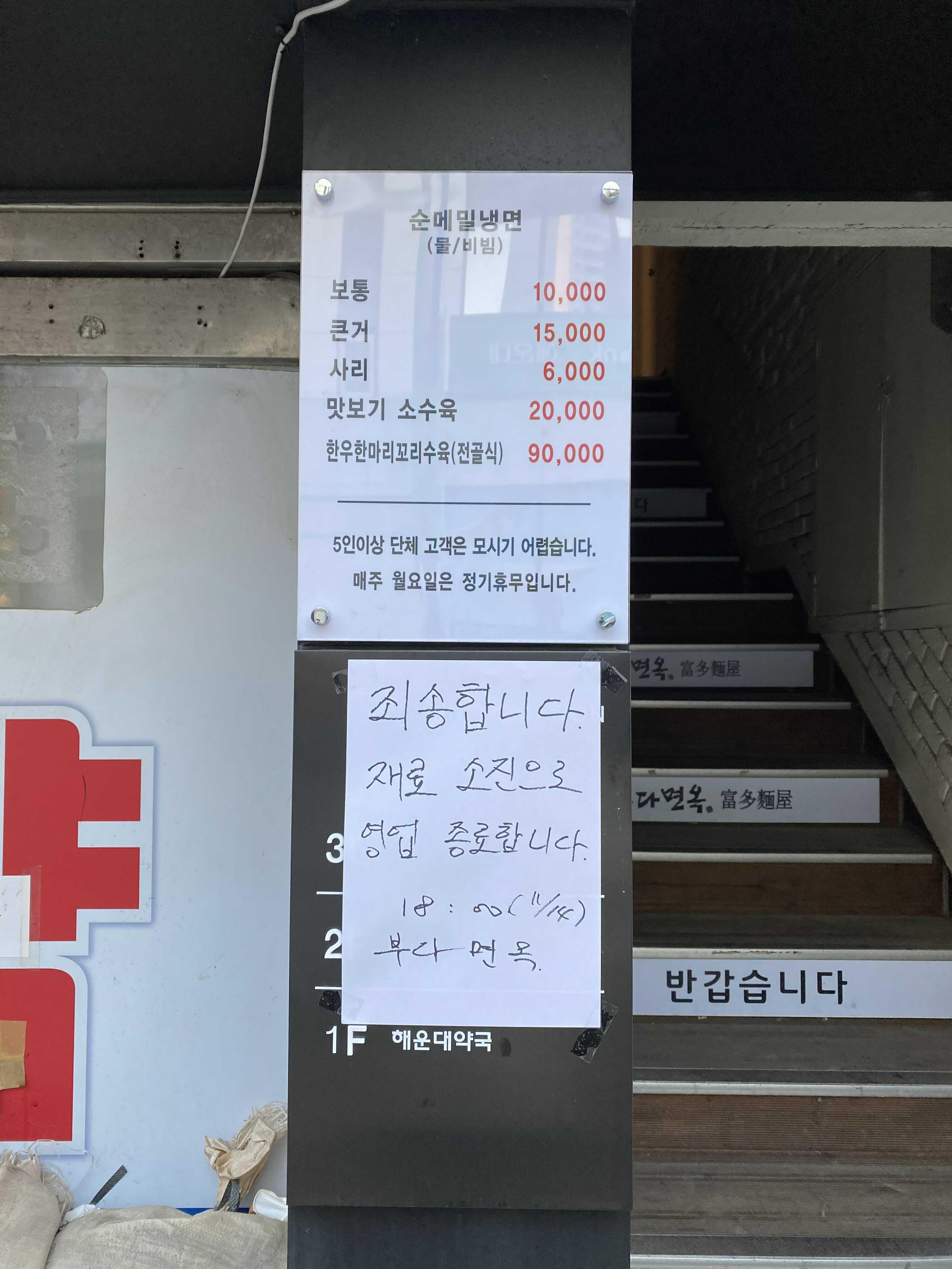한우꼬리수육에 물냉면 두 그릇, 비빔면 한 그릇을 둘이서 싹 비웠다. 해장하기에도 소주한잔 하기에도 좋은 부다면옥. 이제 접근성도 좋아졌으니 더 자주 올 수 있을 듯.