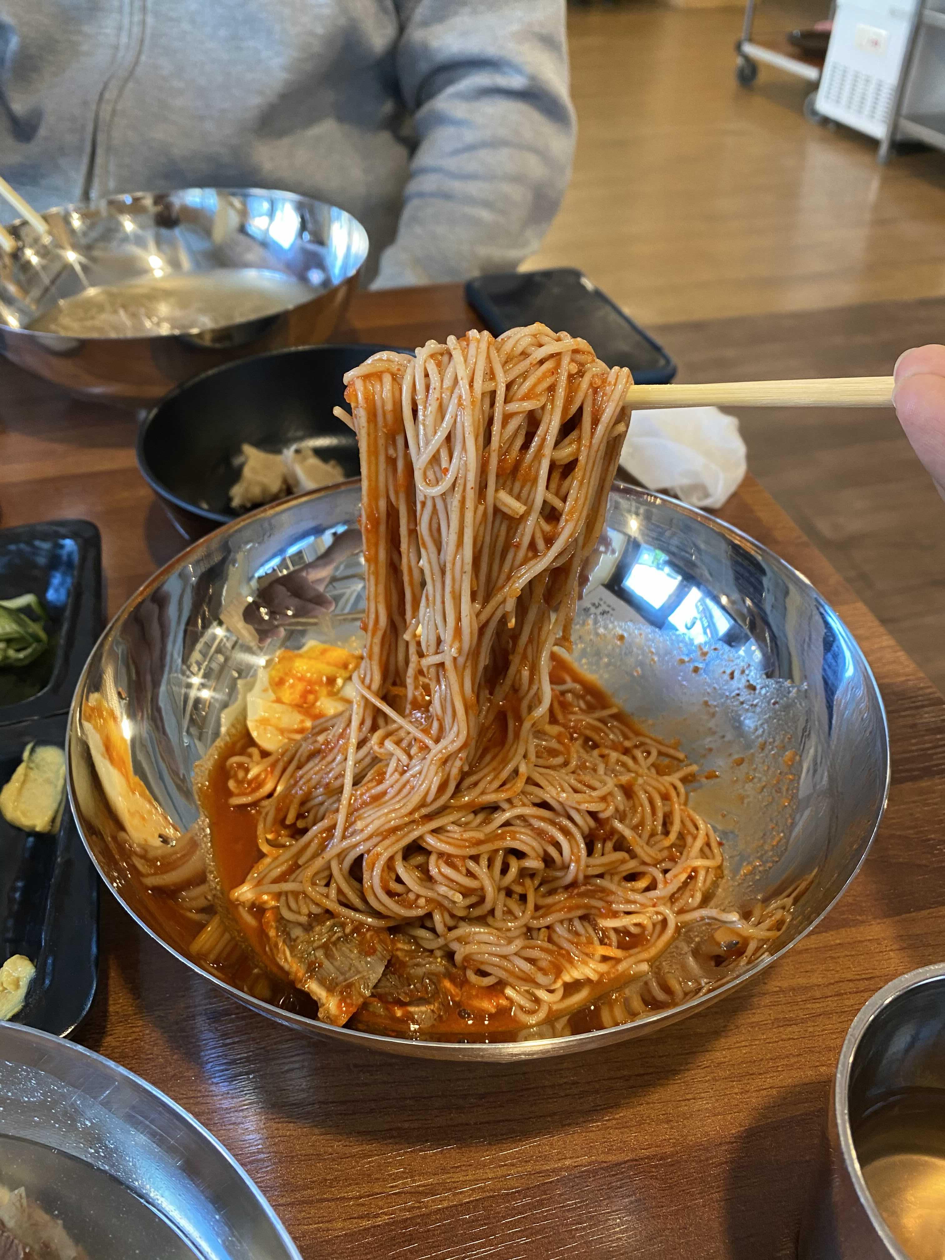 소주한잔 하고 있을 때 순메밀냉면도 나왔다.