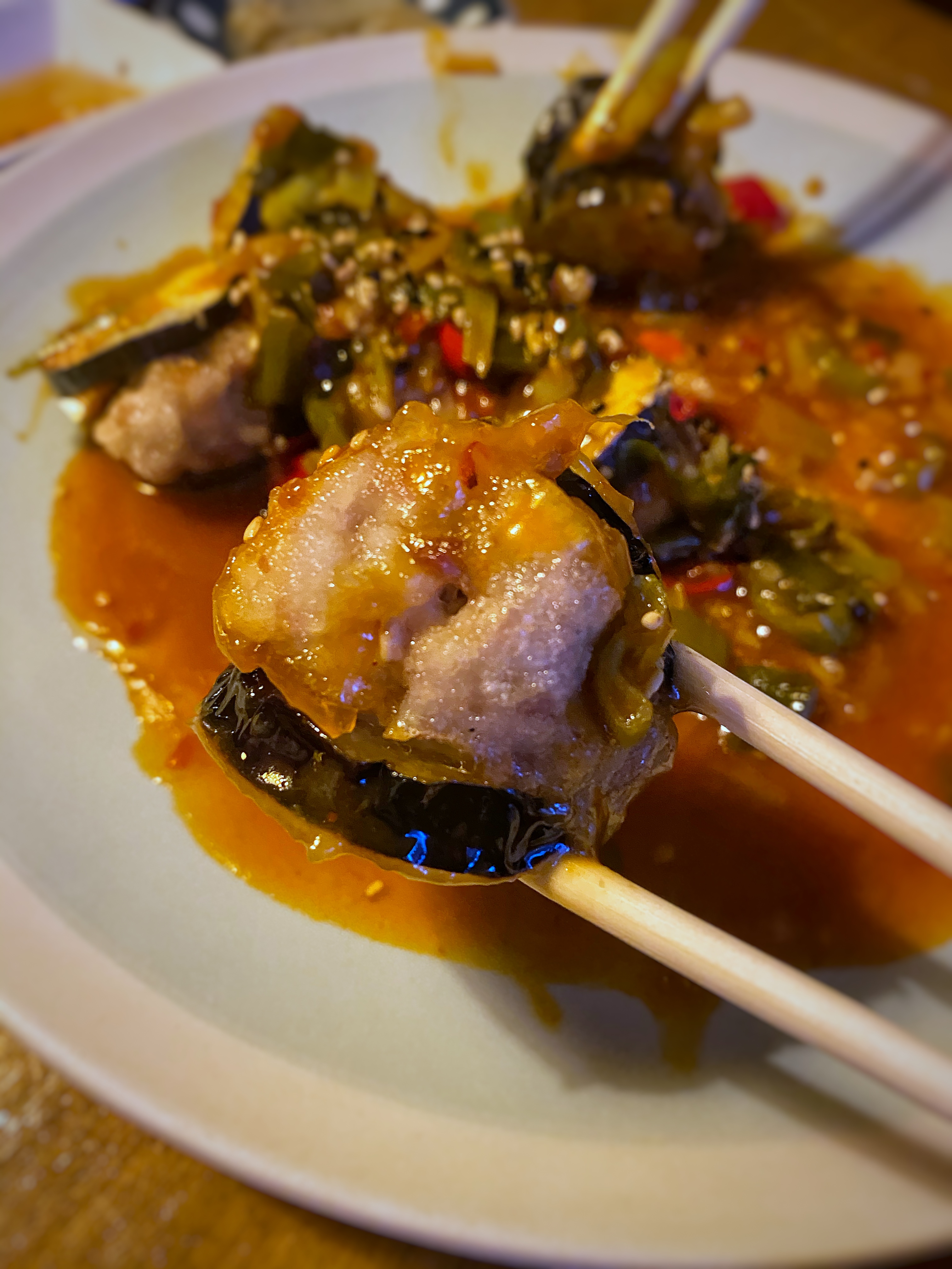 가지만두같은 느낌이랄까. 가지 두 조각 사이에 다진고기를 넣고 튀겼다. 뿌려진 소스는 살짝 매콤.