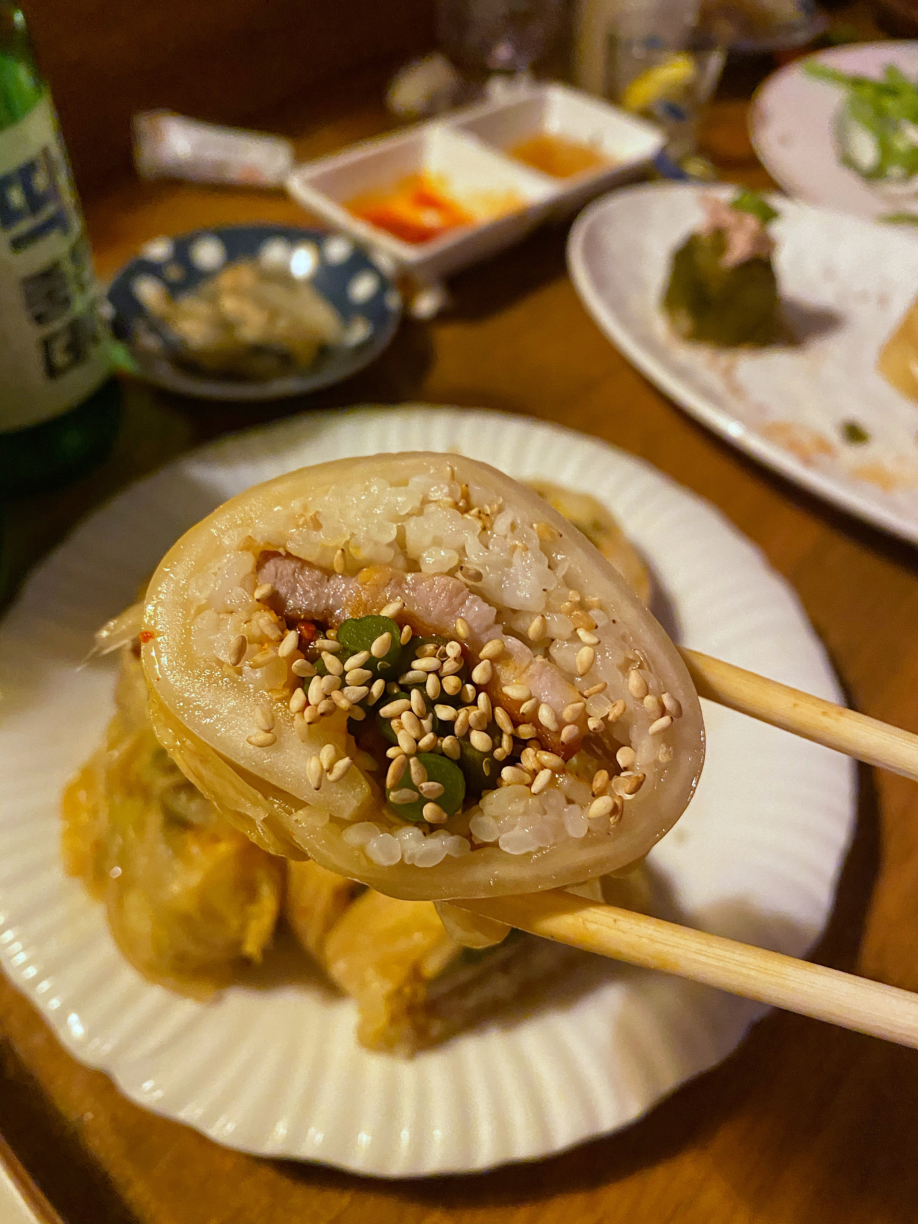 묵은지를 김처럼 활용하고, 밥 안에 삼겹살과 마늘쫑이 자리잡고 있다.