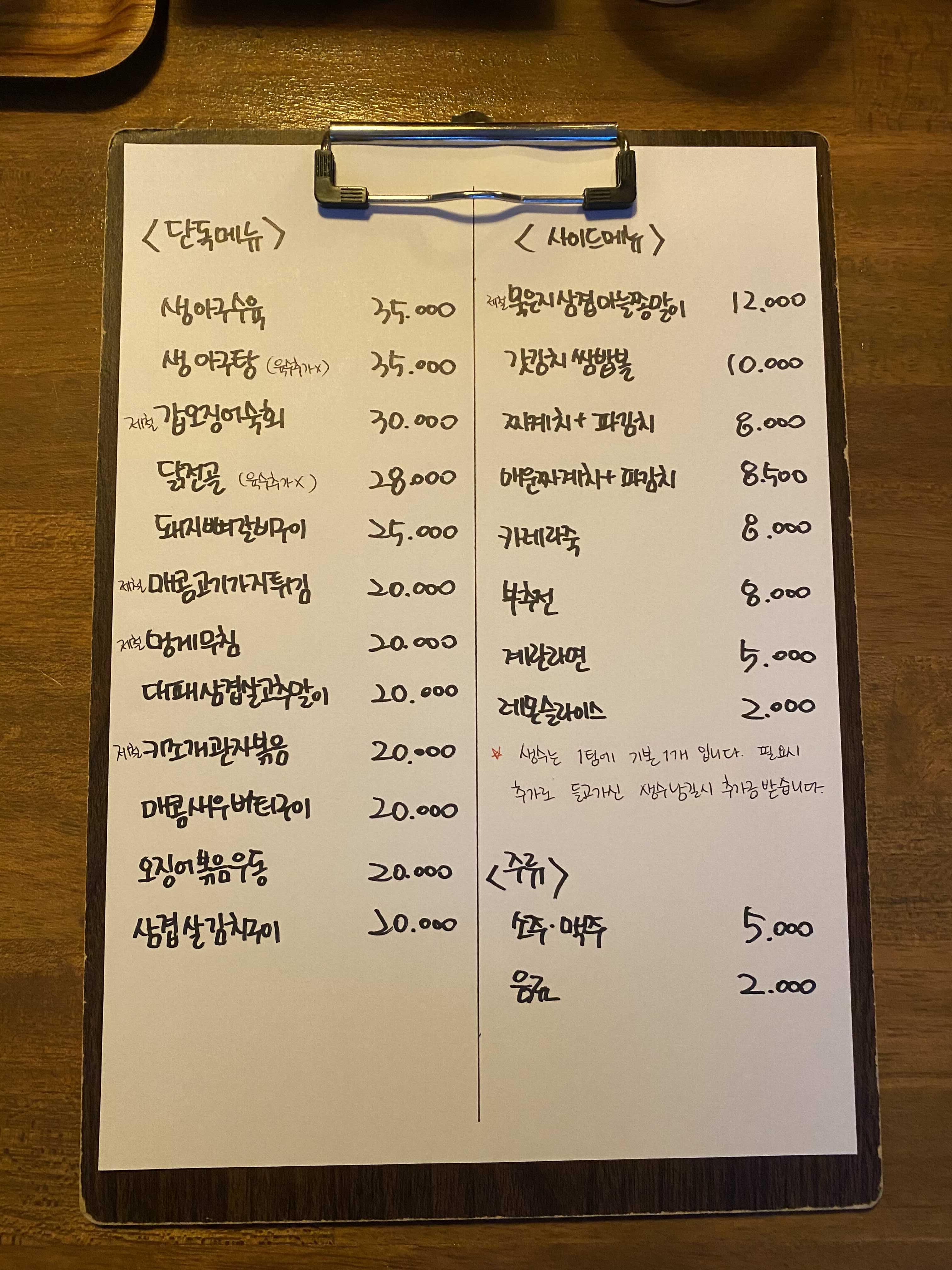 메뉴는 수시로 바뀐다. 그 날 장을 본 재료에 따라 계절에 따라 바뀌는데 시그니처 메뉴인 짜계치를 제외하고는 세 번의 방문에서 같은 메뉴를 먹어본 적이 없다.