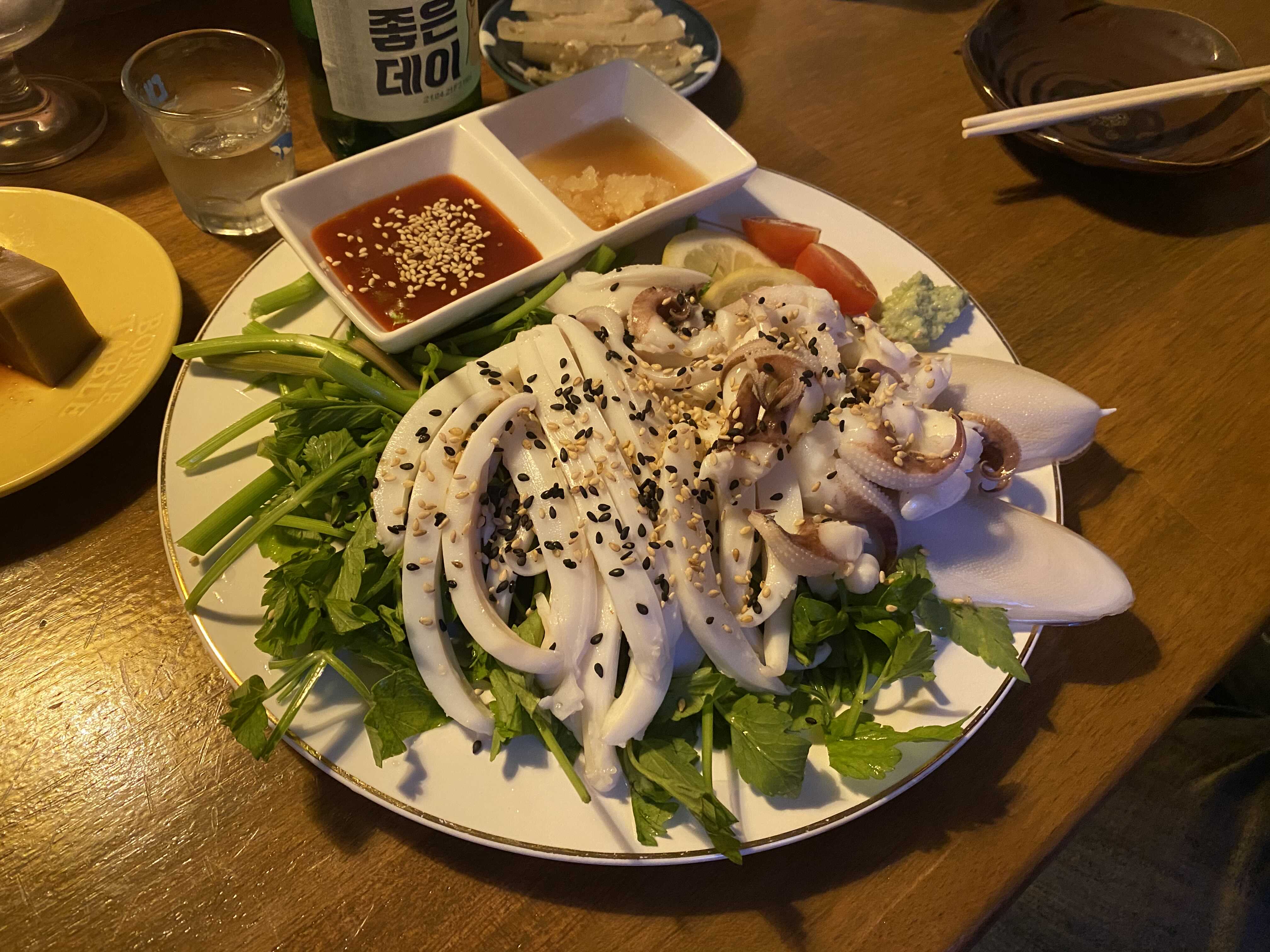 도토리묵과 무나물을 안주로 소주한잔 기울이며 갑오징어숙회를 주문했다.