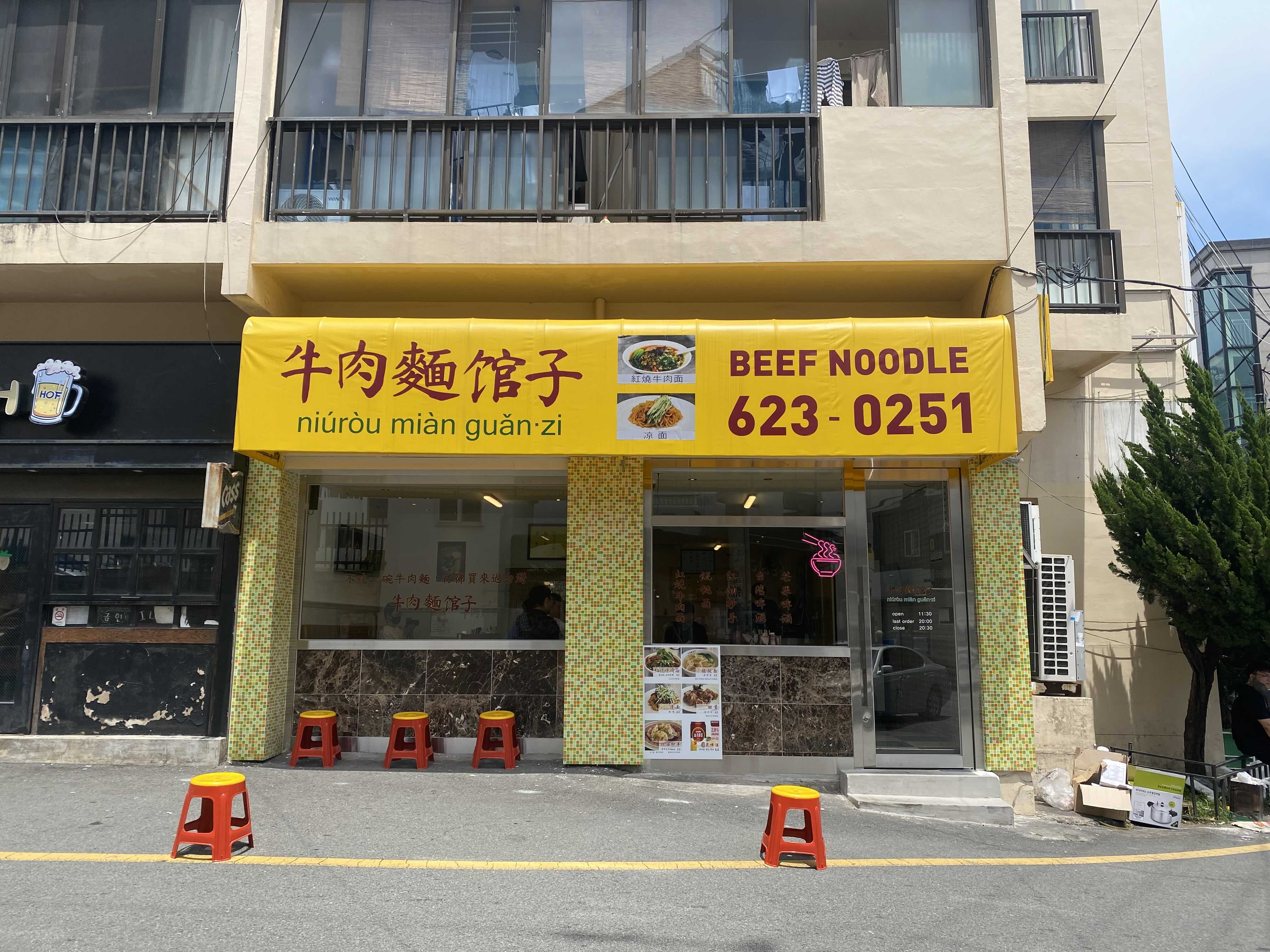 노란색 간판에 "우육면관자"라는 글자와 발음기호, 비프 누들이라고 적혀있는데 한글은 안보인다.