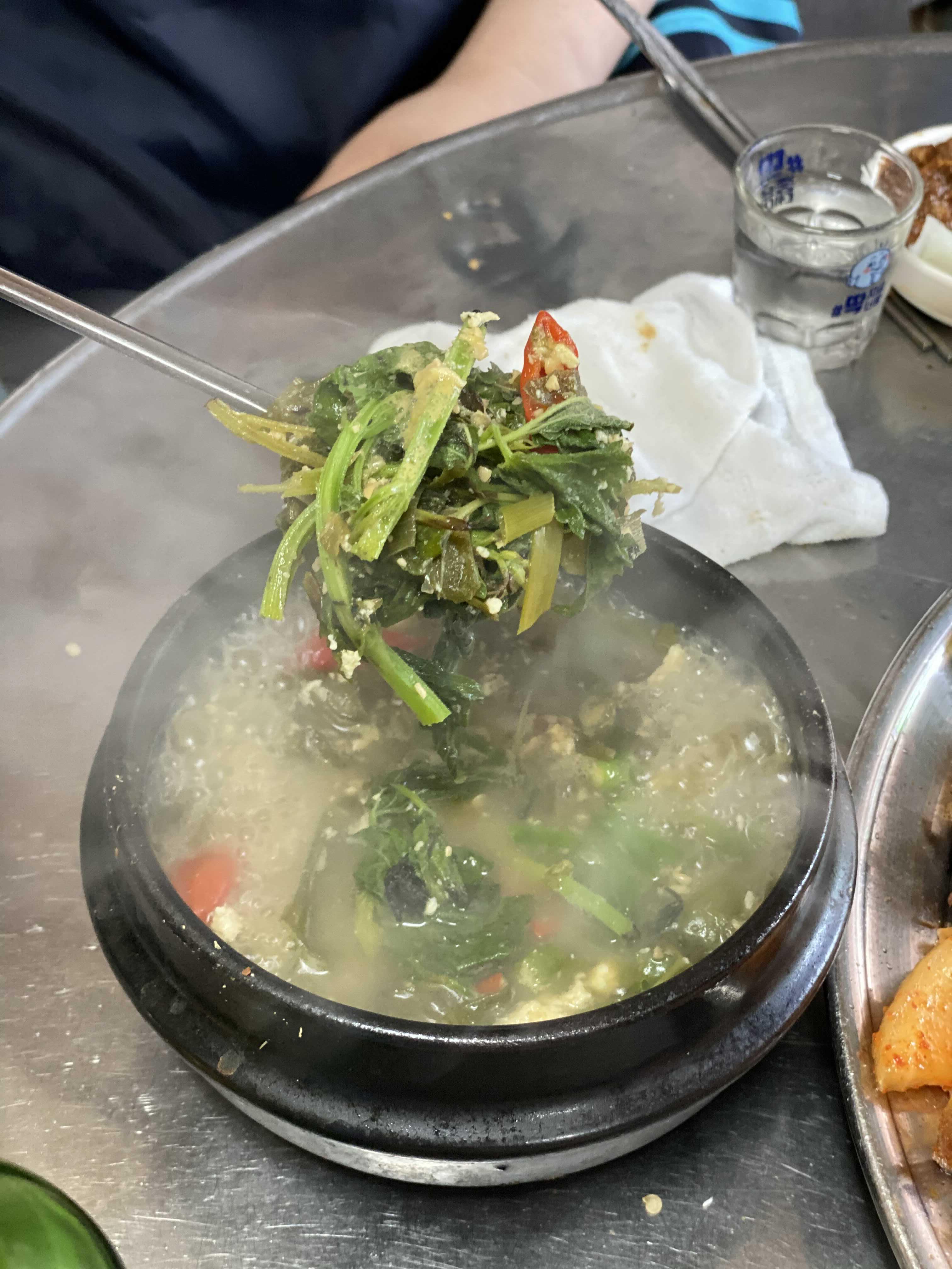 먹는 중에 보글보글 끓는 뚝배기가 나온다. 방아향이 진하게 올라오는 된장찌개다.