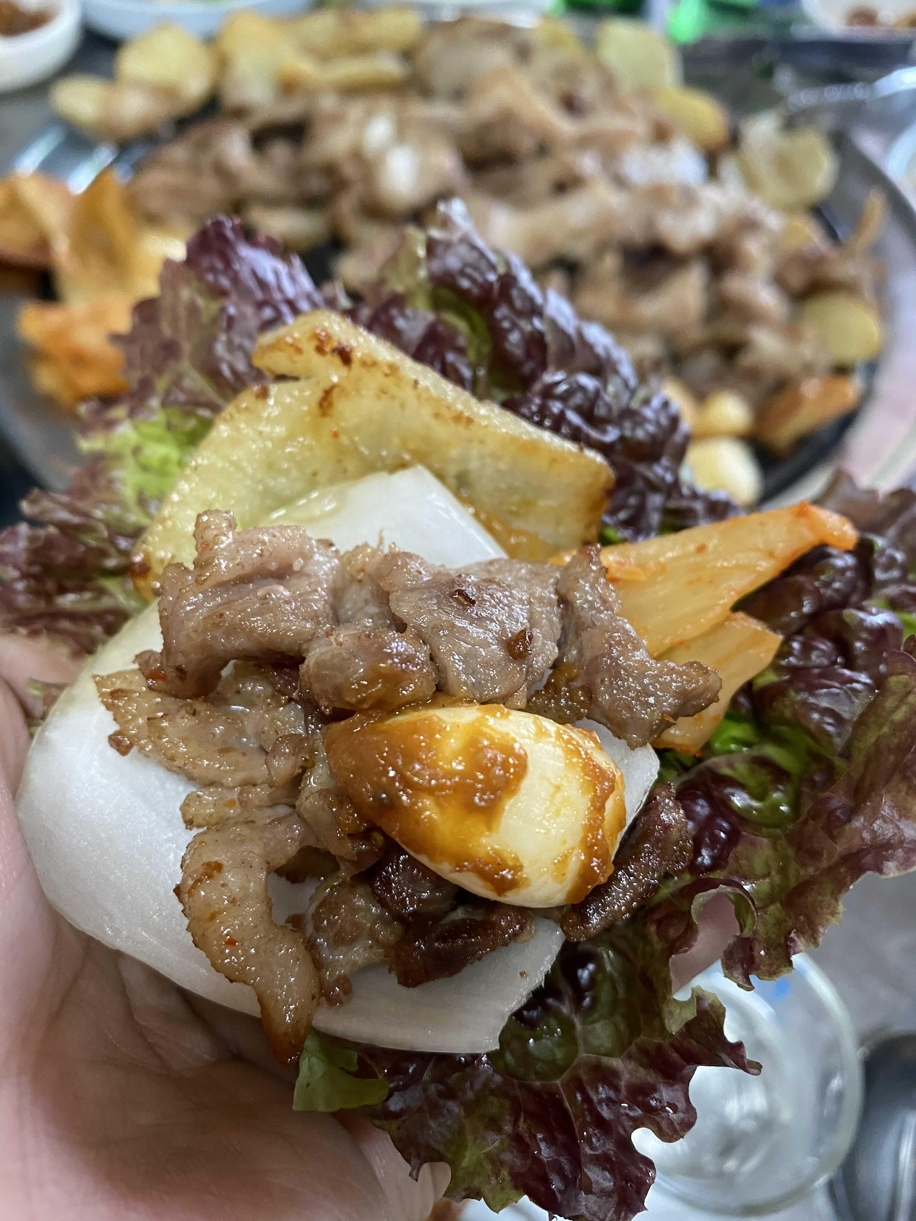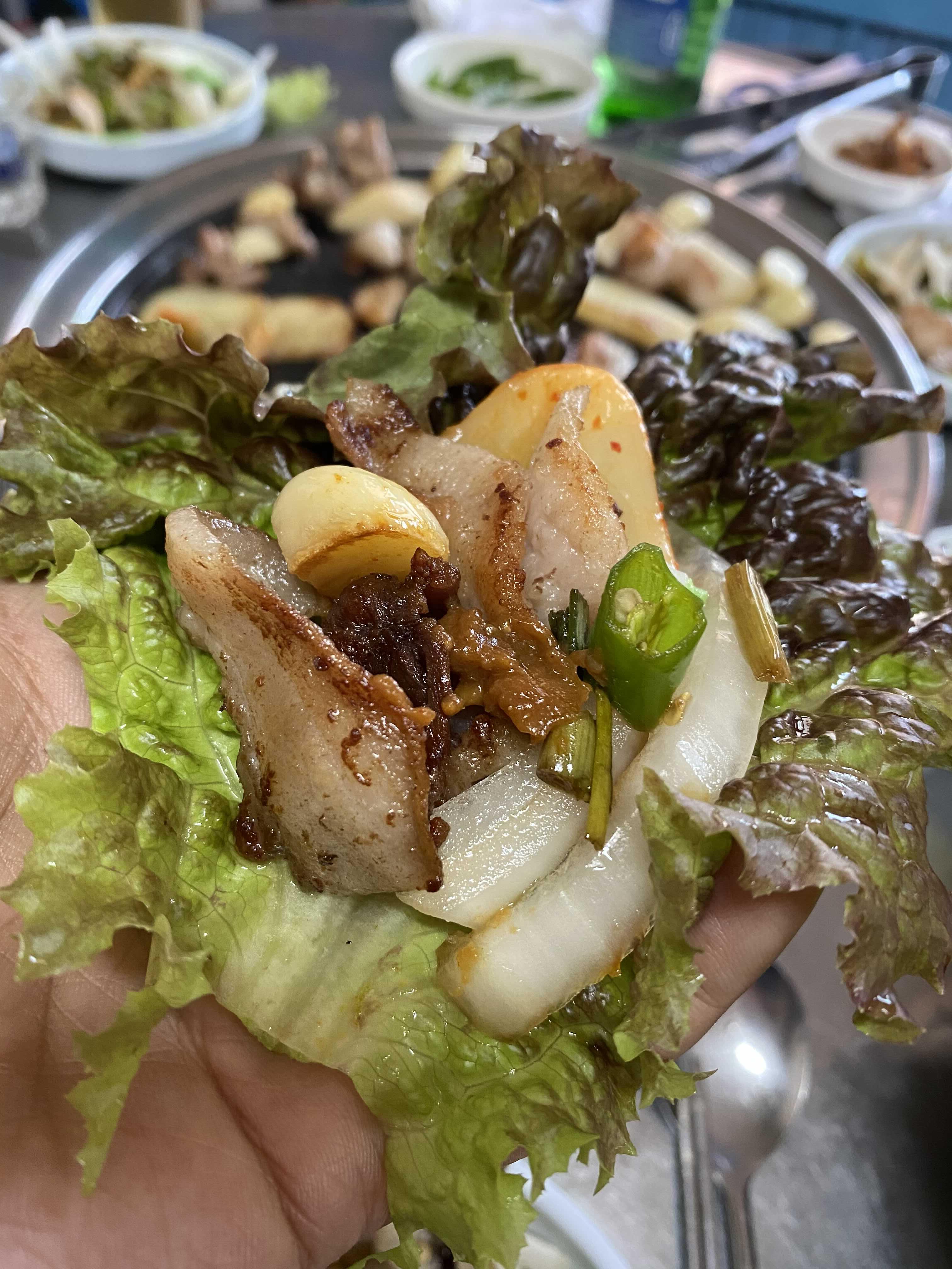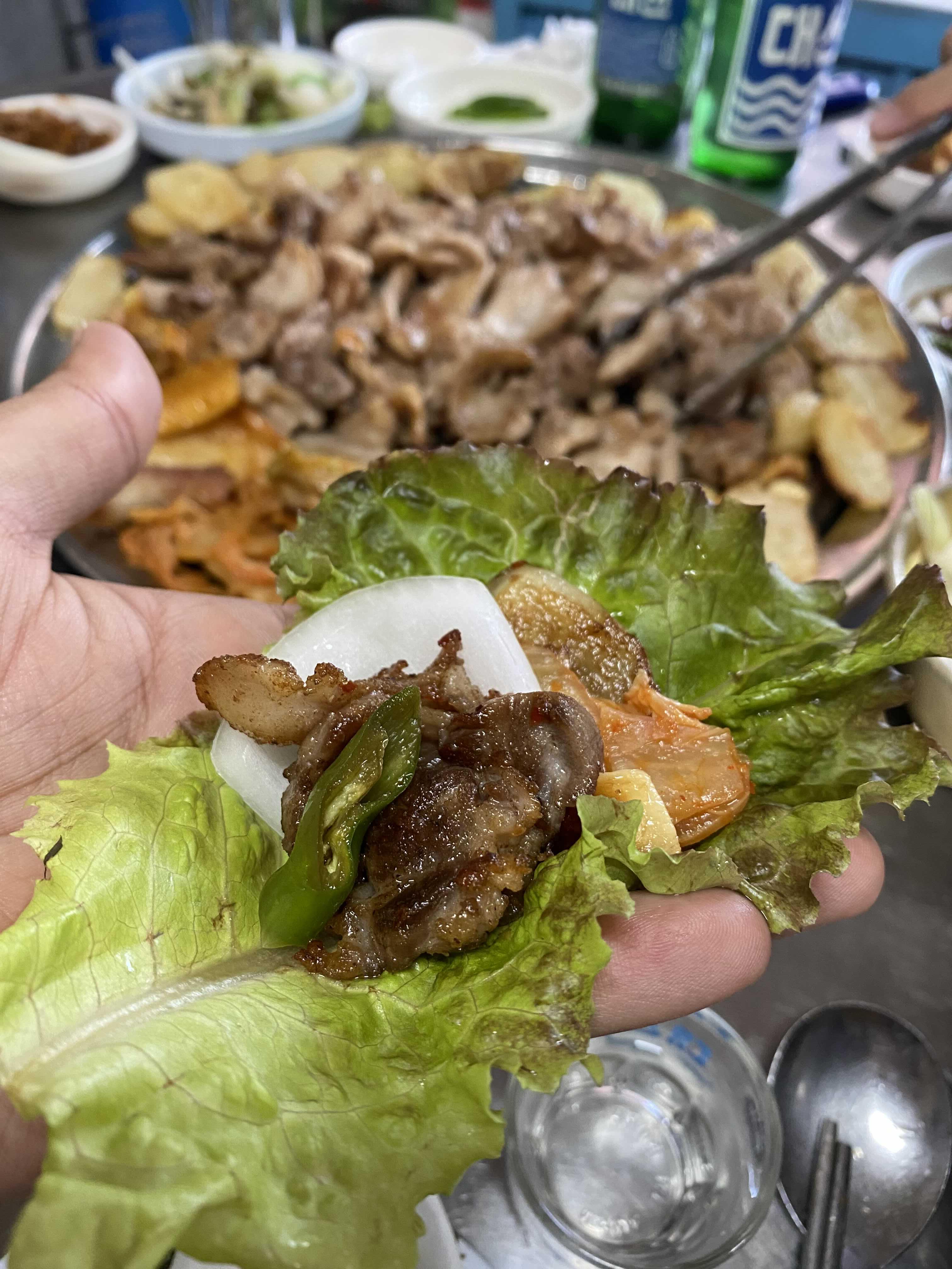 구운김치, 양파, 된장에 박힌 마늘까지. 이렇게 싸 먹으면 고기도 술도 쭉쭉 들어간다.