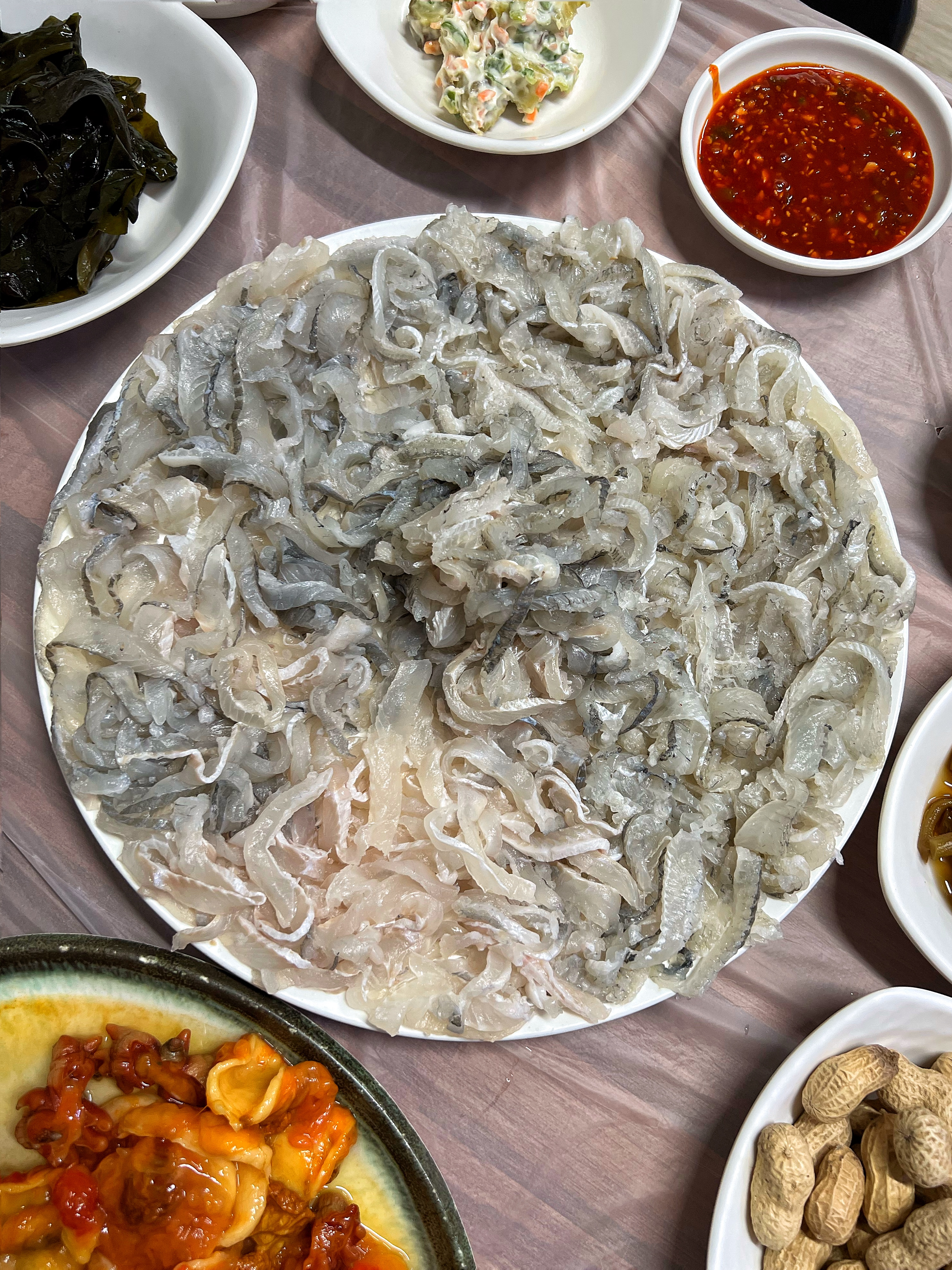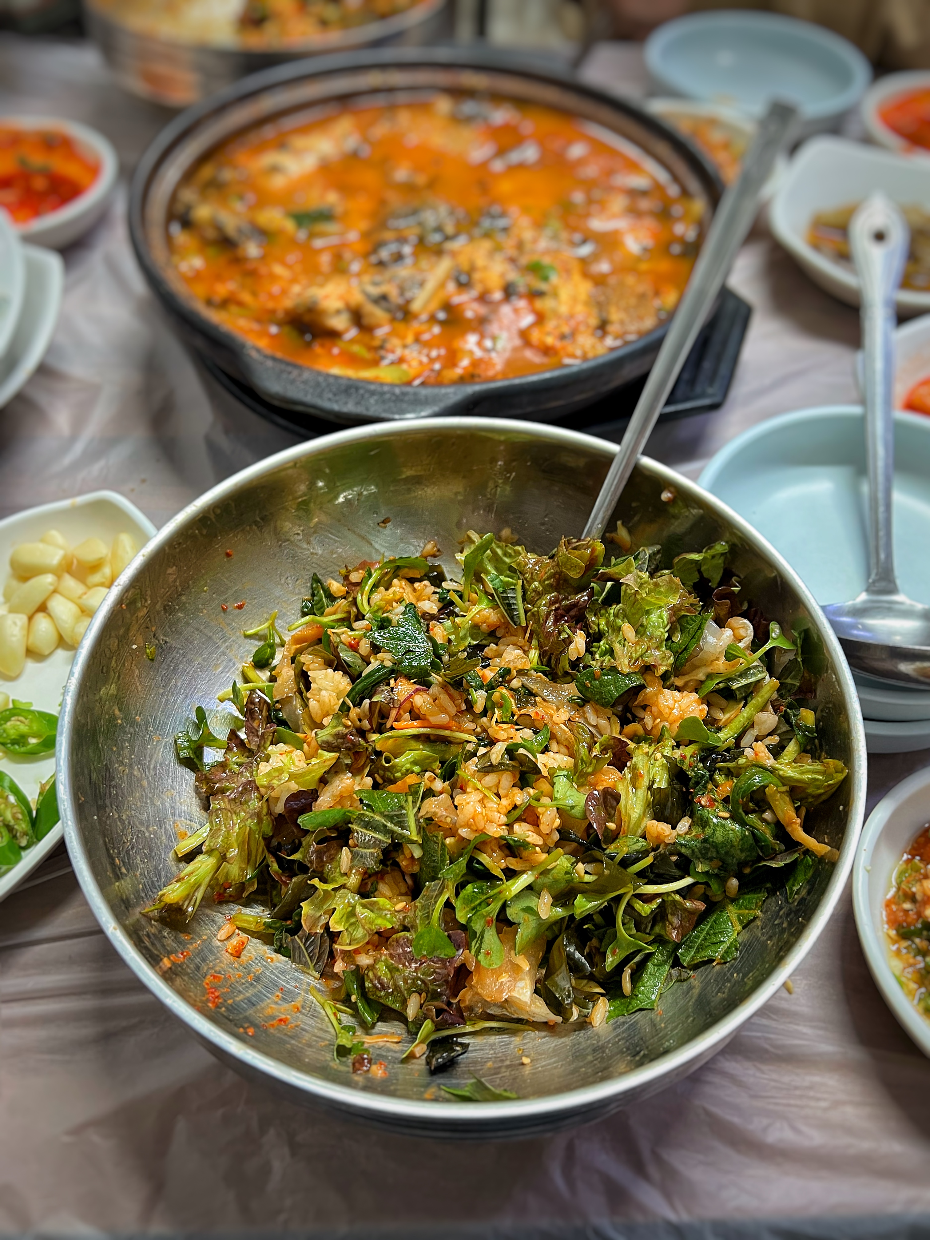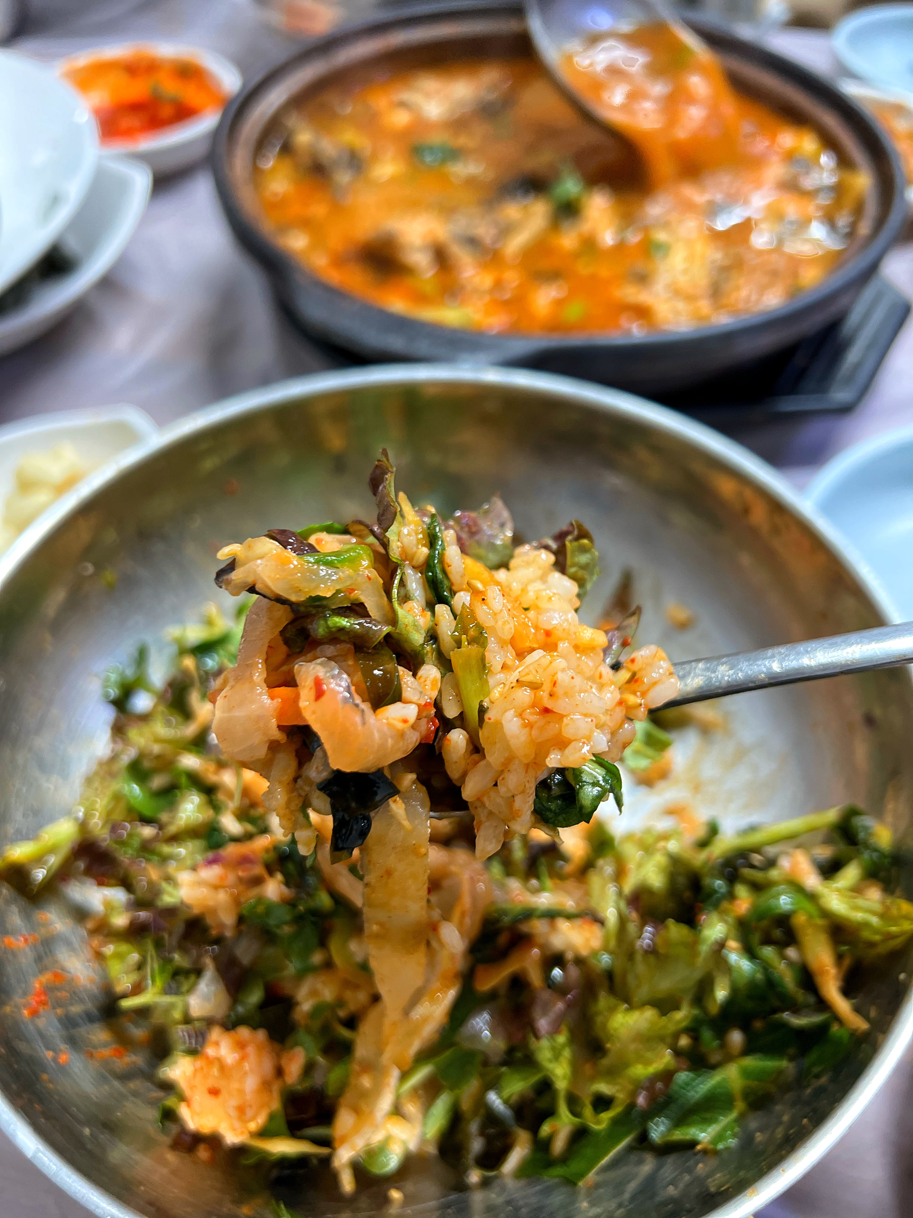 식사에 따라 나오는 나물과 남은 곁들임을 이것저것 넣고 회를 올리니 맛깔스럽다.