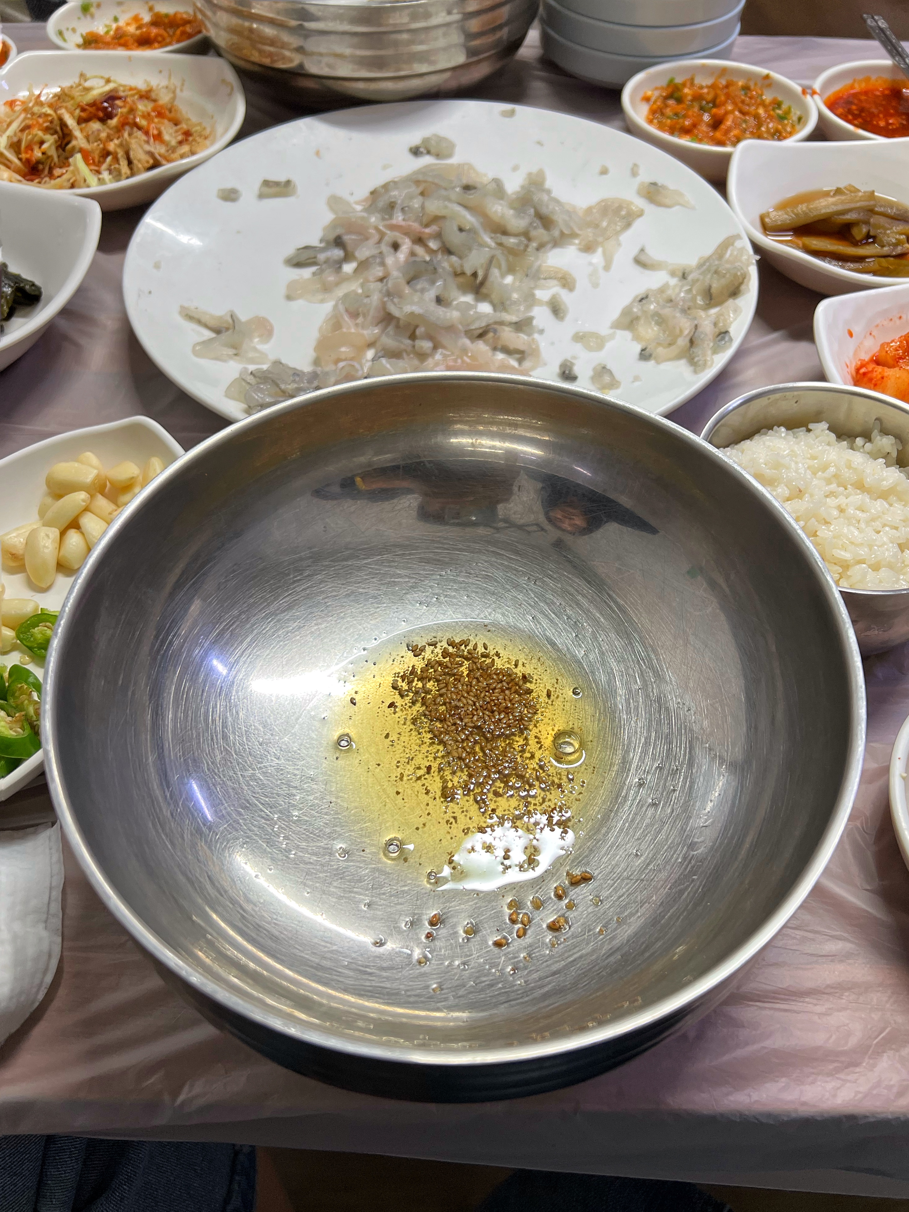 회를 조금 남기고 매운탕과 공깃밥을 주문한다. 남은 회는 또 비벼서 먹으면 제맛이 아닌가. 그래서 대접을 부탁드리니 참기름과 깨소금을 담아 같이 내어주신다.