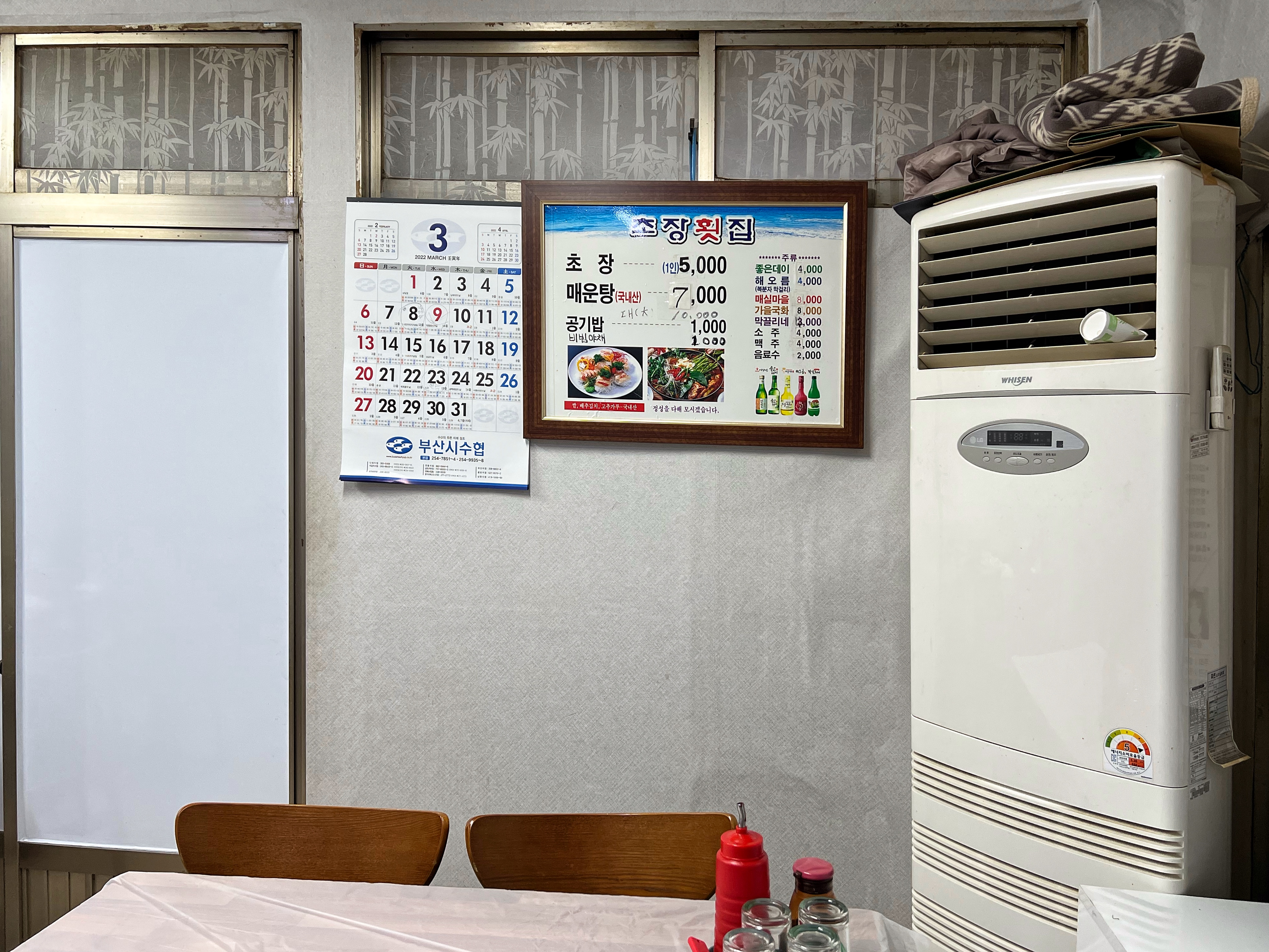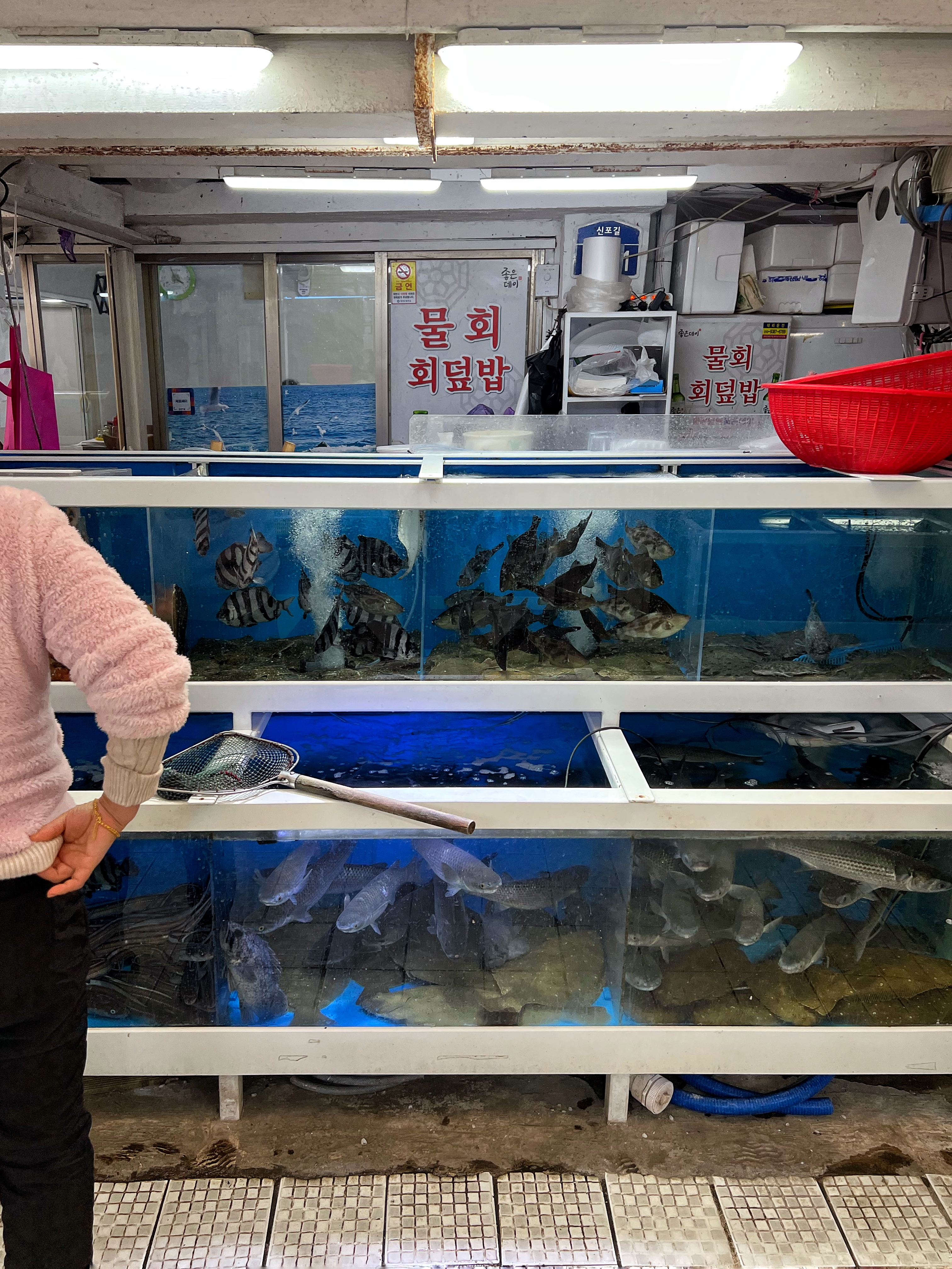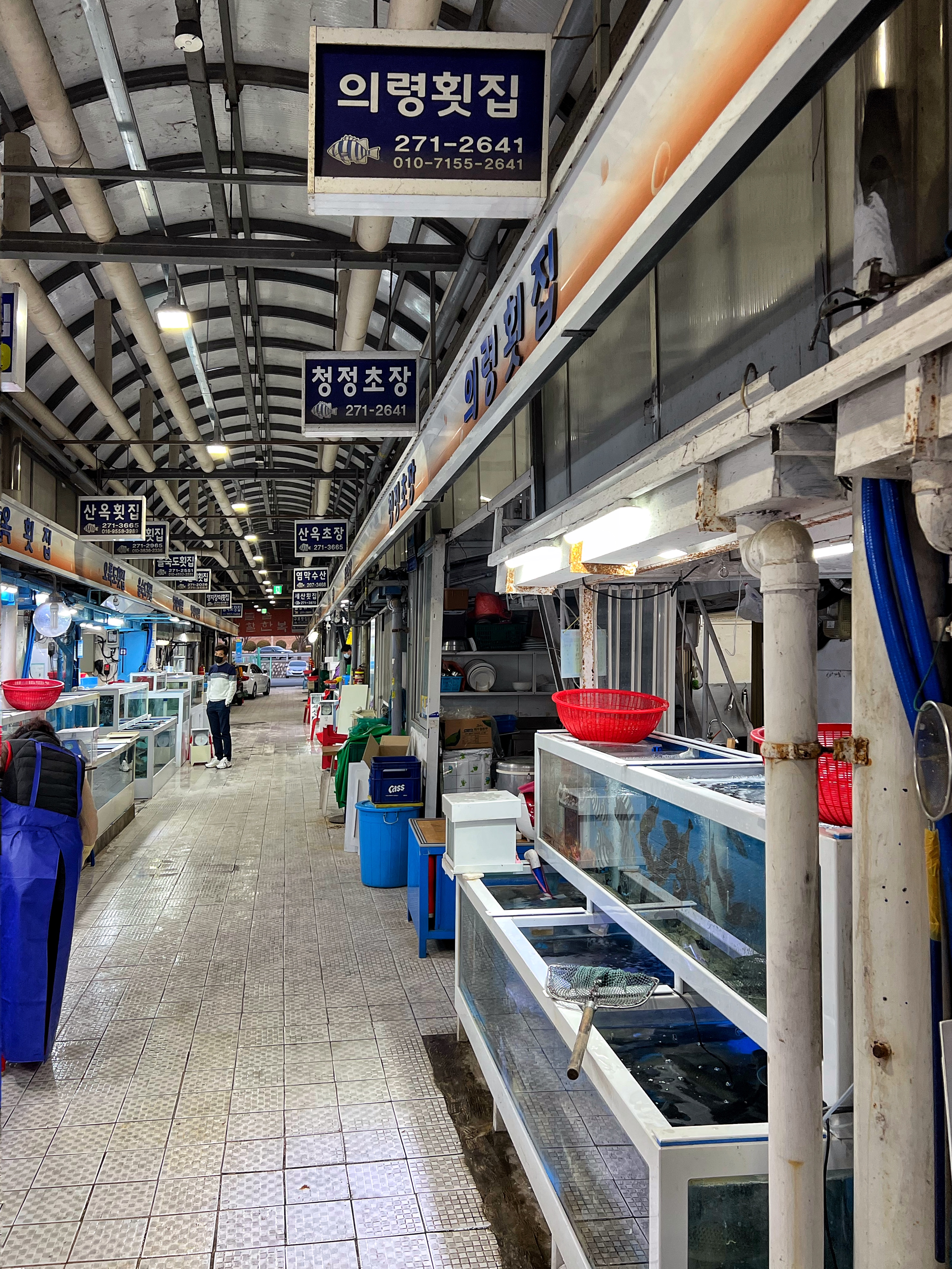 의령횟집에서 회를 고르고 안쪽에 있는 초장집에 자리를 잡으면 된다. 수조가 맑고 깨끗해서 마음에 든다.