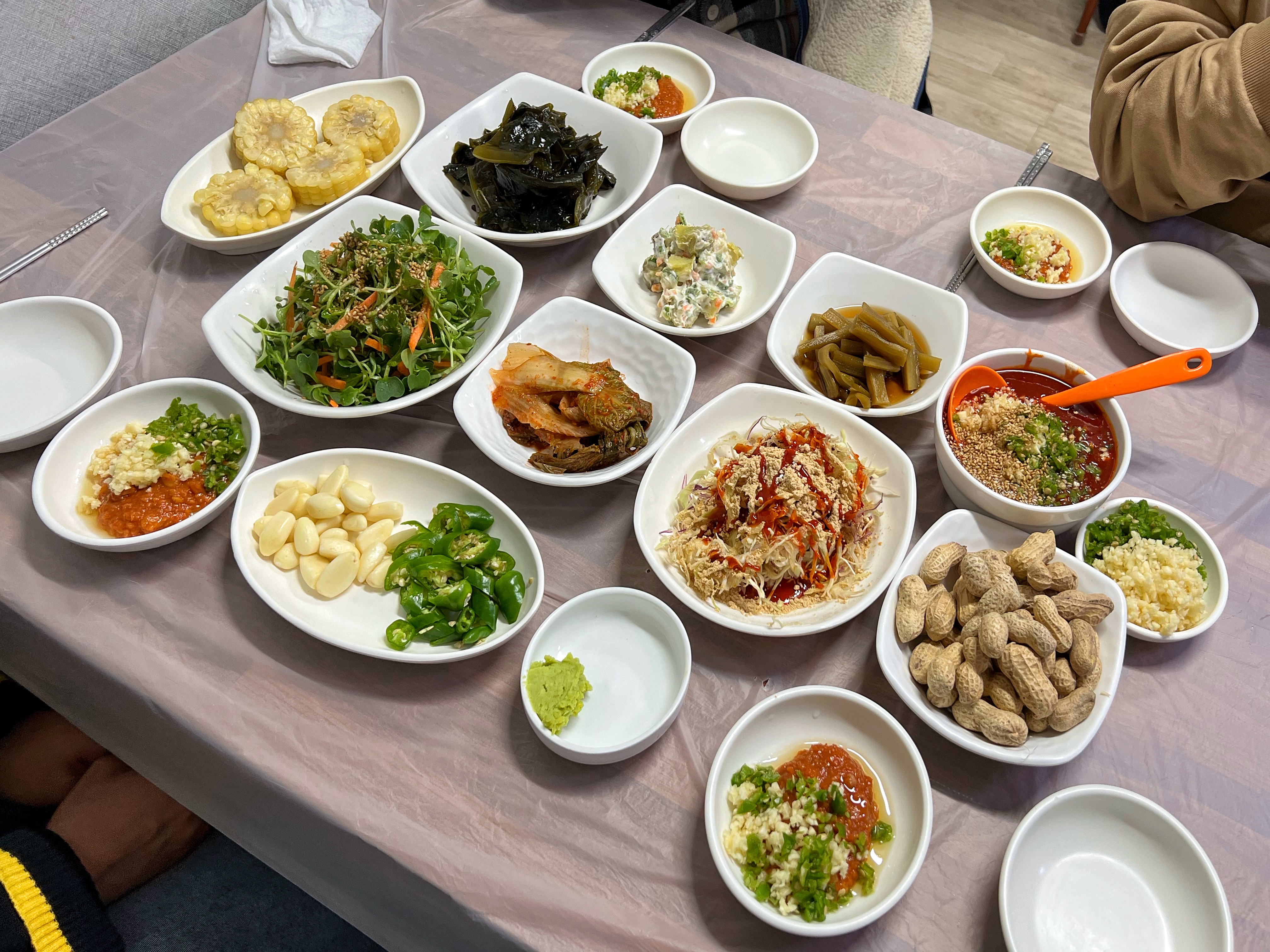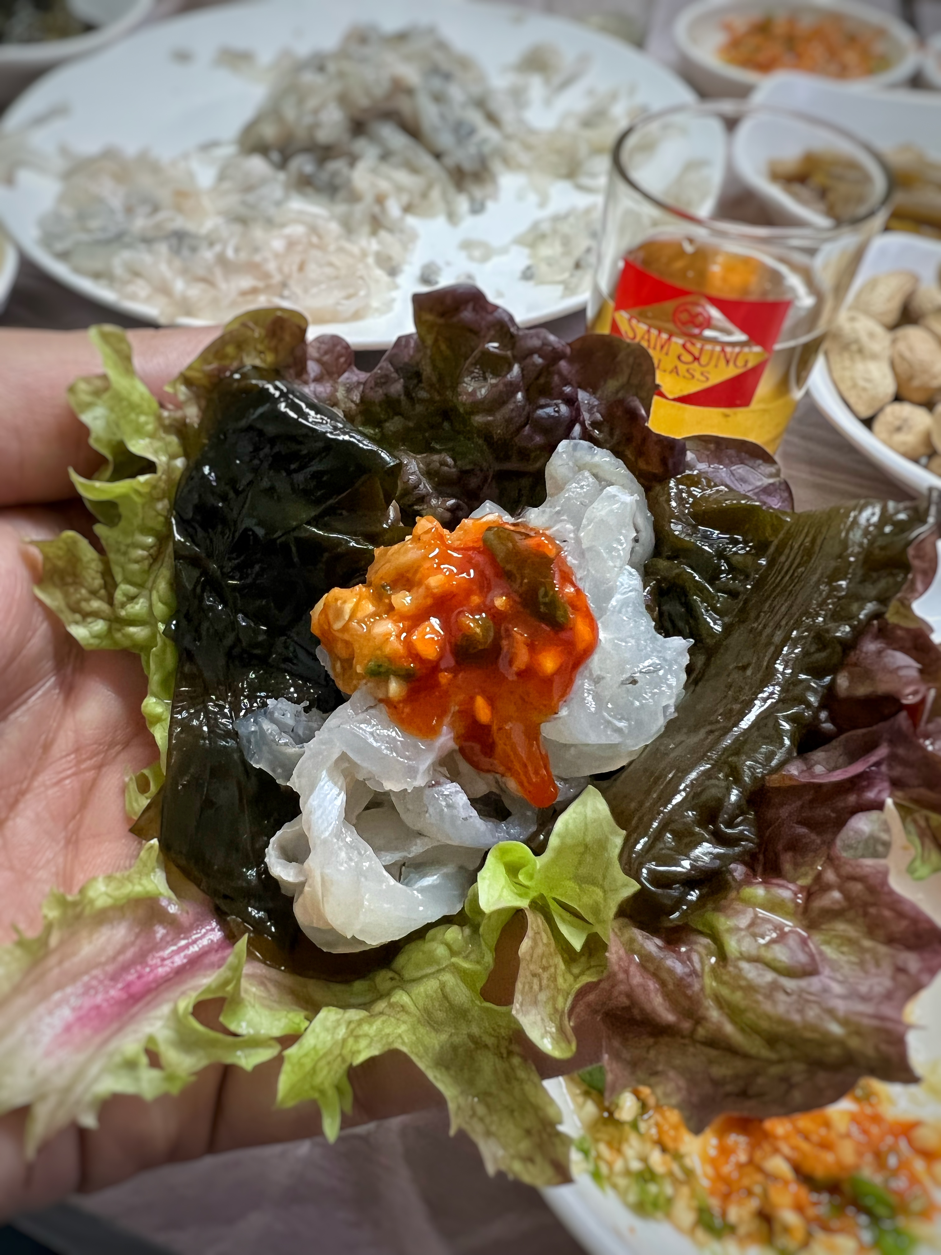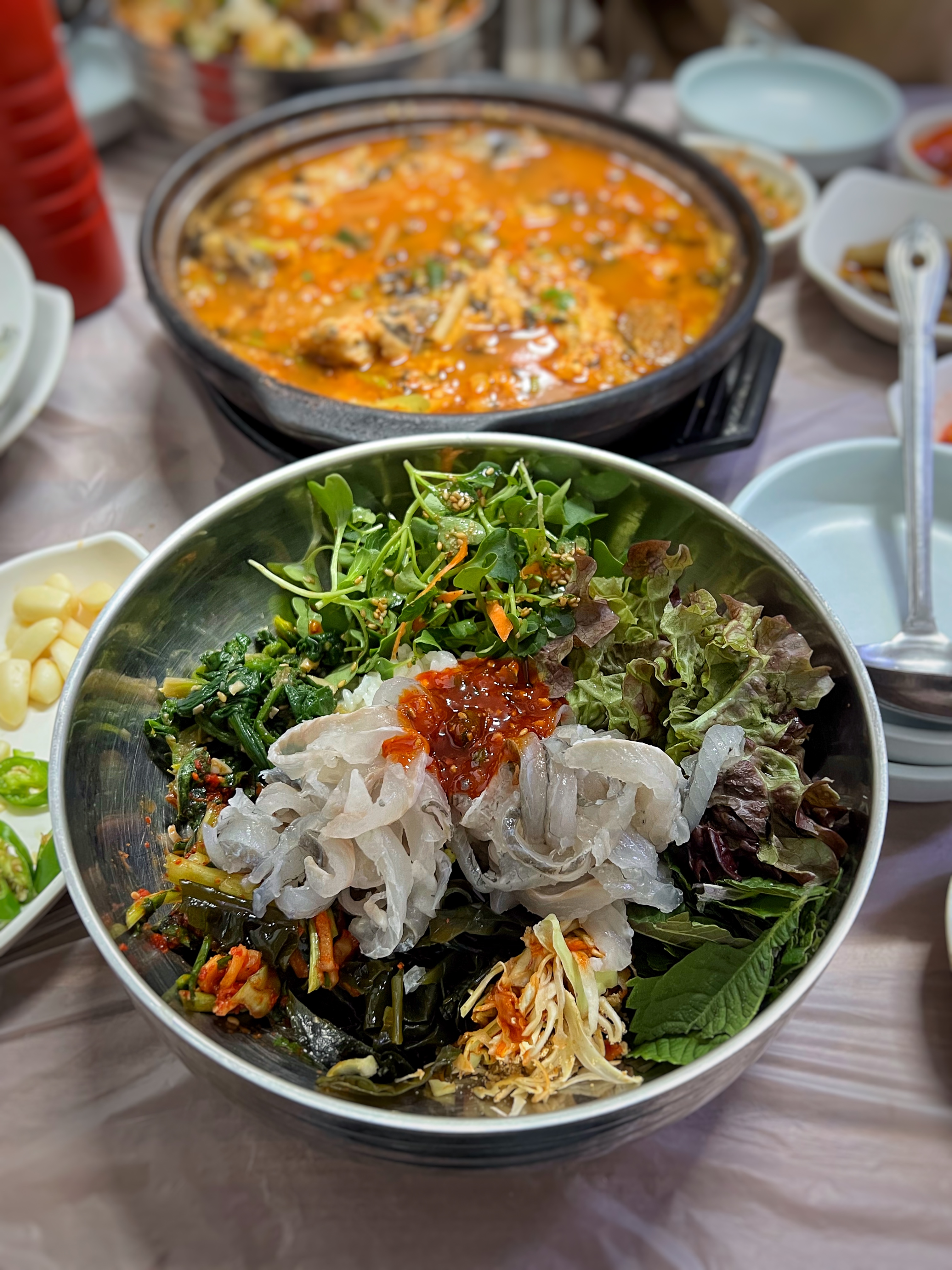 식사에 따라 나오는 나물과 남은 곁들임을 이것저것 넣고 회를 올리니 맛깔스럽다.
