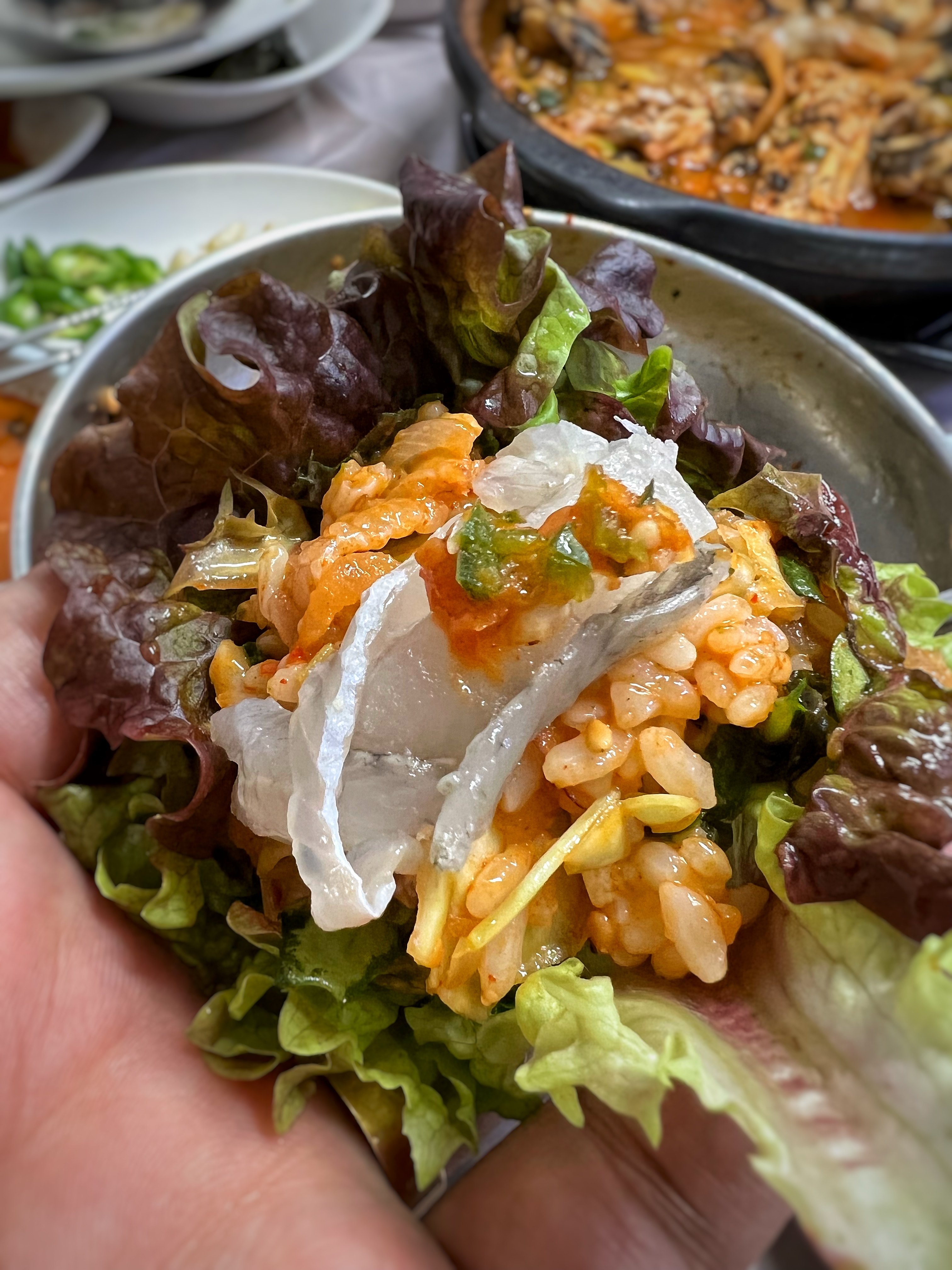 두어점 남은 도다리는 비빔밥 위에 올려서 쌈을 싸서 마무리 한다.