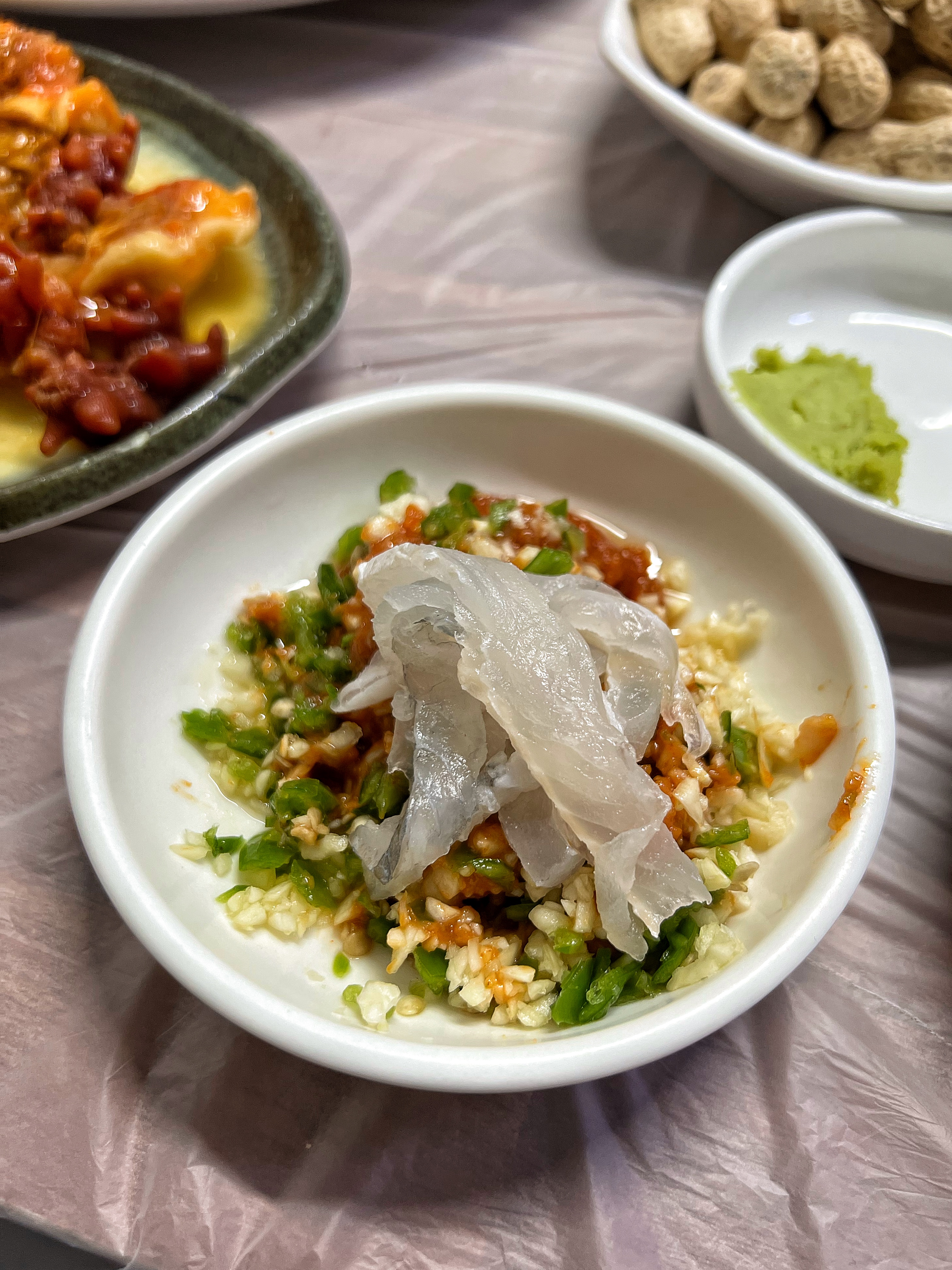 도다리는 뼈째로 반, 뼈를 제거하고 반으로 주문했다. 뼈째로 썰어서 내어주는 도다리는 문치가자미로 사이즈가 작다. 보다 사이즈가 큰 강도다리는 뼈를 제거해서 준다고 한다. 참고로 당시 가격은 강도다리 1kg 30,000원, 문치가자미 1kg 35,000원이었다. (2022.03.05 기준)