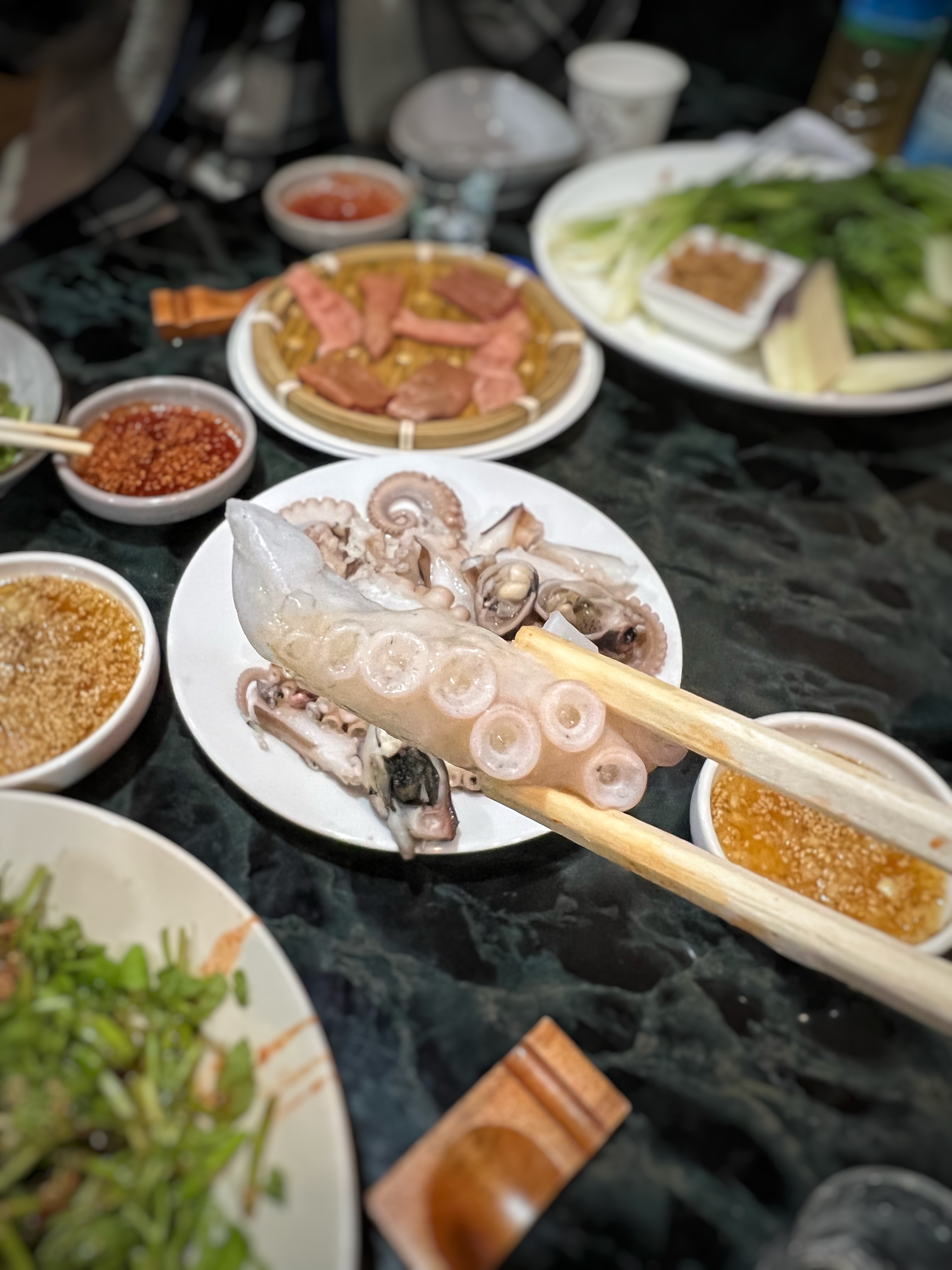 주꾸미도 야들야들 하게 잘 삶겼다. 참기름향 진한 이 집 기름장에 콕 찍어 먹으면 주꾸미숙회도 문어숙회도 맛이 없을 수 없다.