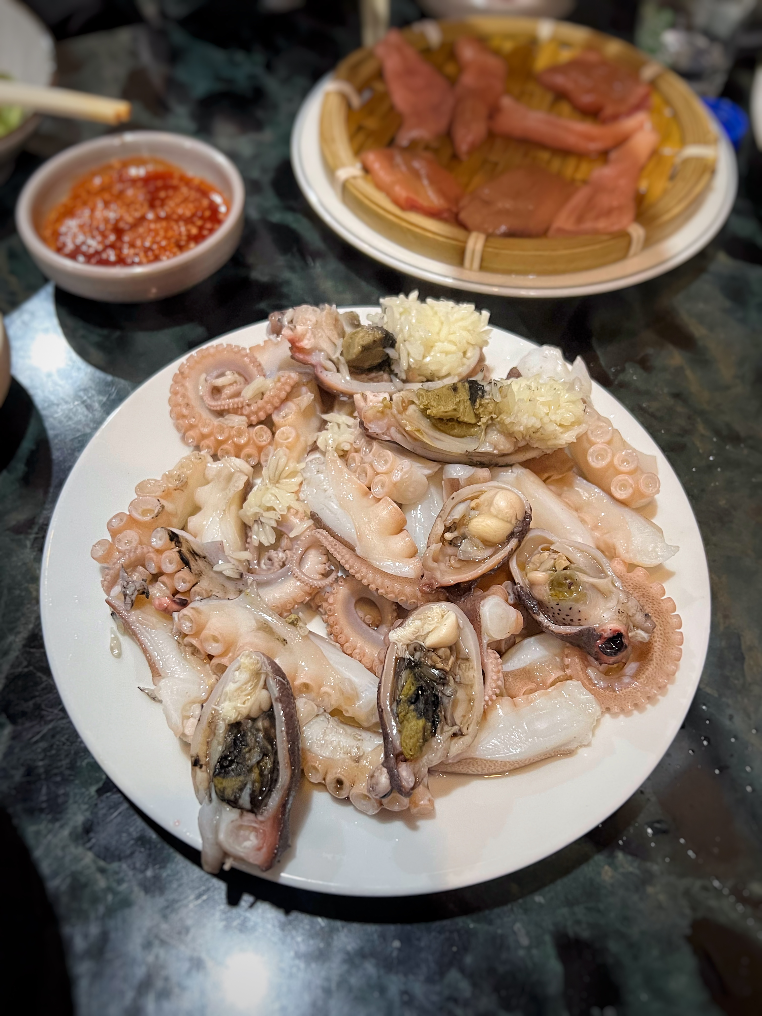 개불을 먹으면서 추가안주를 고민하다가 가능한 메뉴를 물어보니, 알찬 주꾸미가 있다고 한다. 생물 주꾸미는 올해 처음이니 한 접시 부탁드렸다. 사진을 찍기도 전에 알이 찬 몸통을 일행들 입에 하나씩 너어준다. 그래서 사진에 담긴 몸통은 몇 없다.